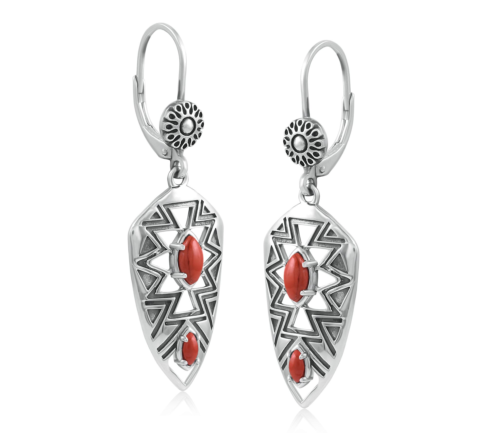 These sterling silver dangle earrings showcase vibrant marquise-cut cabochons highlighted by intricate etched patterns. The oxidized finish and concha-style lever backs add Southwestern flair, making them a stylish accent whether you're dressing for a weekend market stroll or adding character to your weekday look. From American West Jewelry.
