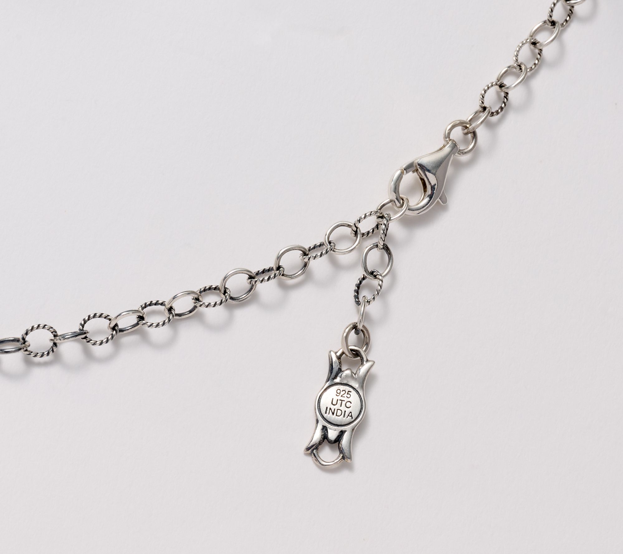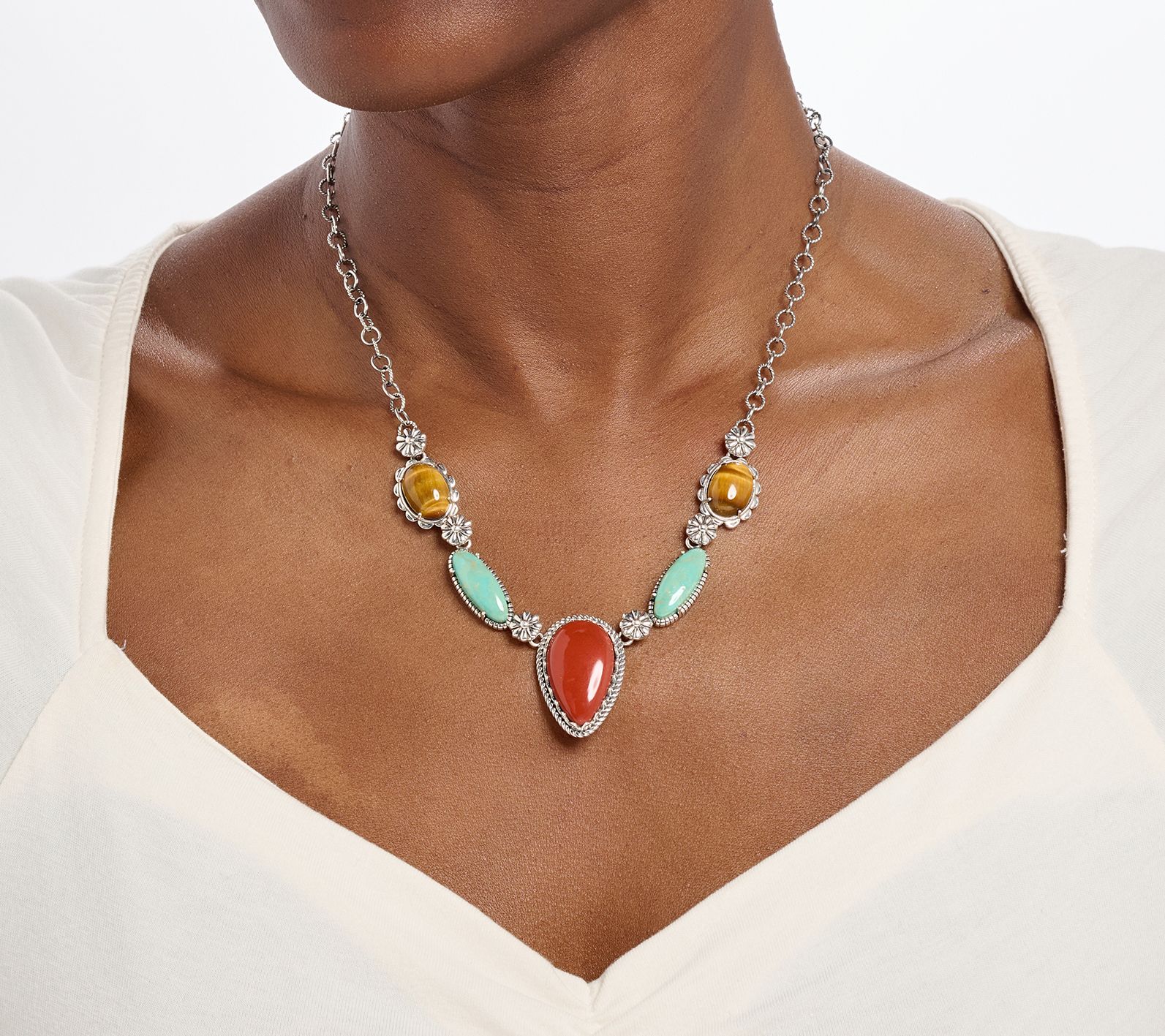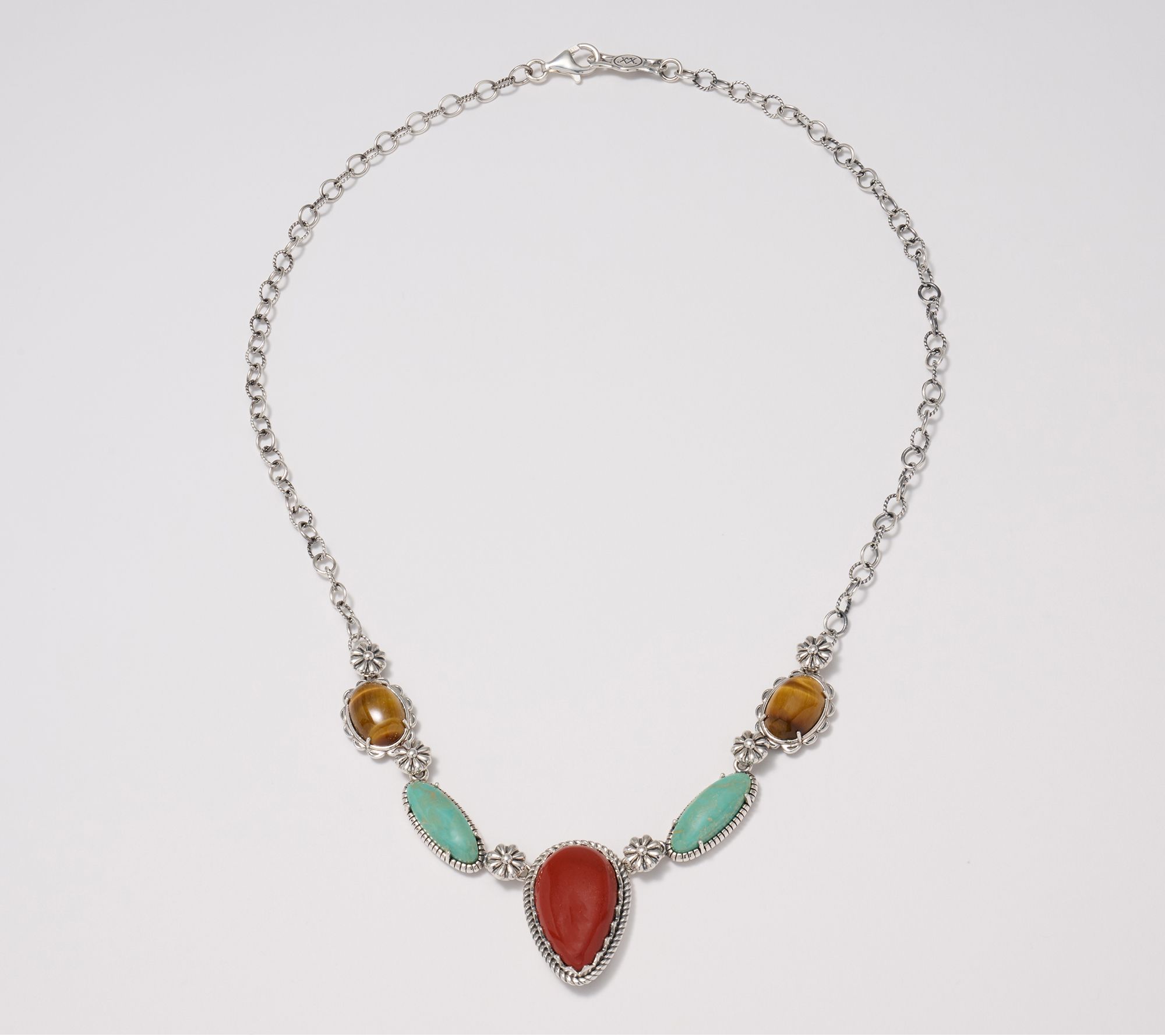 Pear-shaped red jasper cabochon in serrated bezel; two elongated, oval, green turquoise cabochons; two oval tiger's-eye cabochons; concha flower accents; oval textured and polished link chain; oxidized finish; logo tag