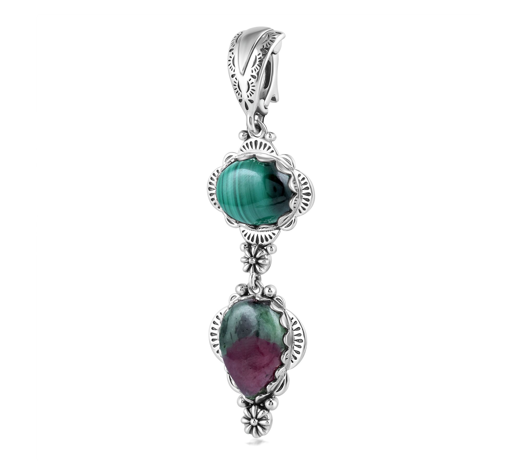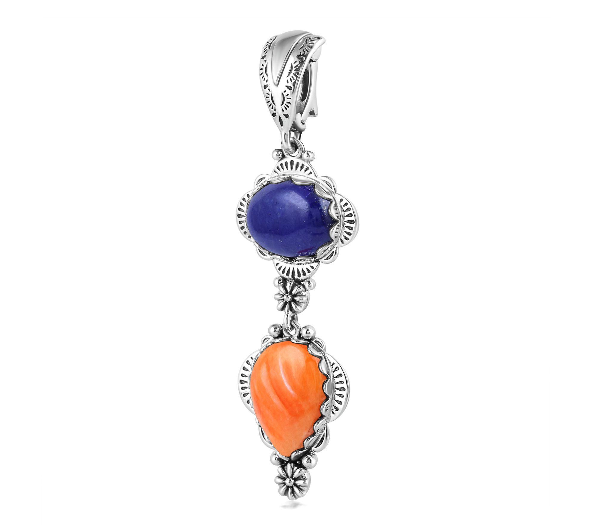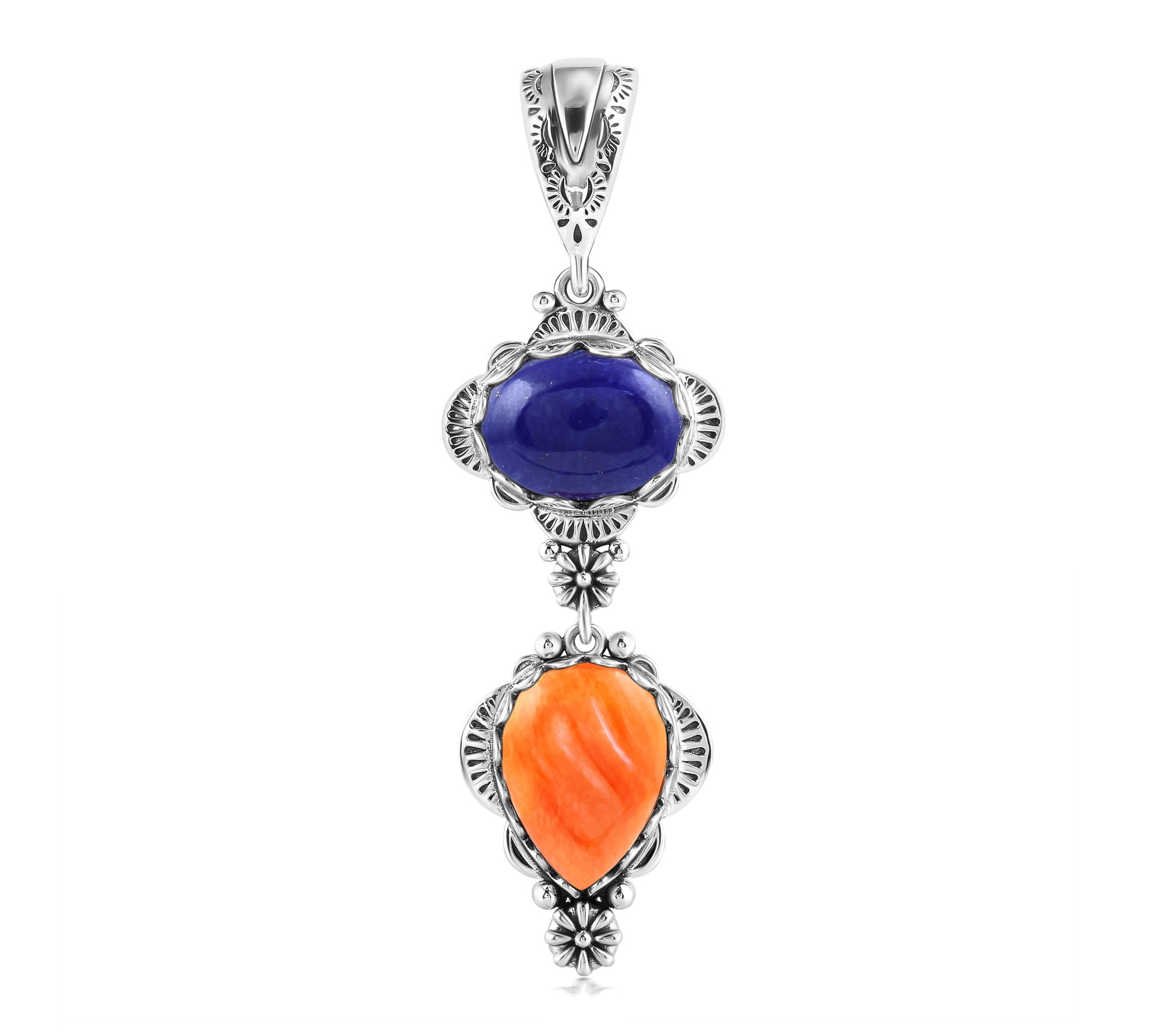 Shining with vibrant color and artful detail, this sterling silver linear enhancer brings the beauty of gemstone cabochons and floral accents to any look. The etched, snap-hinge bail makes it easy to add to your favorite chain or cord, while the oval and pear shapes evoke Southwestern charm on days out or special evenings. From American West Jewelry.