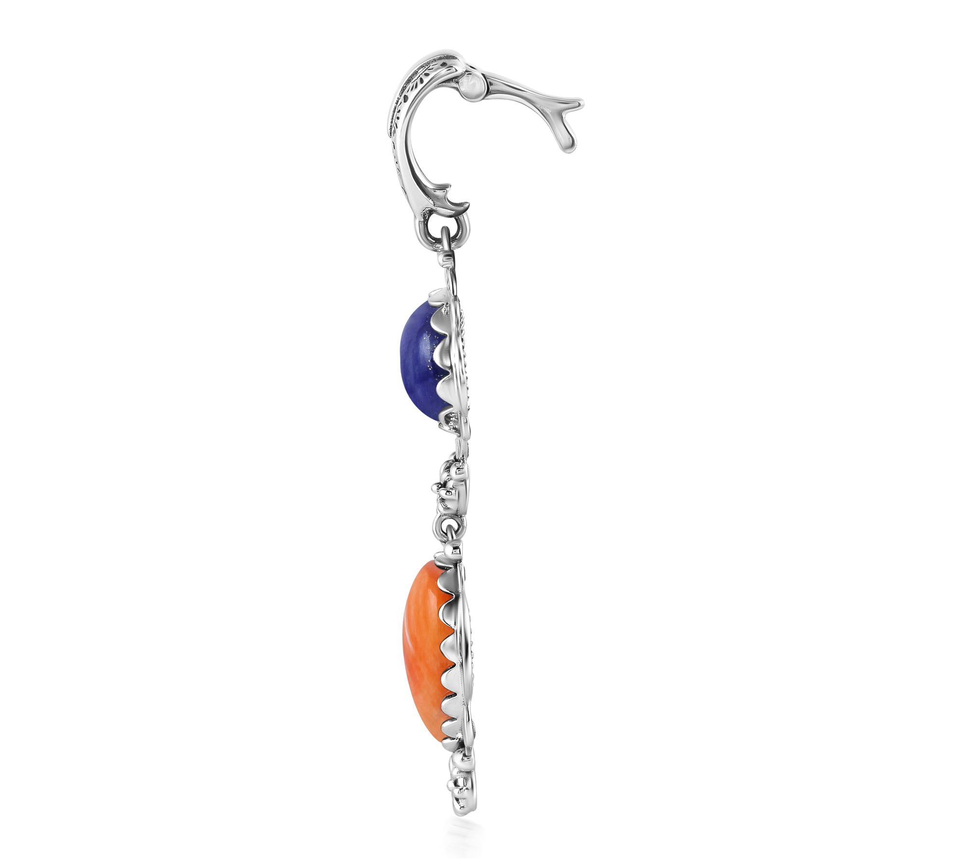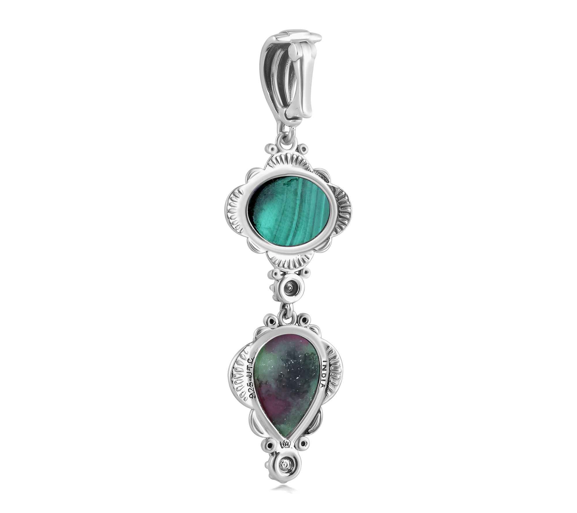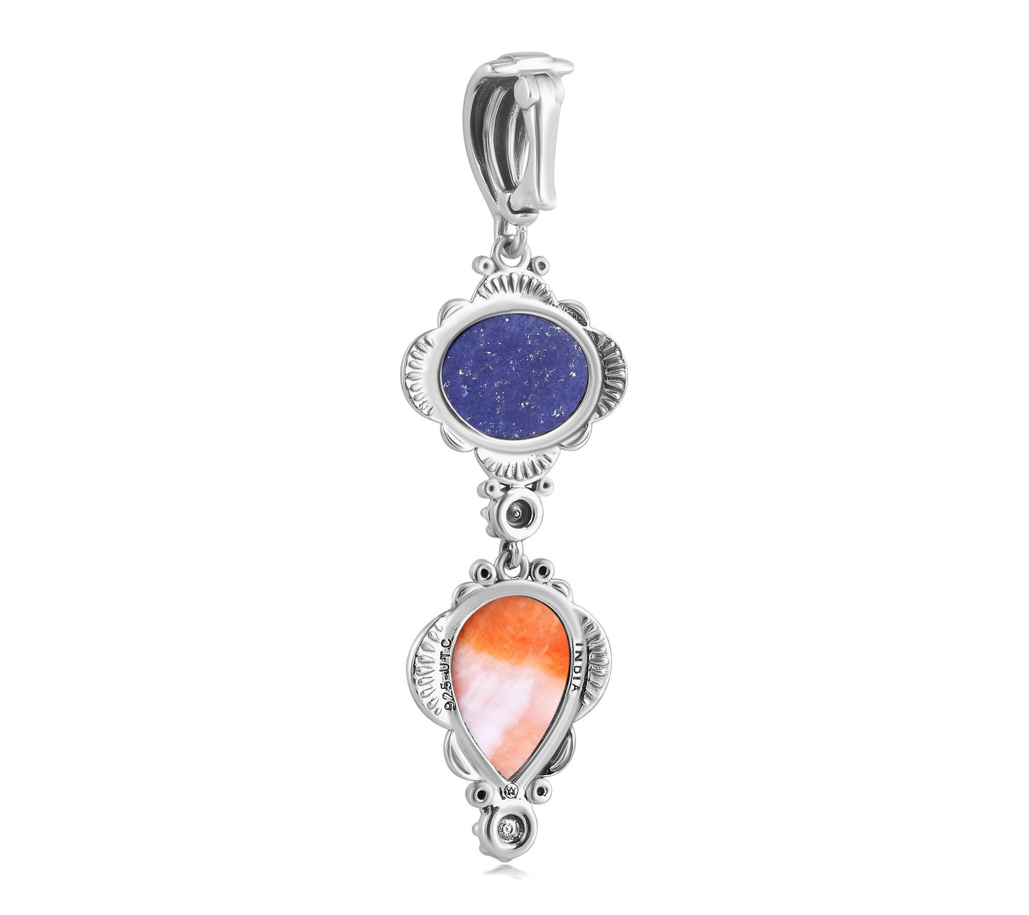 Shining with vibrant color and artful detail, this sterling silver linear enhancer brings the beauty of gemstone cabochons and floral accents to any look. The etched, snap-hinge bail makes it easy to add to your favorite chain or cord, while the oval and pear shapes evoke Southwestern charm on days out or special evenings. From American West Jewelry.