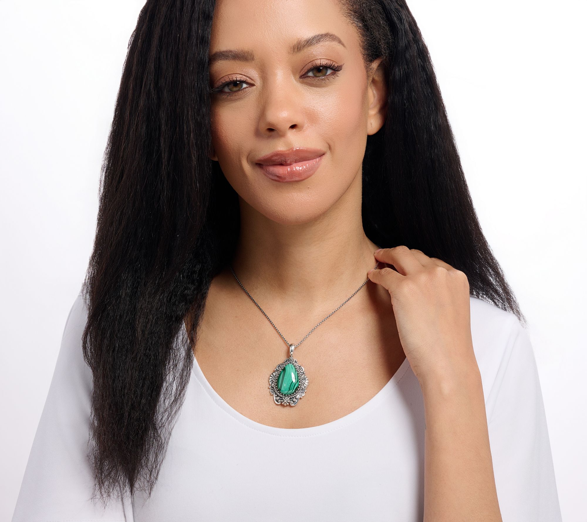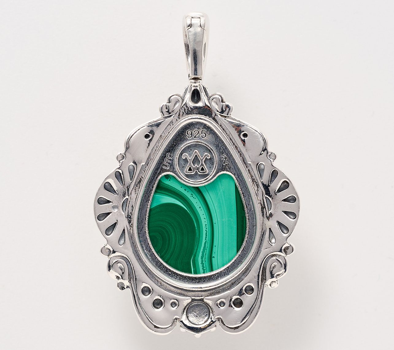 Pear-shaped gemstone cabochon center; serrated bezel; concha, rope, swirl, and scallop motifs; oxidized finish; snap hinge bail fits most chains and cords