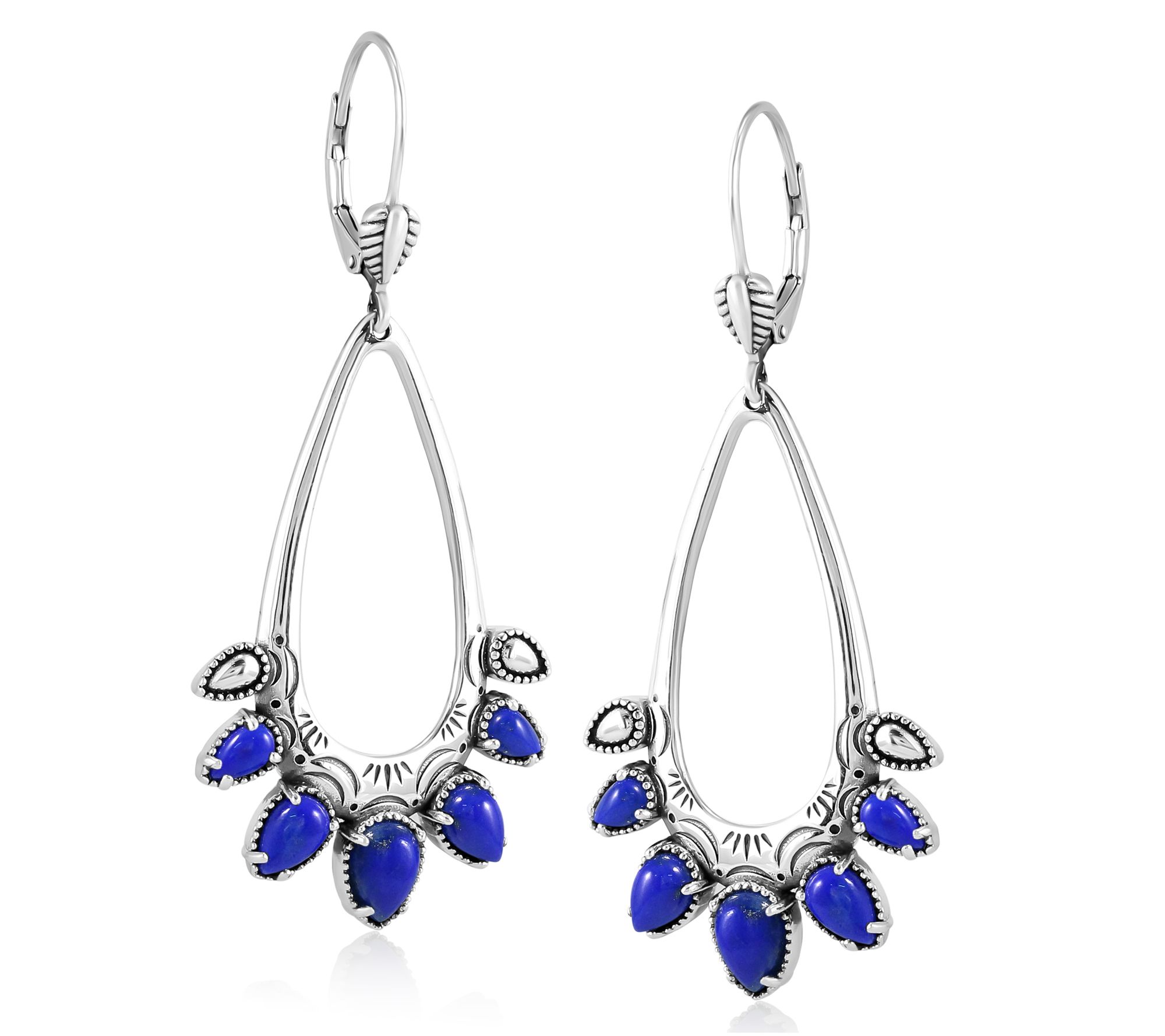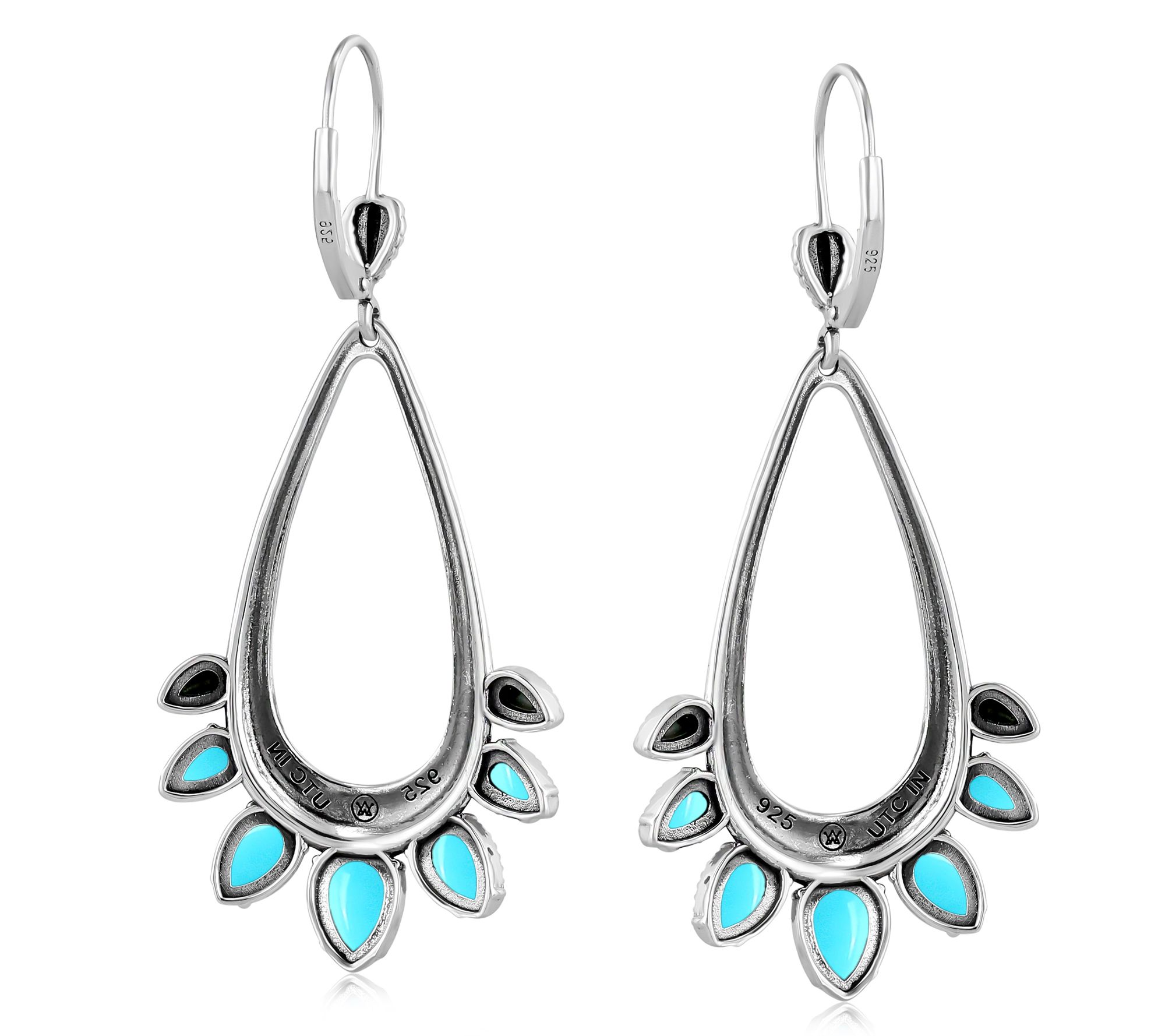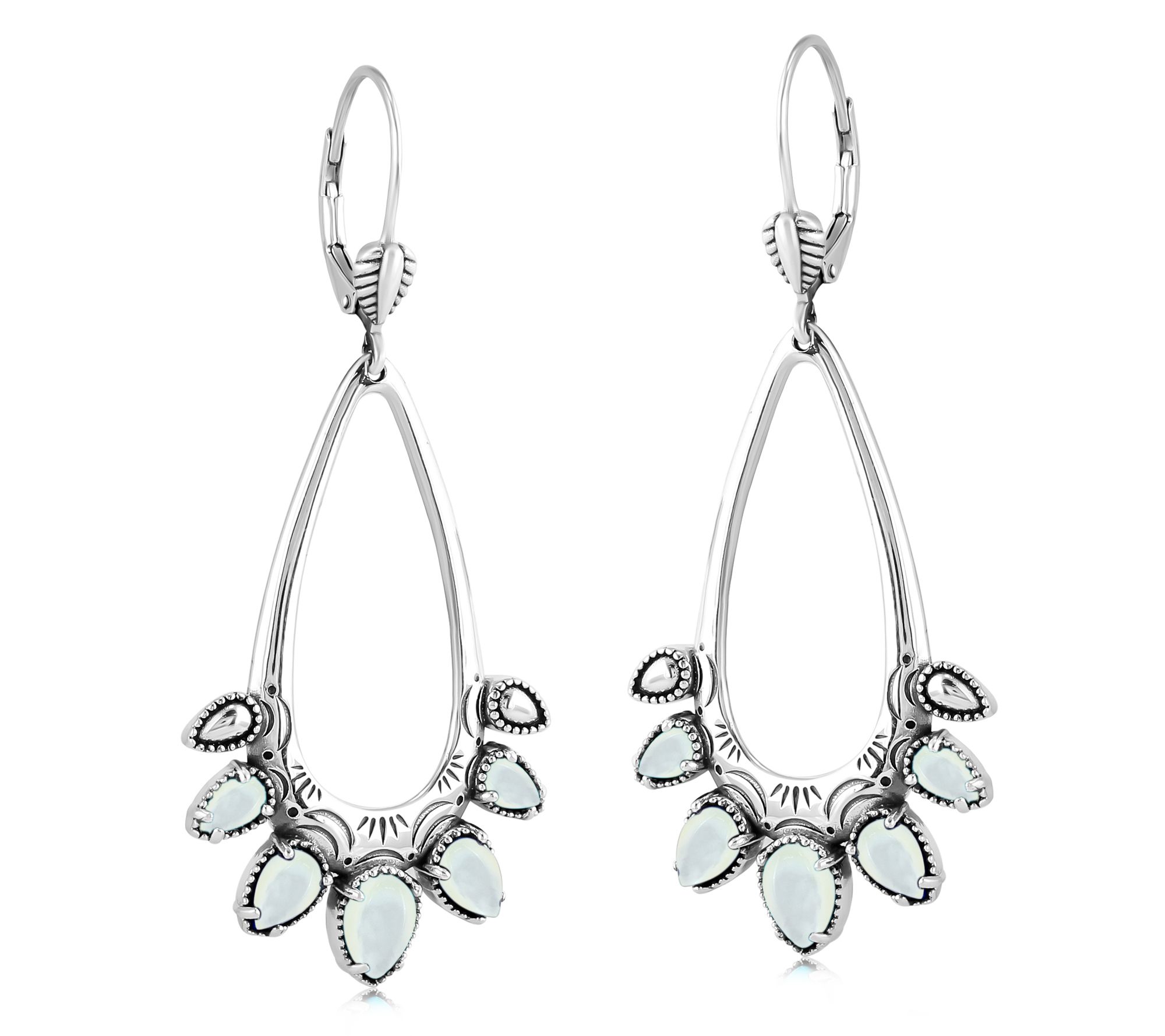 Open oval-shaped dangle; pear-shaped gemstones and pear-shaped designs; oxidized finish
