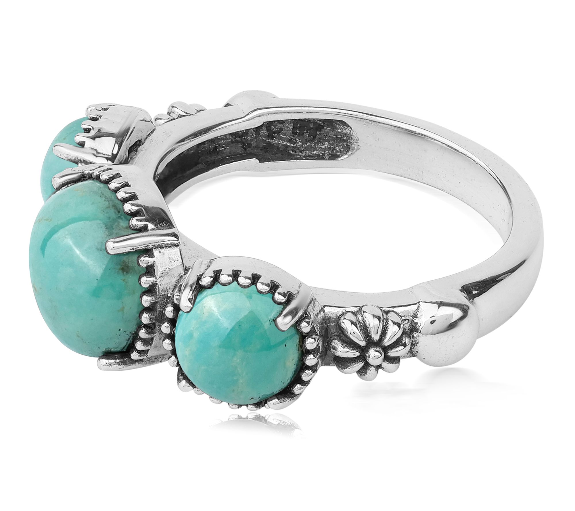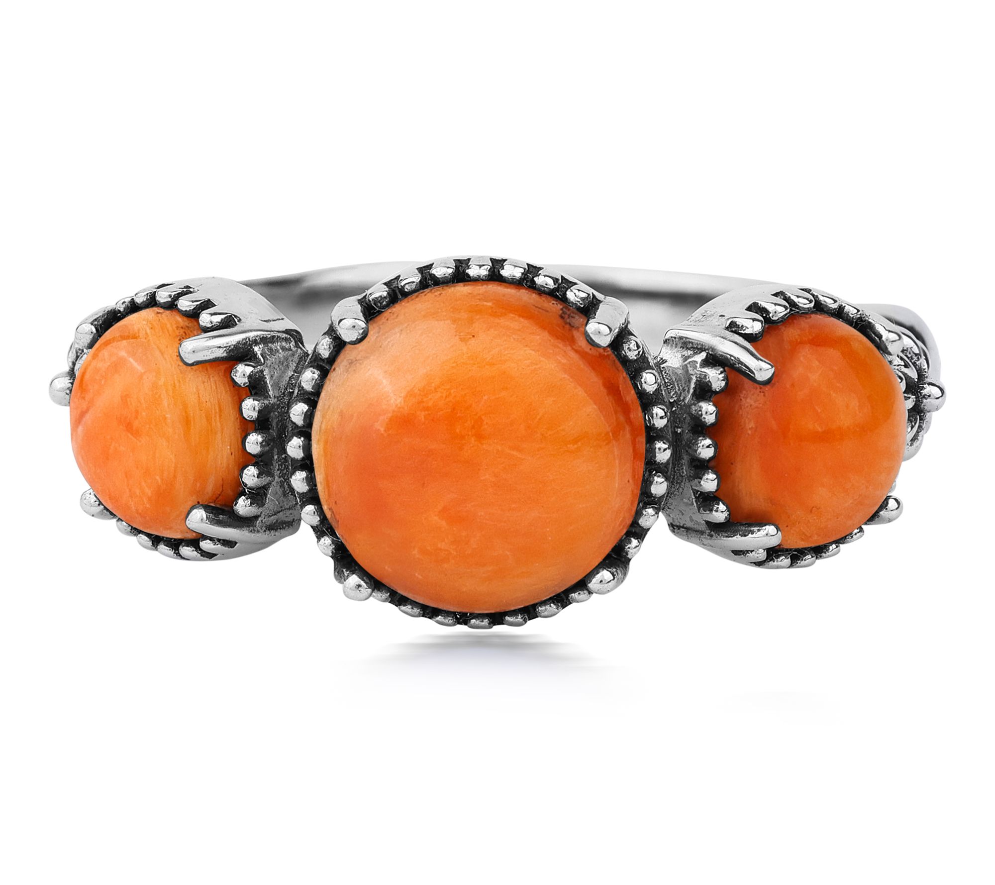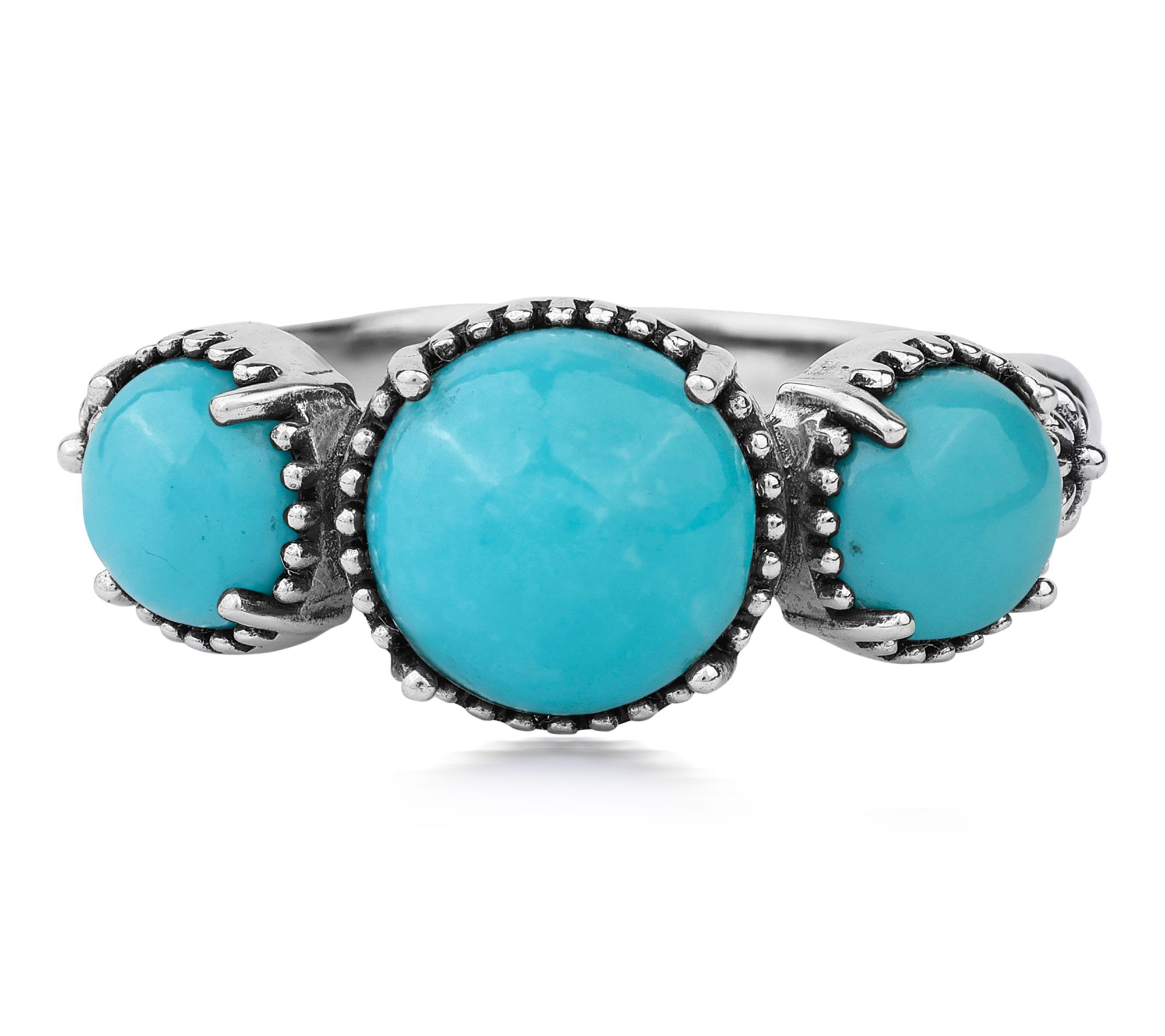 • Round, prong-set gemstones in a concha-style setting with detailed oxidized accents; polished finish
