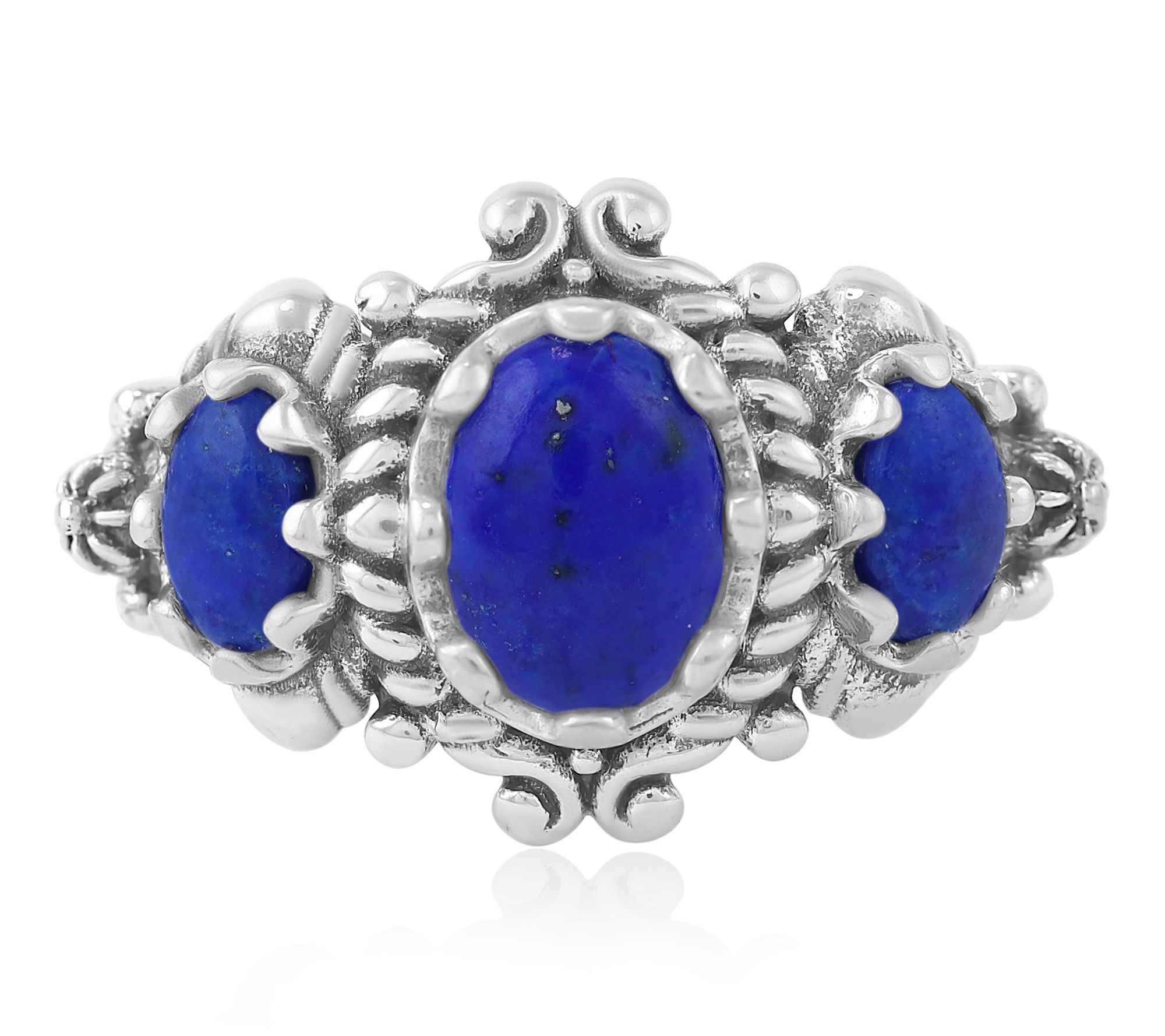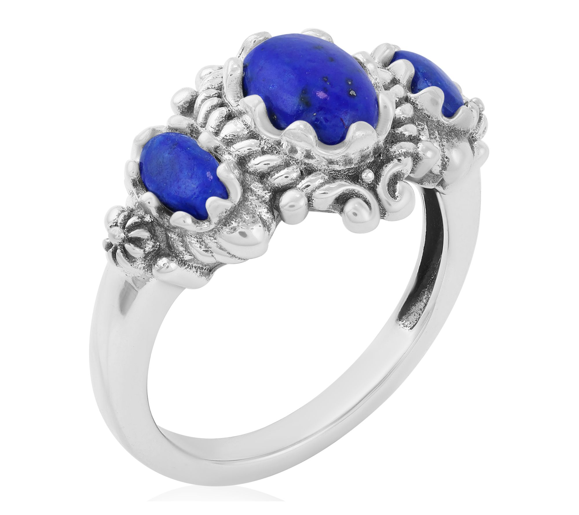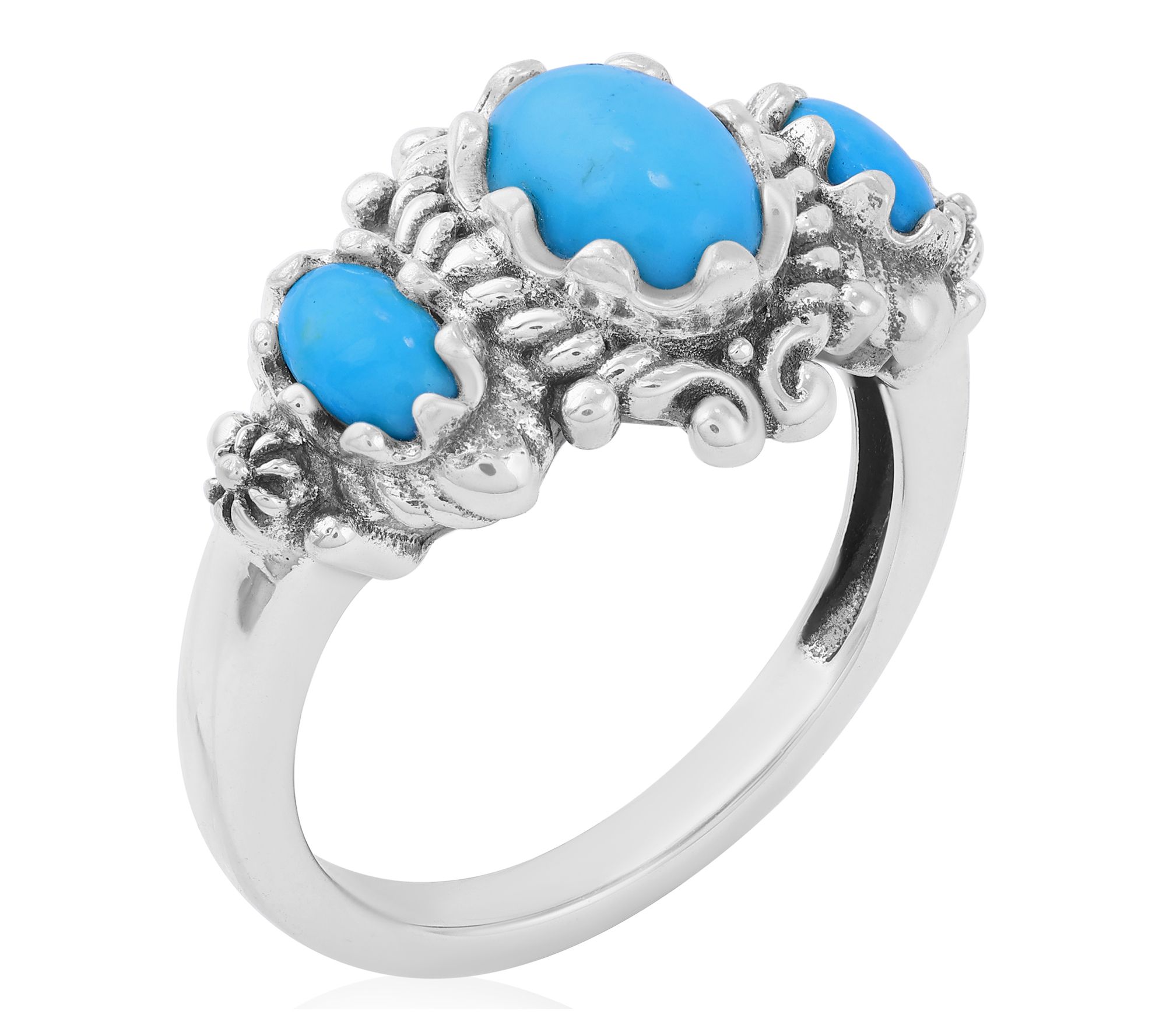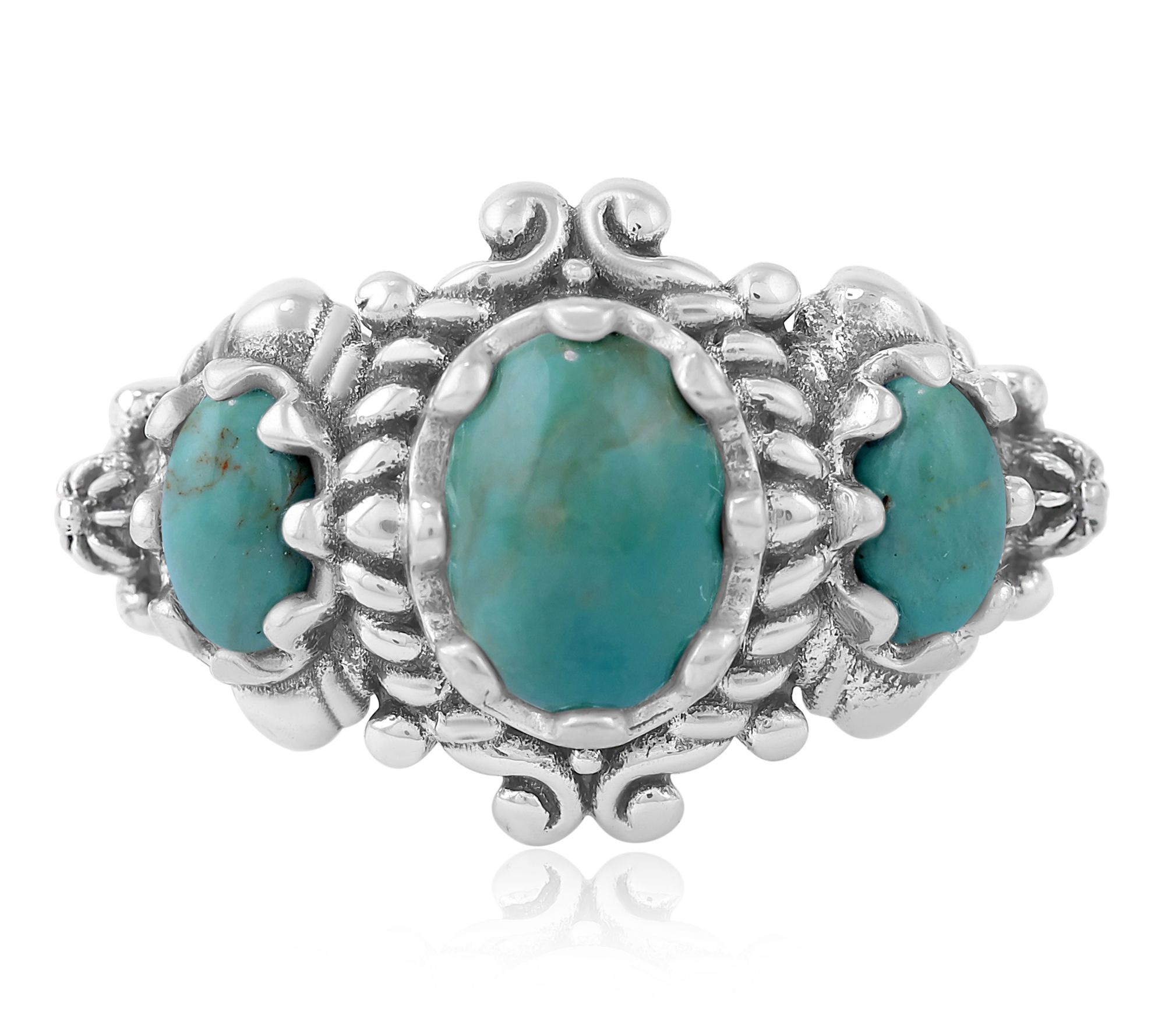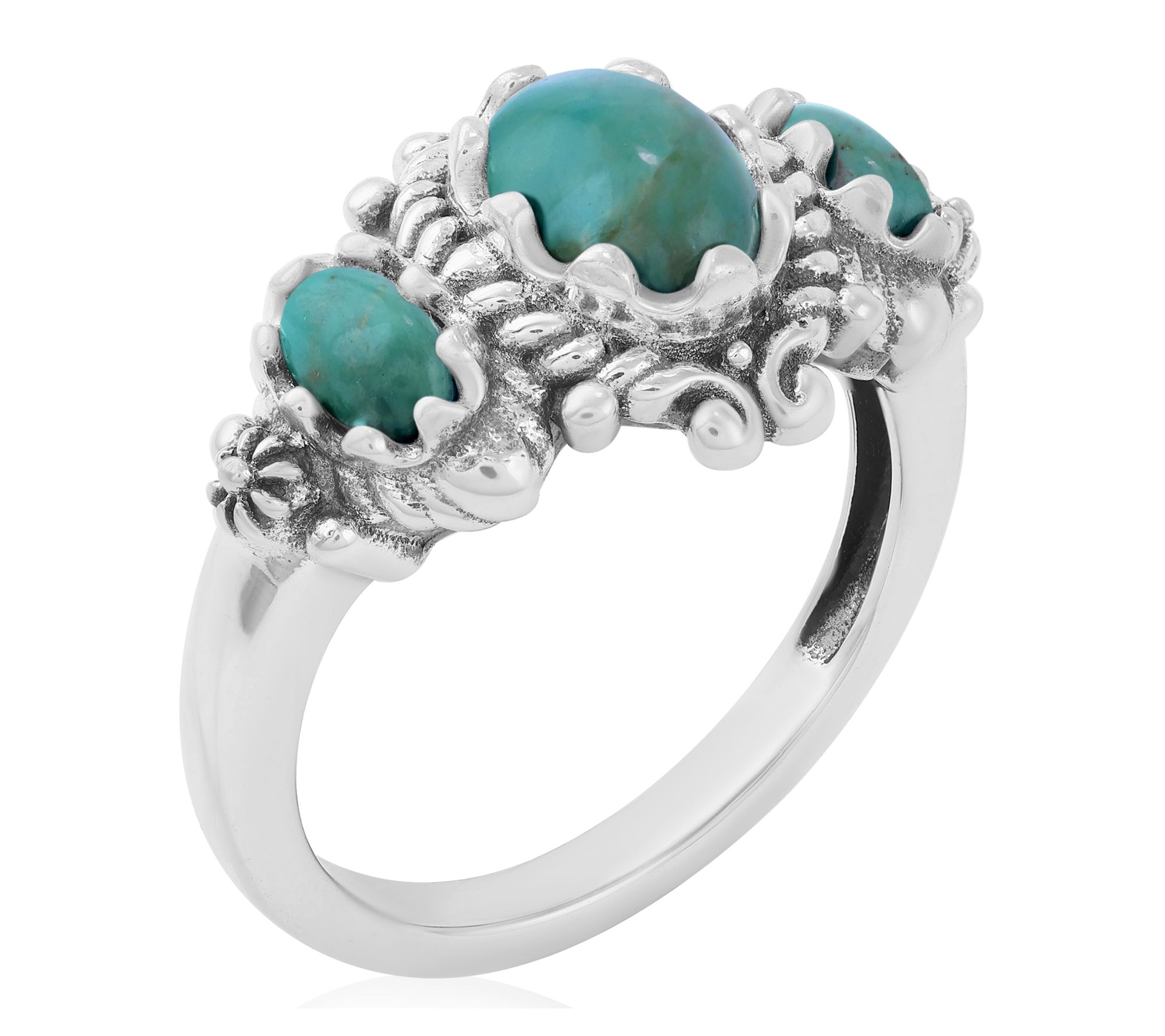 Whether you're dressing up for a special dinner or adding a splash of color to everyday outfits, this sterling silver ring captures attention with its trio of vibrant oval cabochons. Intricate rope and concha details bring a distinct Southwestern flair to your jewelry collection, making it an eye-catching accessory for any look. From the American West Jewelry Collection.