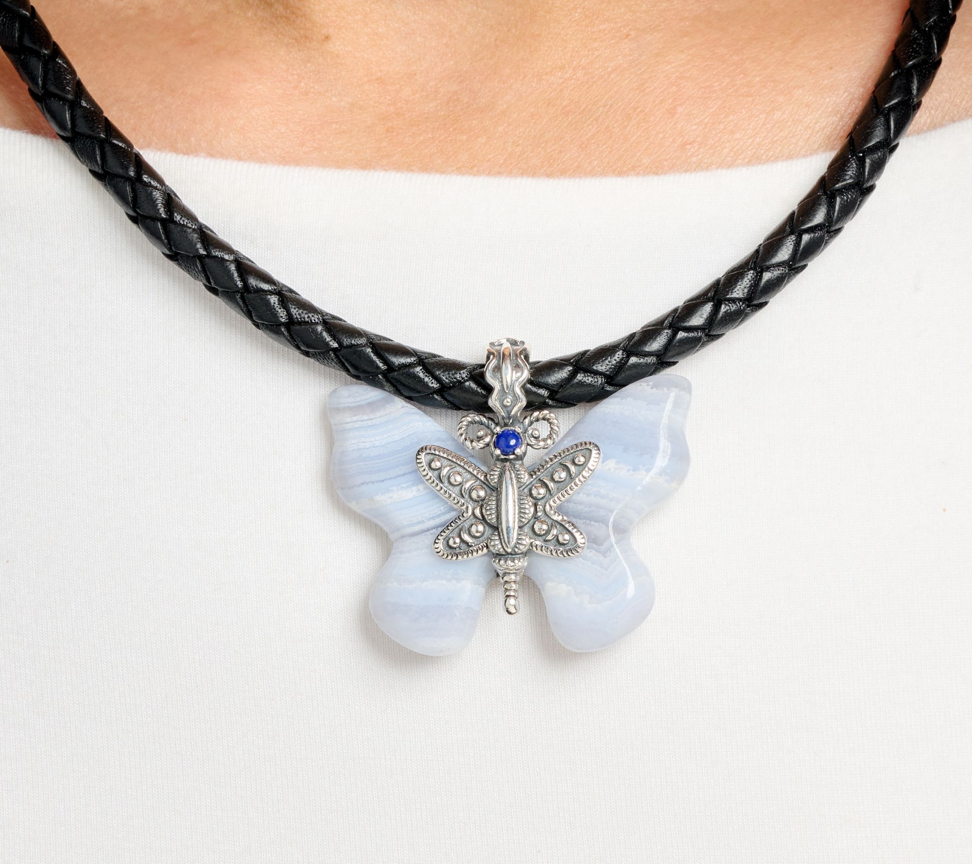 Let your style take flight with this butterfly pendant, beautifully carved from blue lace agate and accented by a sterling silver overlay with a lapis cabochon at its heart. The meaningful messaging engraving on the back adds a personal touch, while the snap-hinge bail easily connects to your favorite chain or cord. From American West Jewelry.