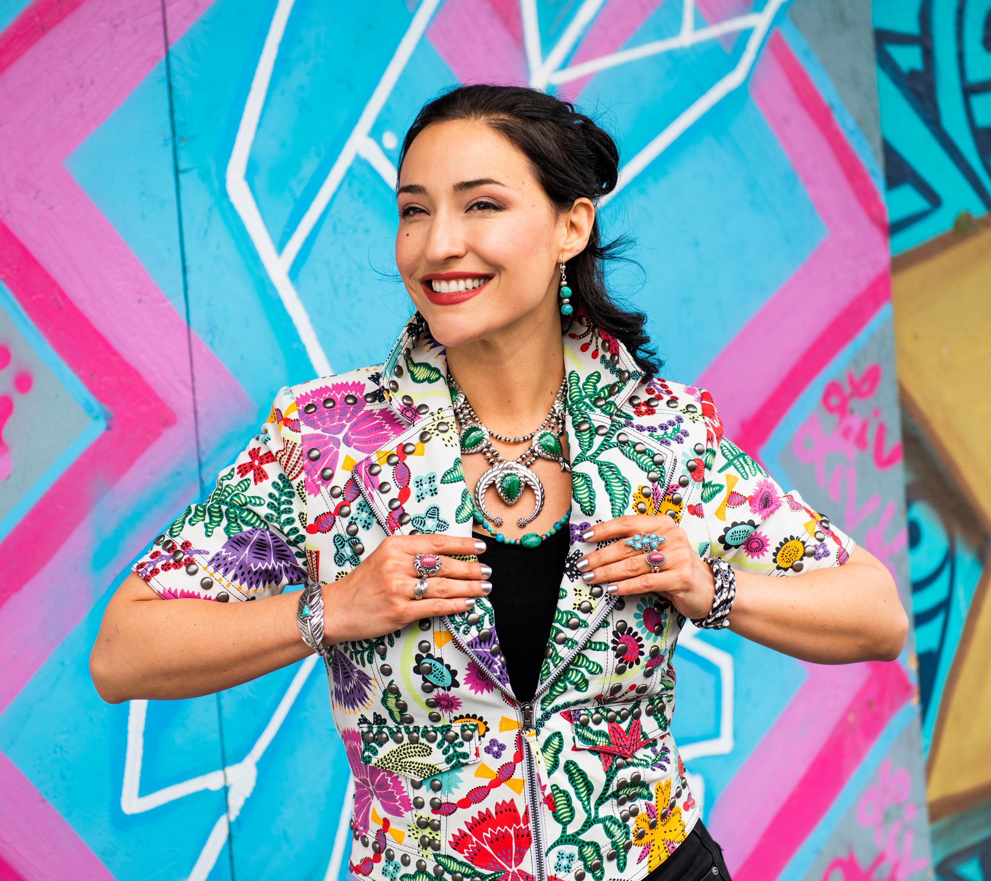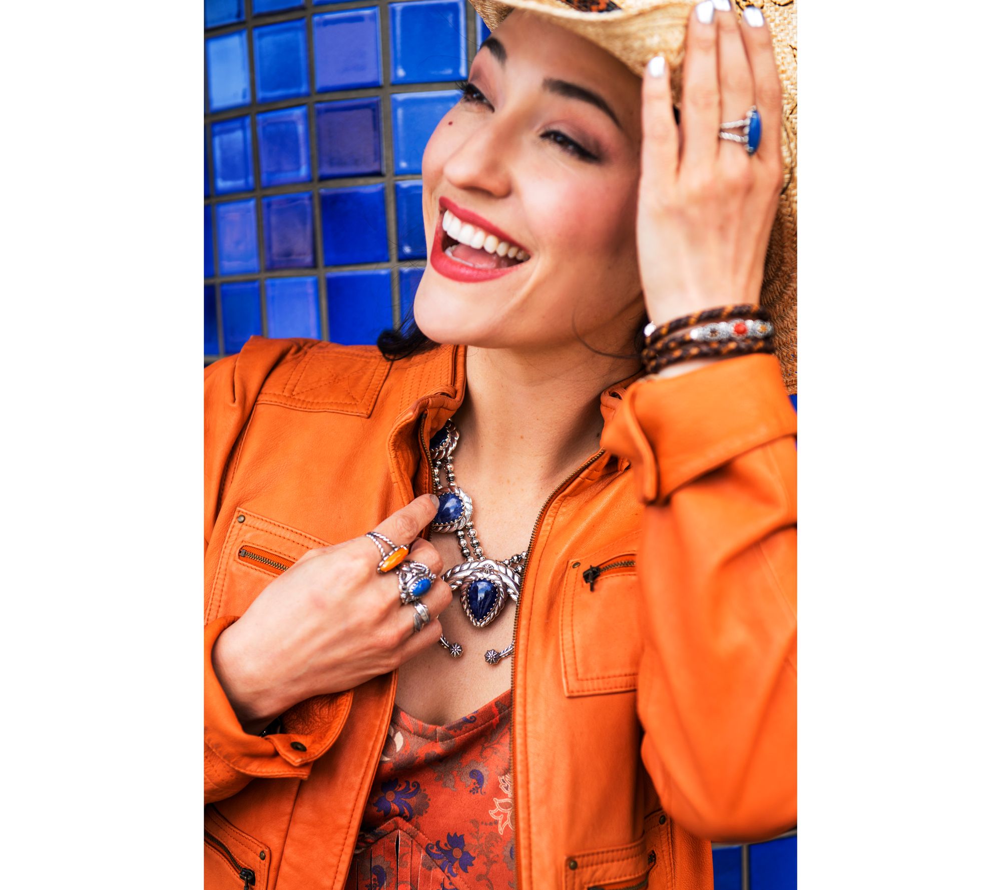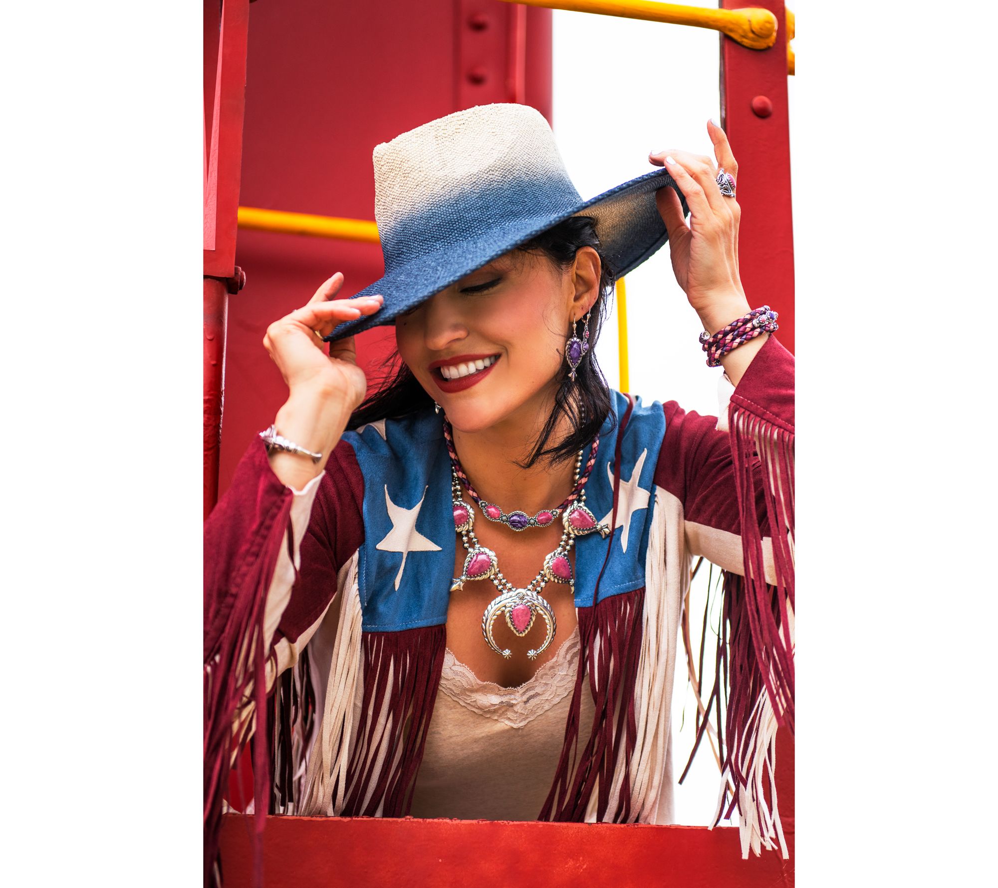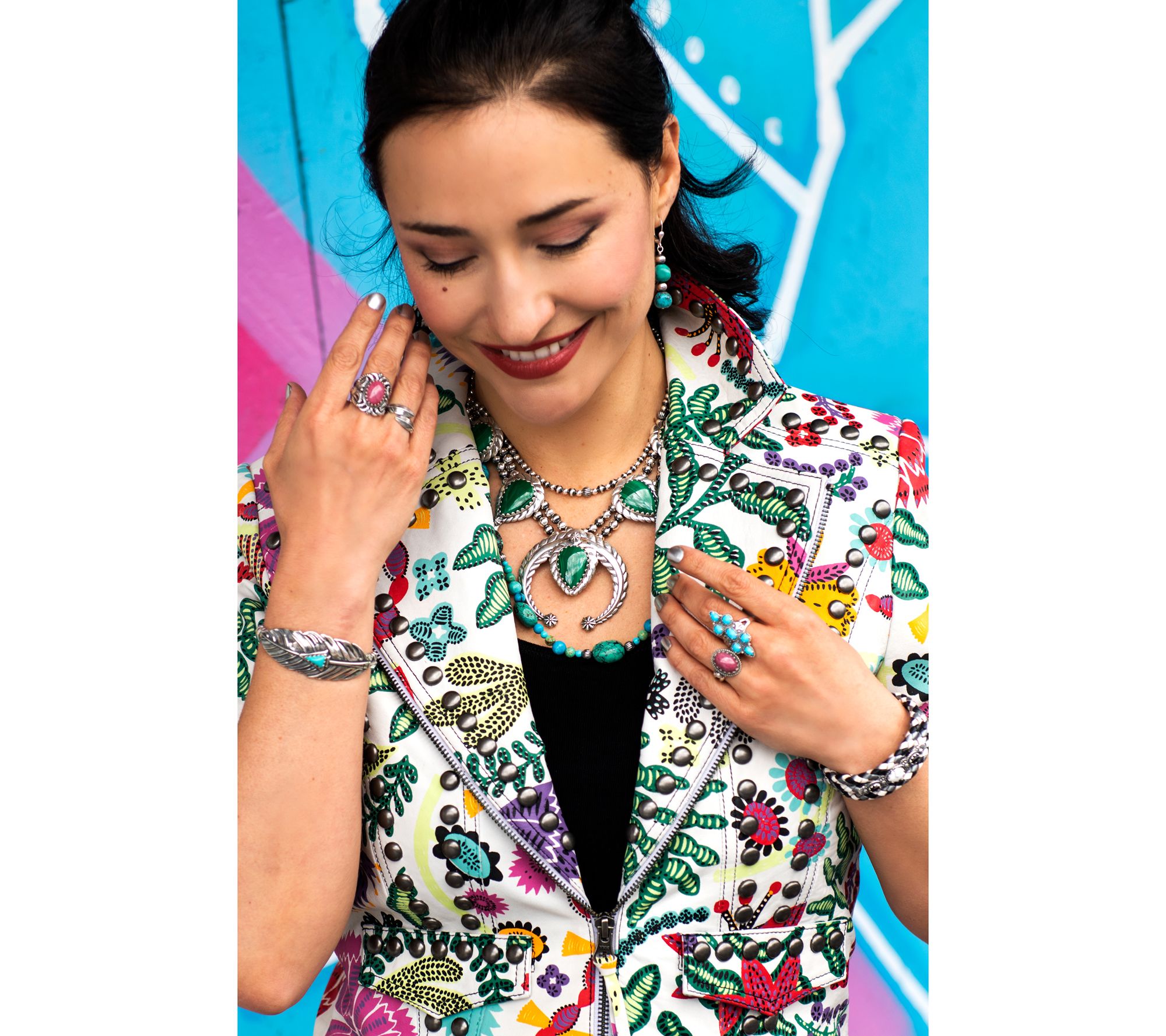 Make a statement with this stunning necklace, complete with a squash blossom design and striking pear-cut cabochons. From American West Jewelry.