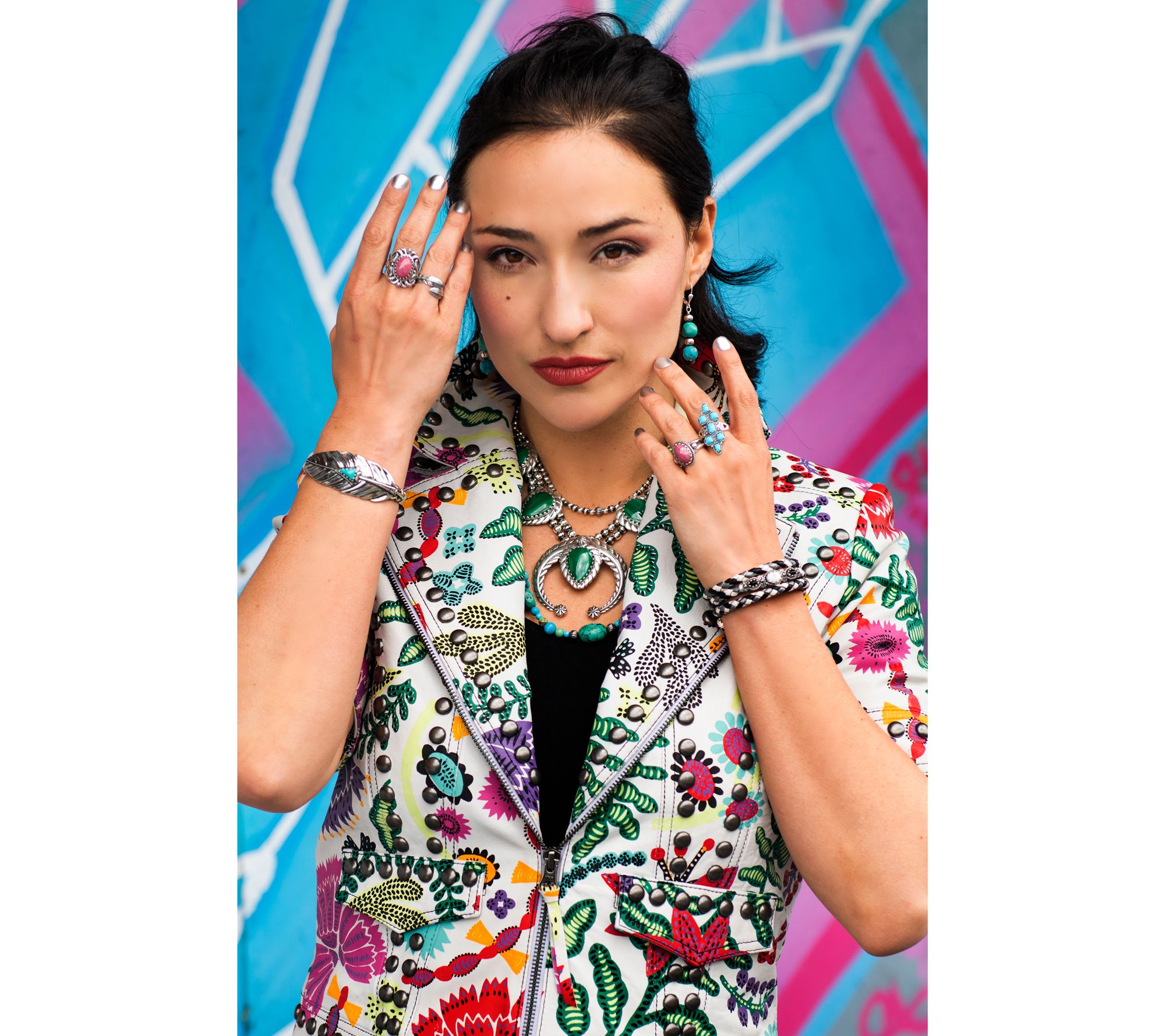 • Four pear-cut cabochon; center naja-design gemstone; front double row graduates to single row; squash blossom design