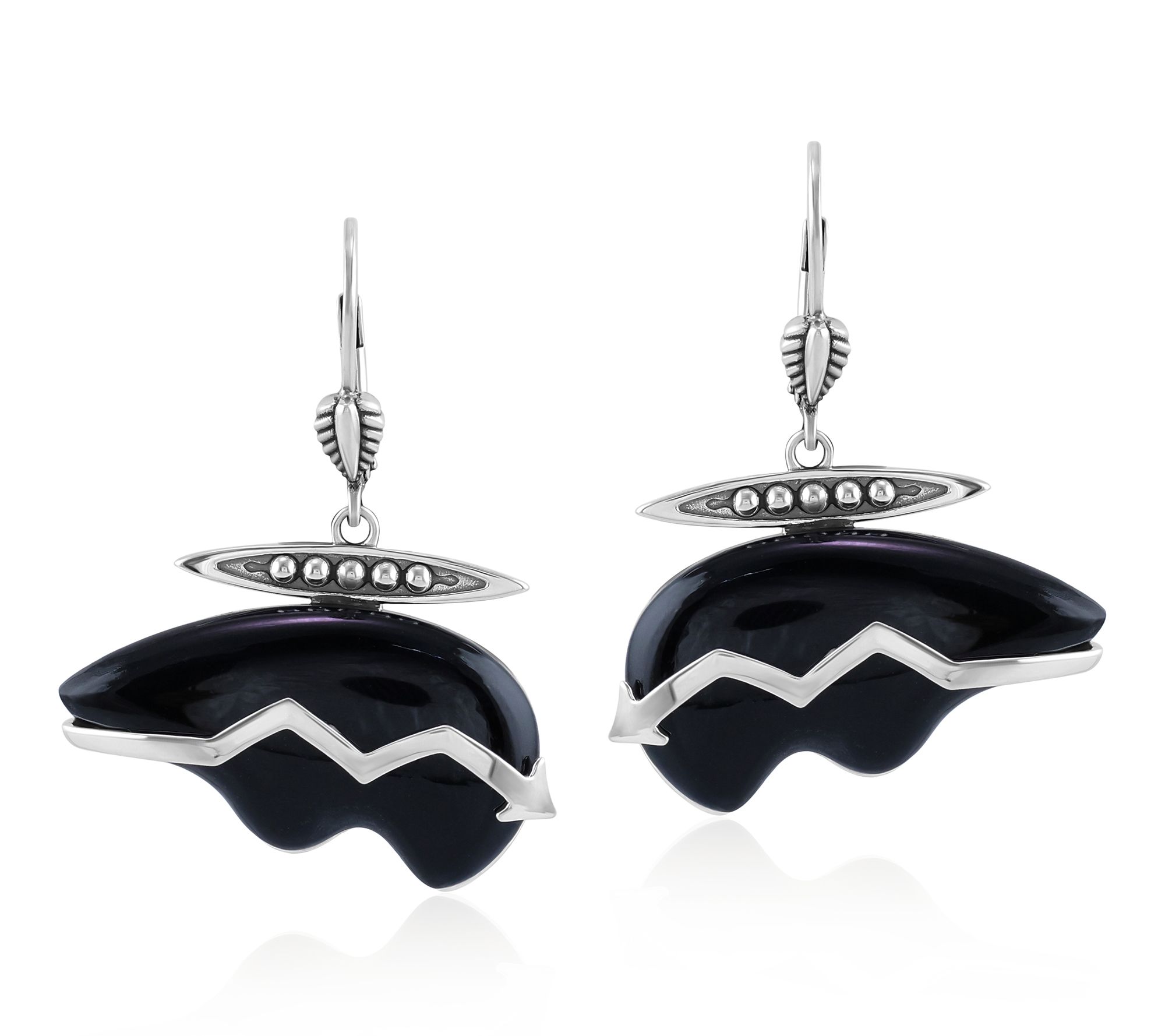 Let these sterling silver bear dangle earrings bring a playful spirit to your look, whether out for coffee with friends or heading to a special event. Black agate cabochons are set in bold bear silhouettes, accented with intricate silverwork that captures both whimsy and Southwestern charm. From American West Jewelry.