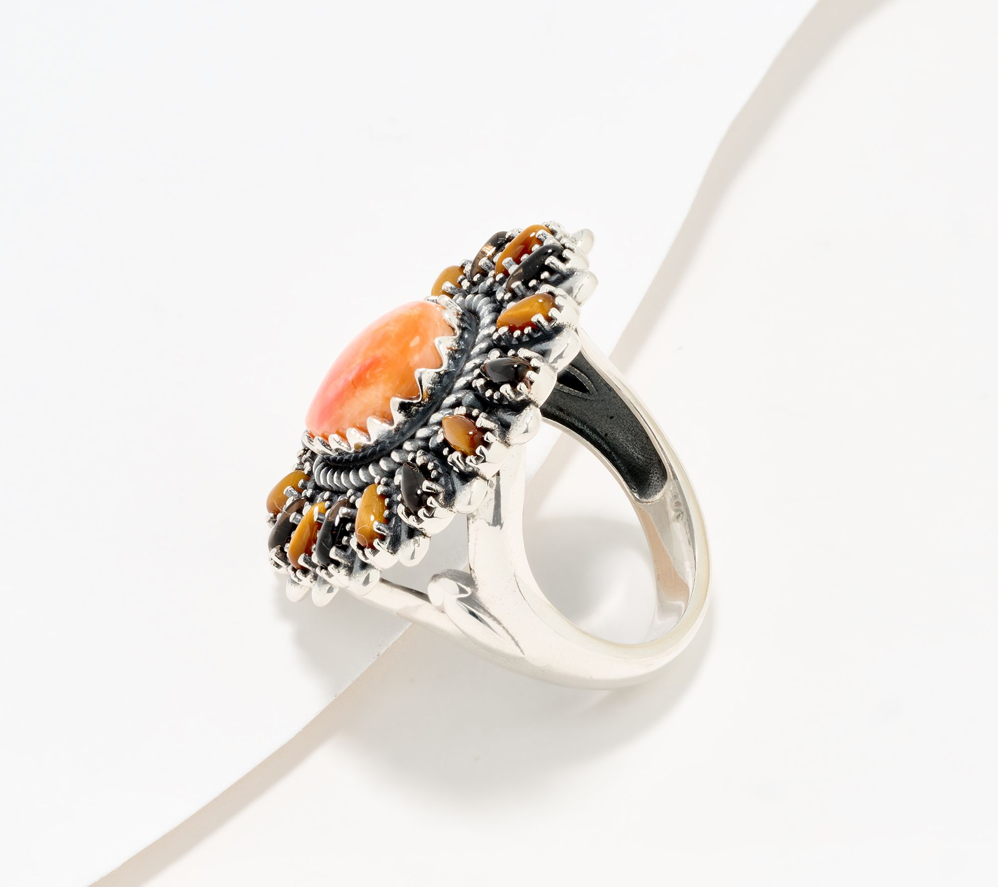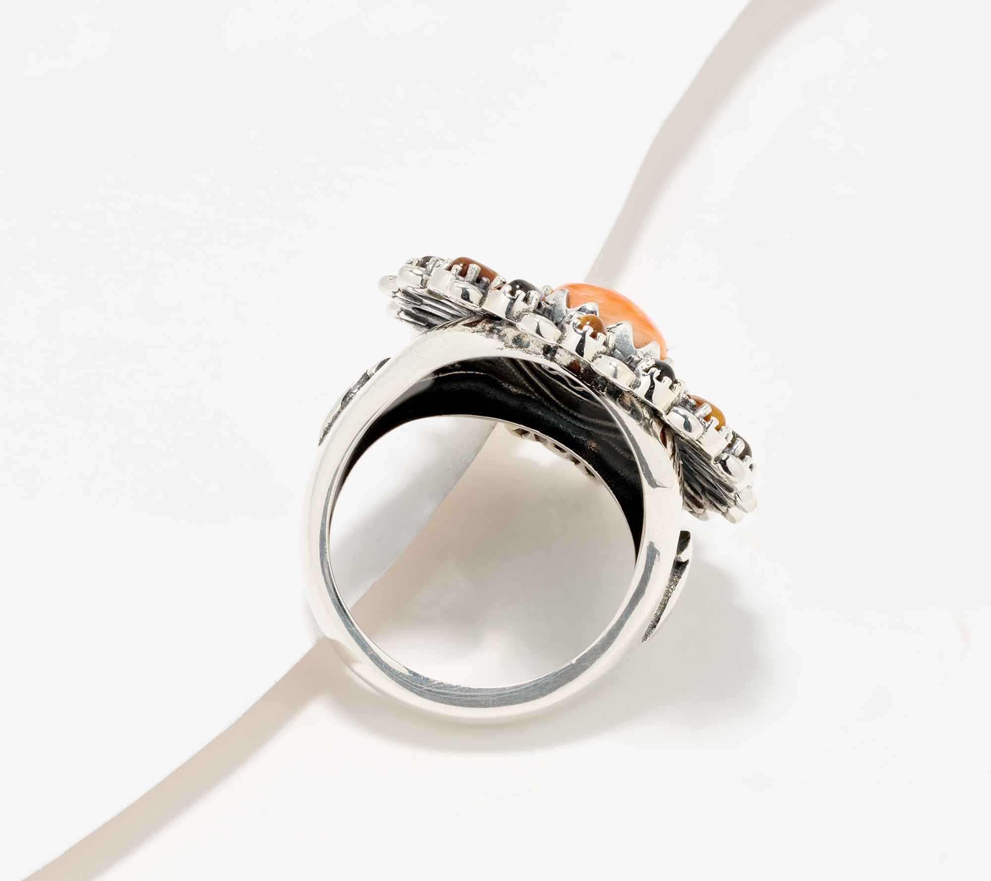 A shimmering cluster of pear-shaped gemstones surrounds a generous gemstone cabochon at the center, framed by oxidized sterling silver for a look that blends artistry and vibrancy. Accented by a polished shank and intricate detailing, this ring brings southwestern flair to both workday outfits and weekend adventures. From American West Jewelry.