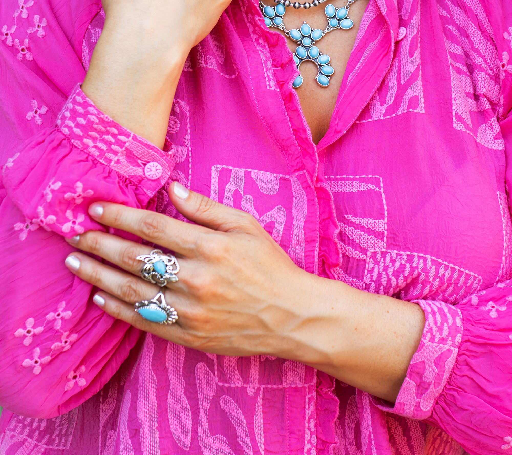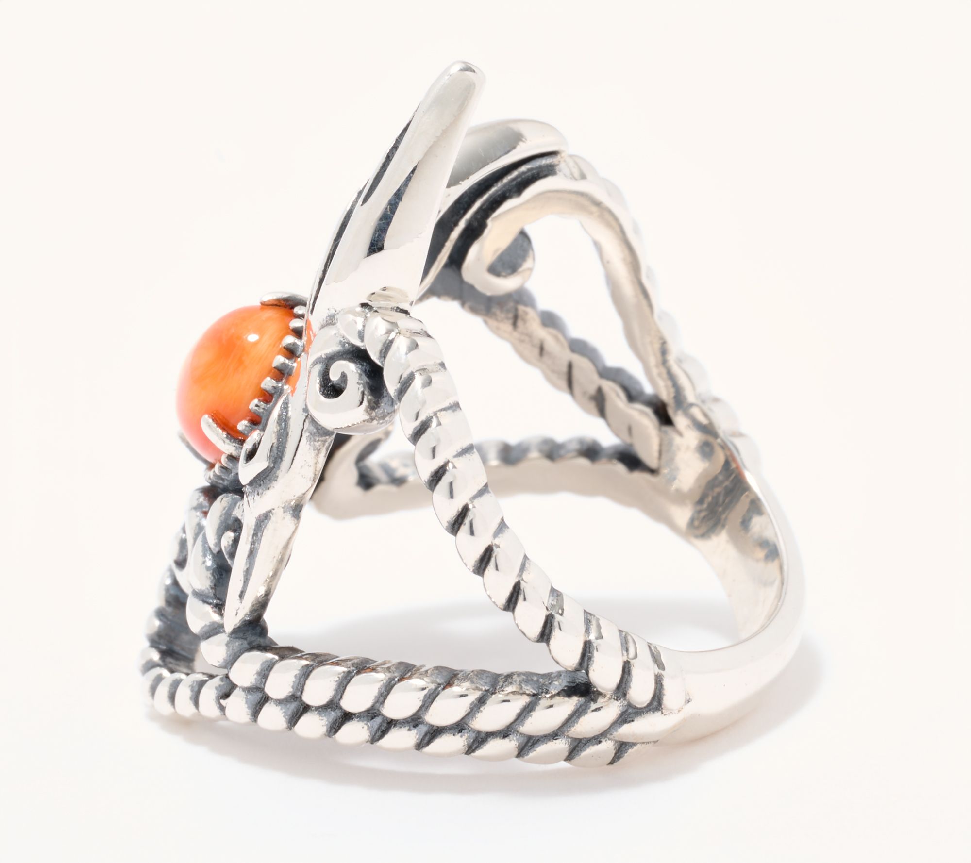 An ode to the Southwest's beauty, this sterling silver ring highlights a graceful hummingbird perched atop a prong-set pear-shaped gemstone cabochon, surrounded by delicate filigree and twisted rope texture. Slide it on for that weekend adventure or to add a playful twist to your weekday style. From American West Jewelry.
