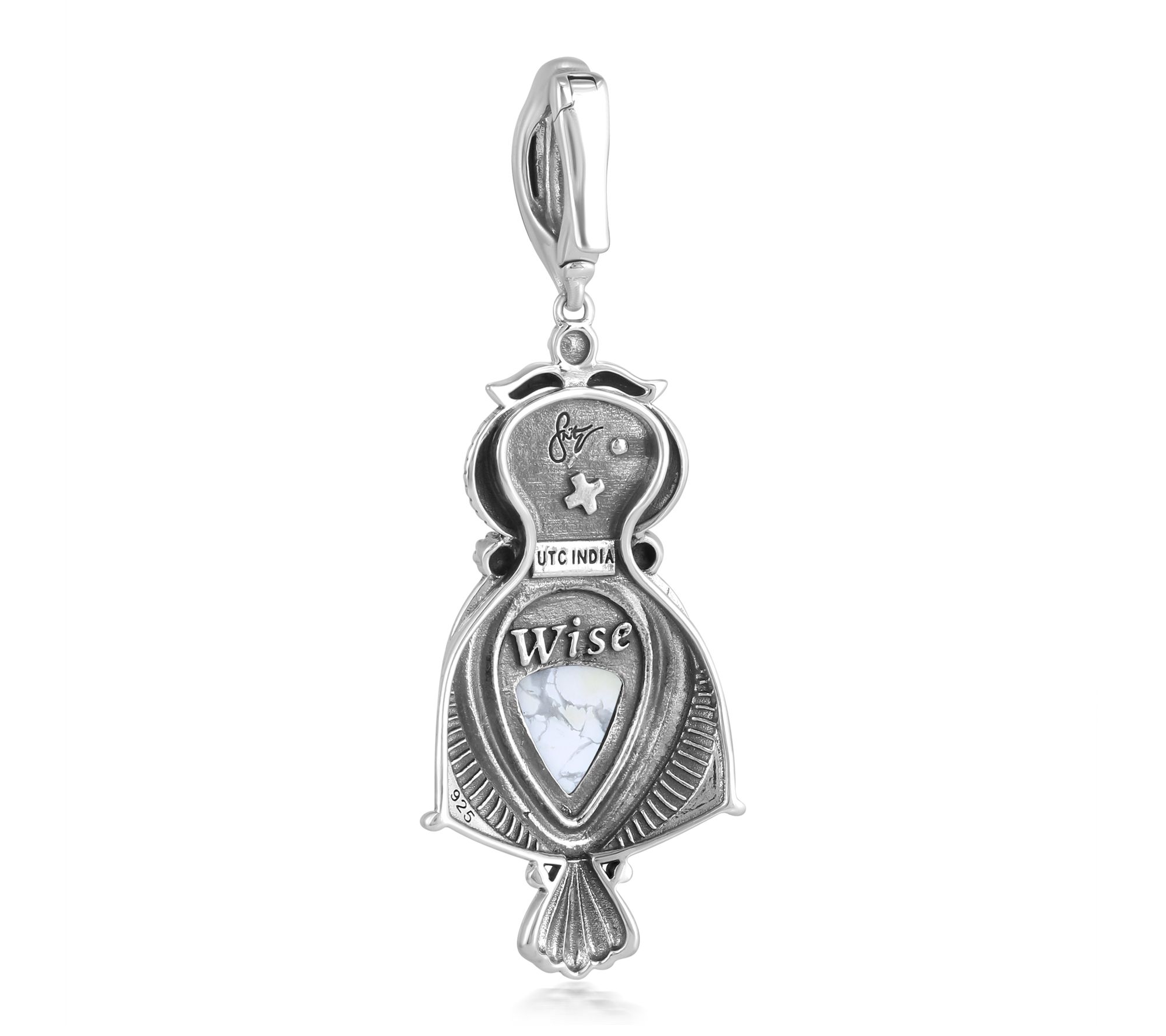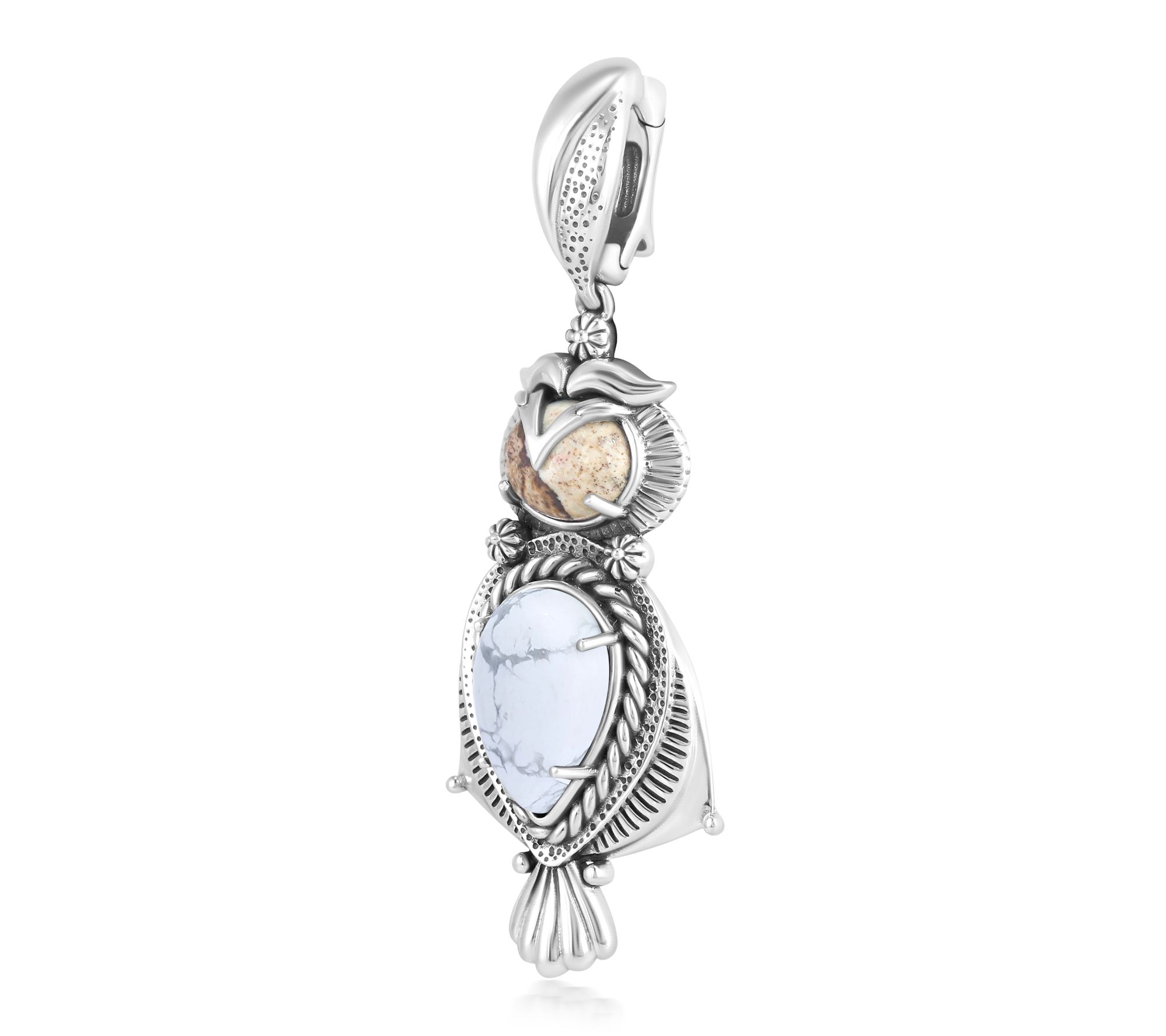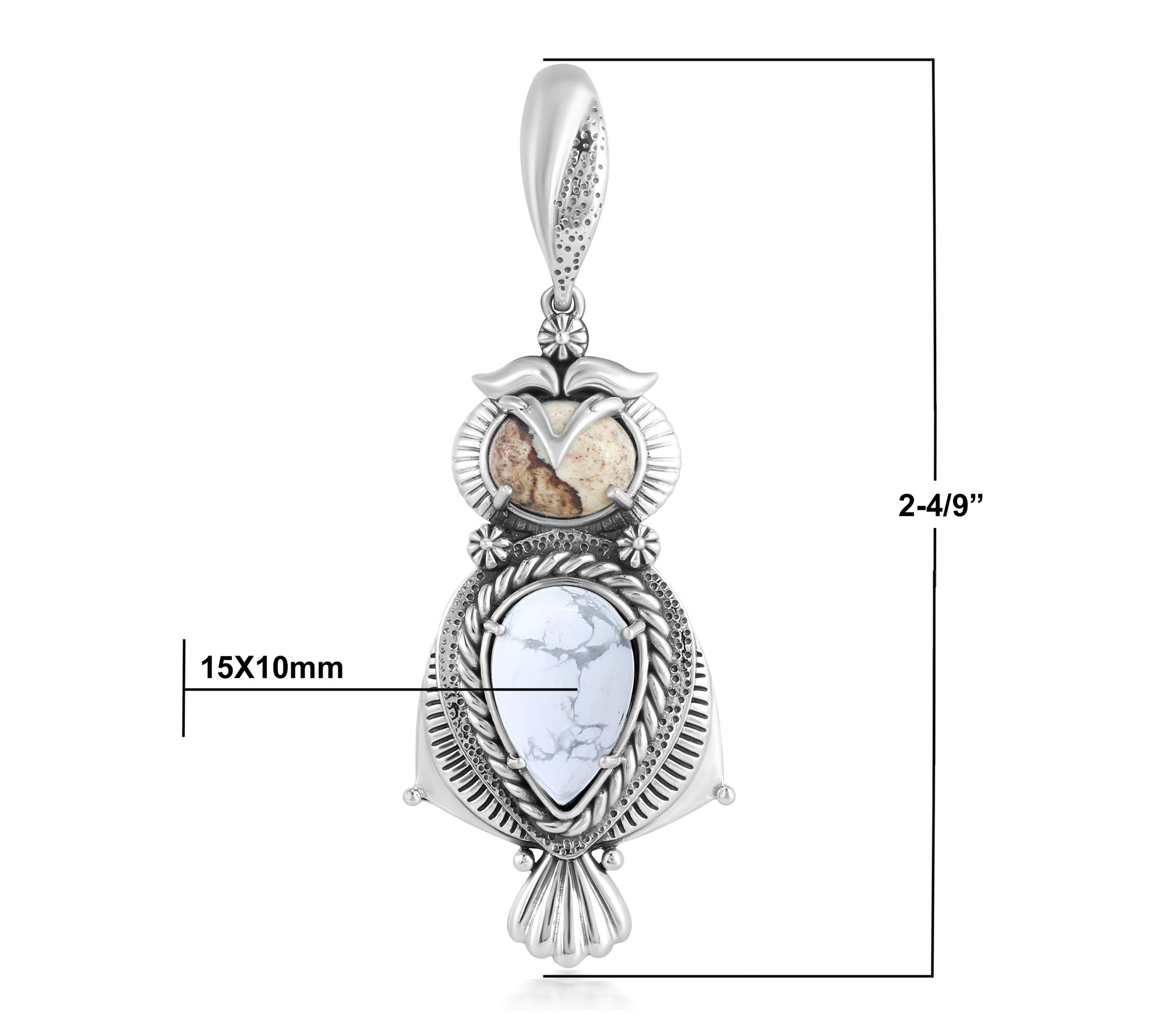 Let this owl enhancer be your symbol of wisdom and style, featuring a pear-shaped howlite cabochon and oval picture jasper cabochon set in sterling silver. Accented with rope, concha flower, and textured patterns, this pendant brings a touch of artistry to your favorite chain or cord -- engraved with "Wise" on the back for meaningful inspiration. From American West Jewelry.