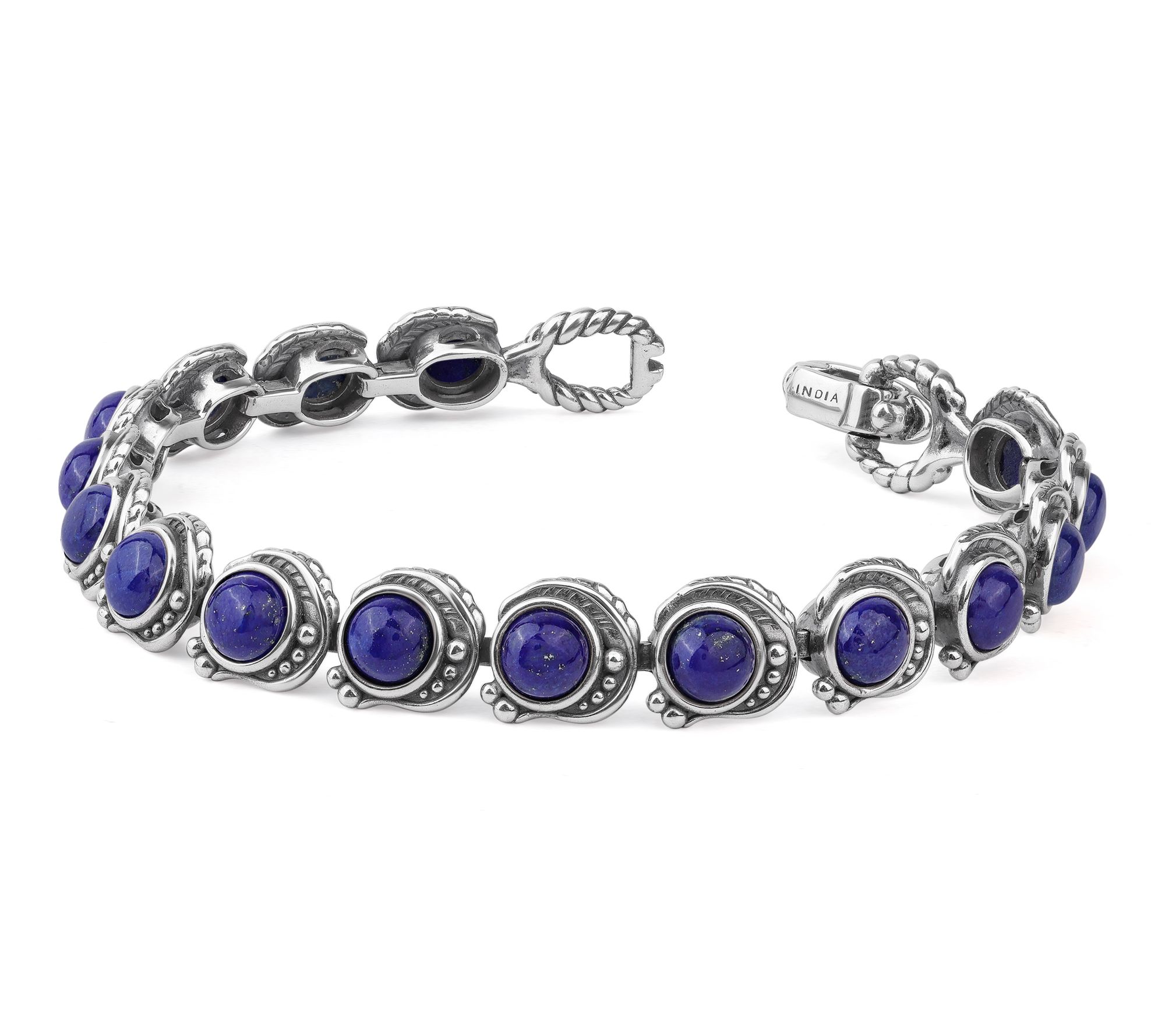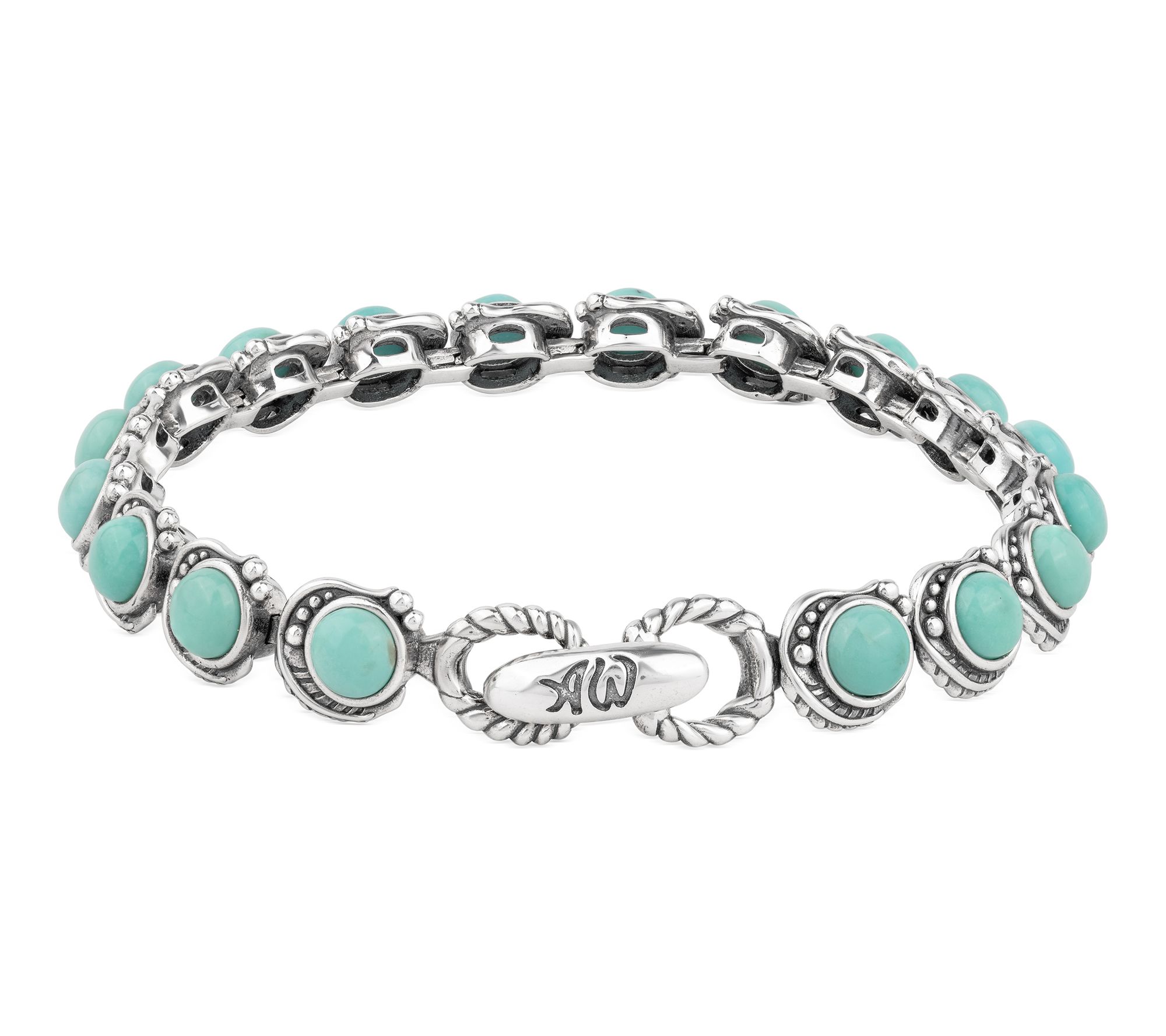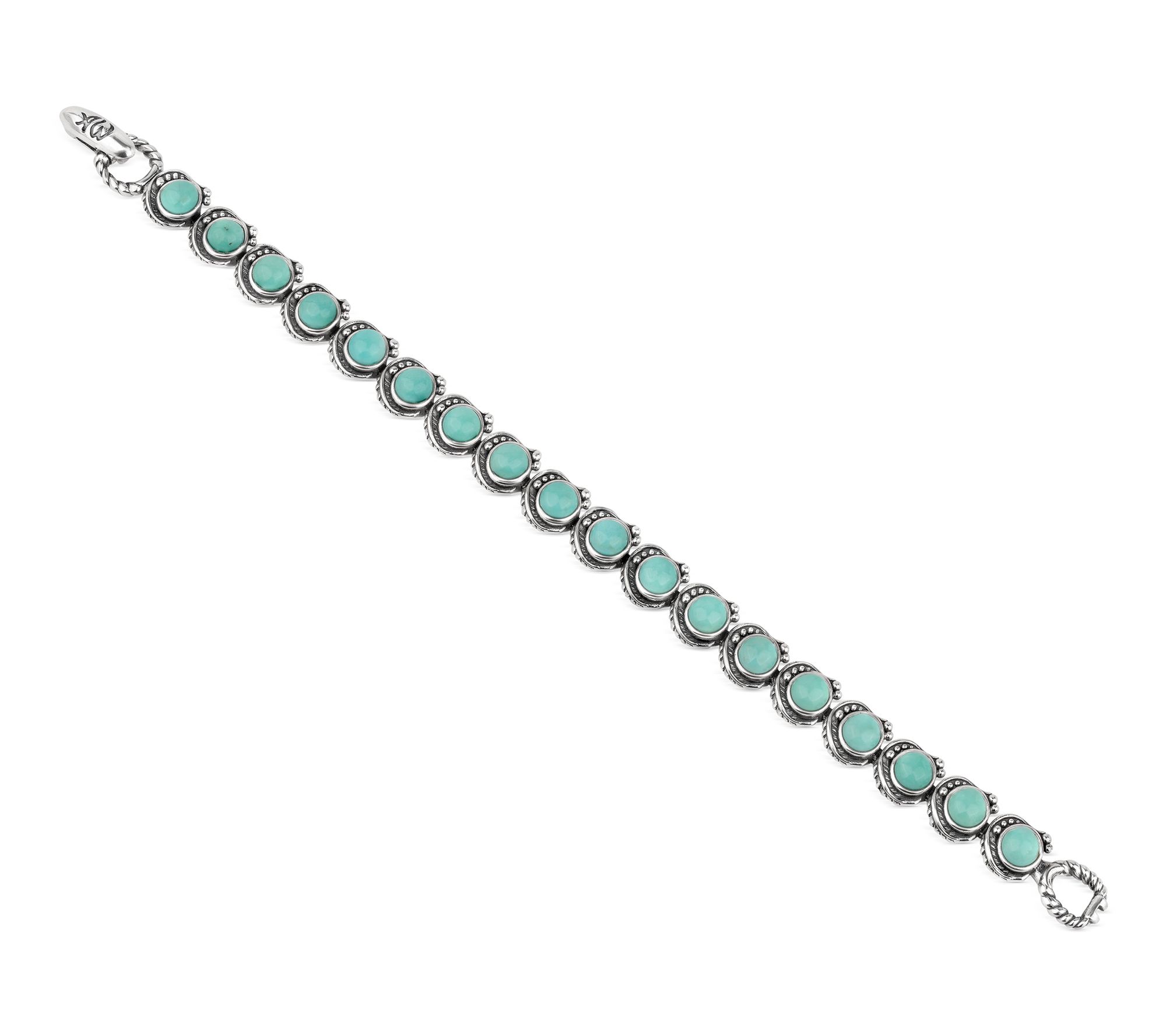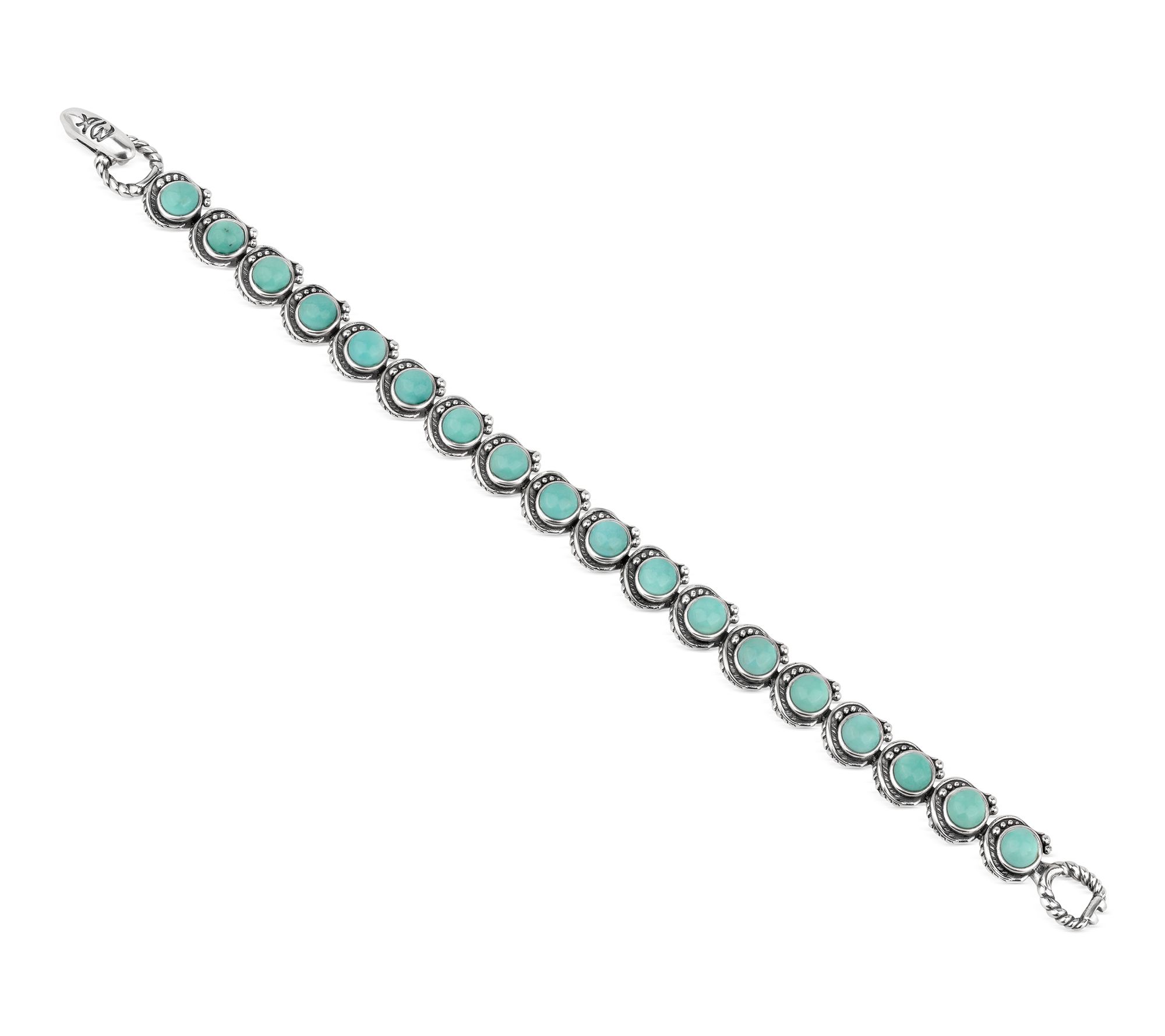 Dress up denim days and office ensembles alike with the vibrant hues of this gemstone tennis bracelet. Sterling silver links, elevated with round bezel-set cabochons and leaf and bead details, deliver a look that's both timeless and full of southwestern flair -- just right for gifting or treating yourself to a splash of color. From American West Jewelry.