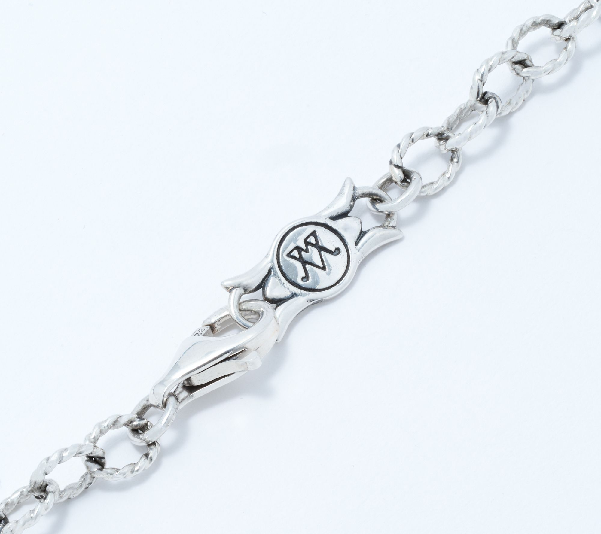 Round and oval Kingman turquoise cabochons in clusters; naja-shaped center; oxidized finish; textured oval link chain