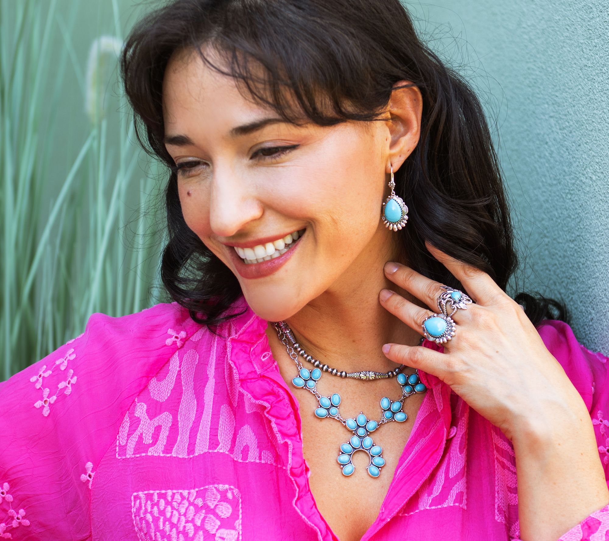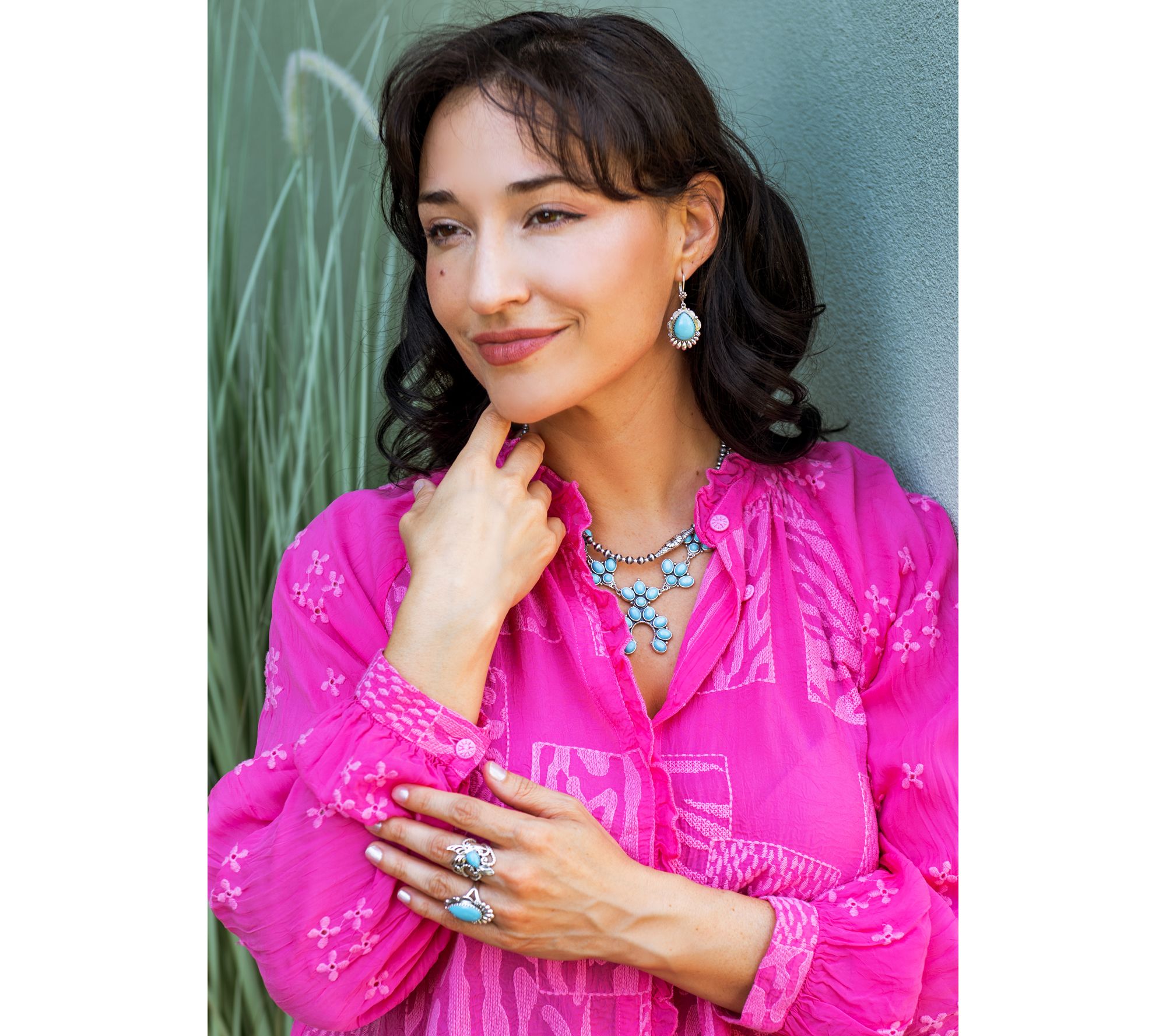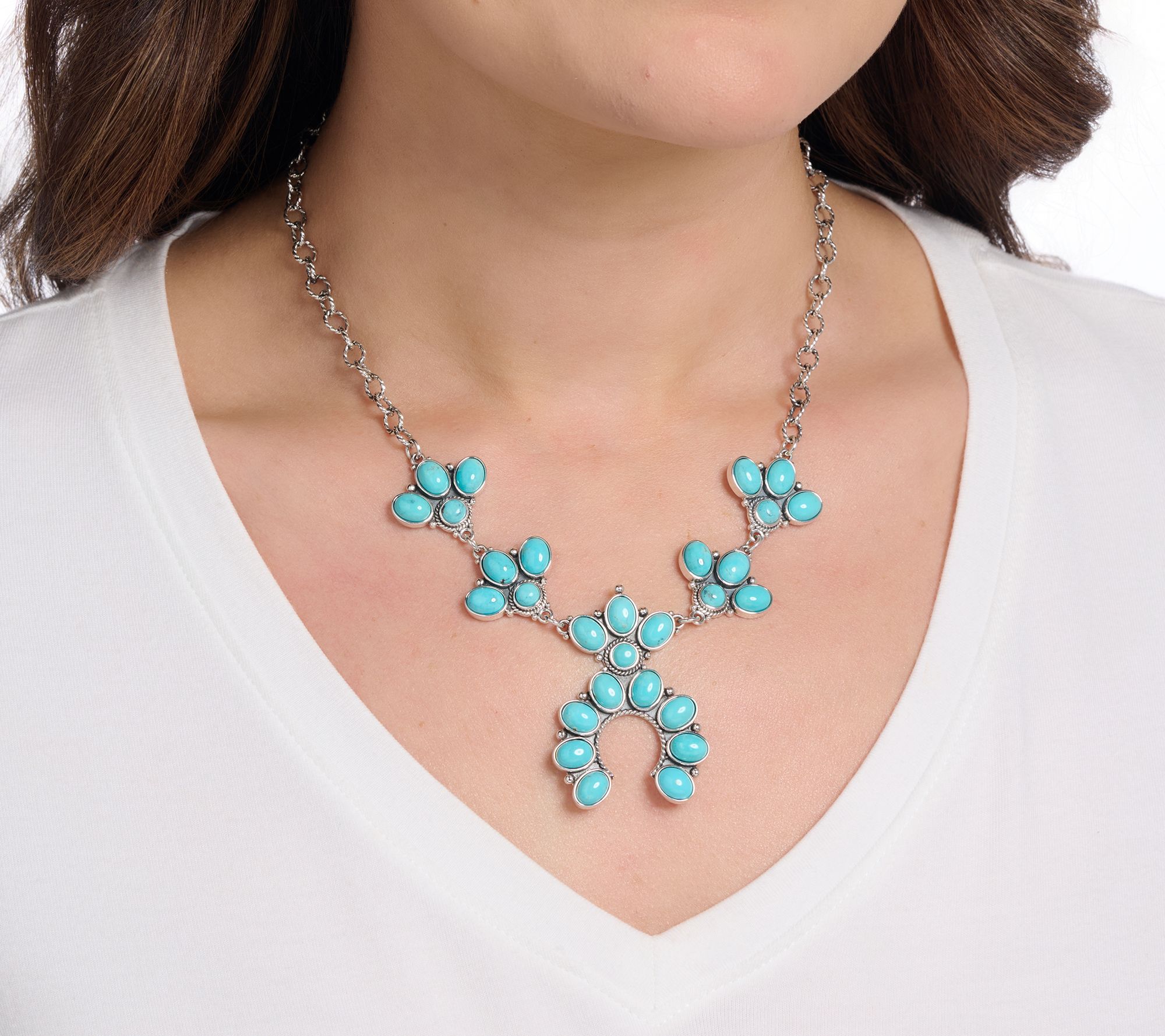Statement-making style starts at the neckline with this Kingman turquoise necklace, a showpiece destined for moments when you want to stand out. Clusters of round and oval cabochons encircle the iconic sterling naja, while a textured oval link chain and oxidized finish bring depth and dimension to your look. From American West Jewelry.