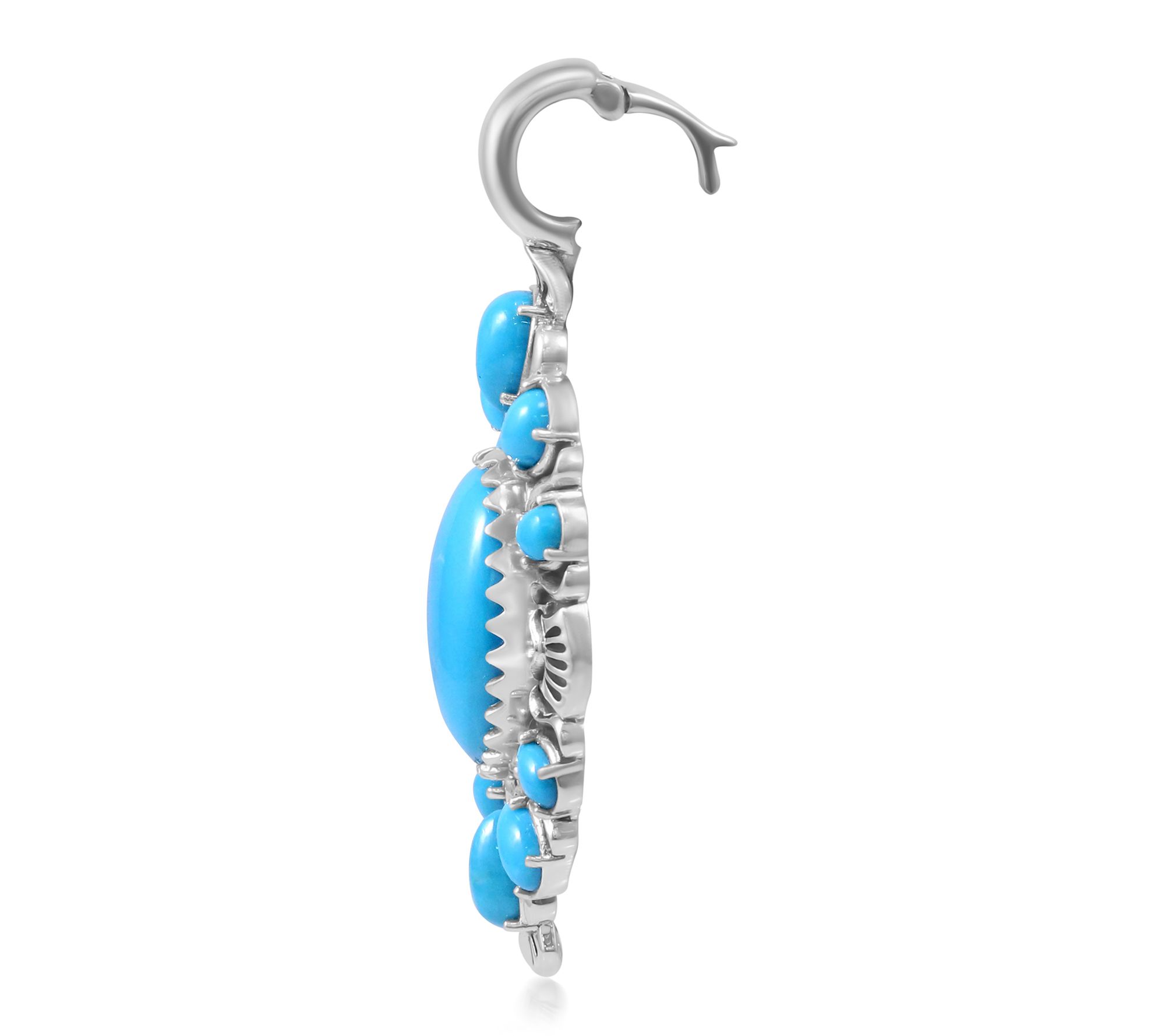 • Oval, prong-set turquoise cabochon at center; border of pear-shaped turquoise cabochons; back engraving; oxidized finish