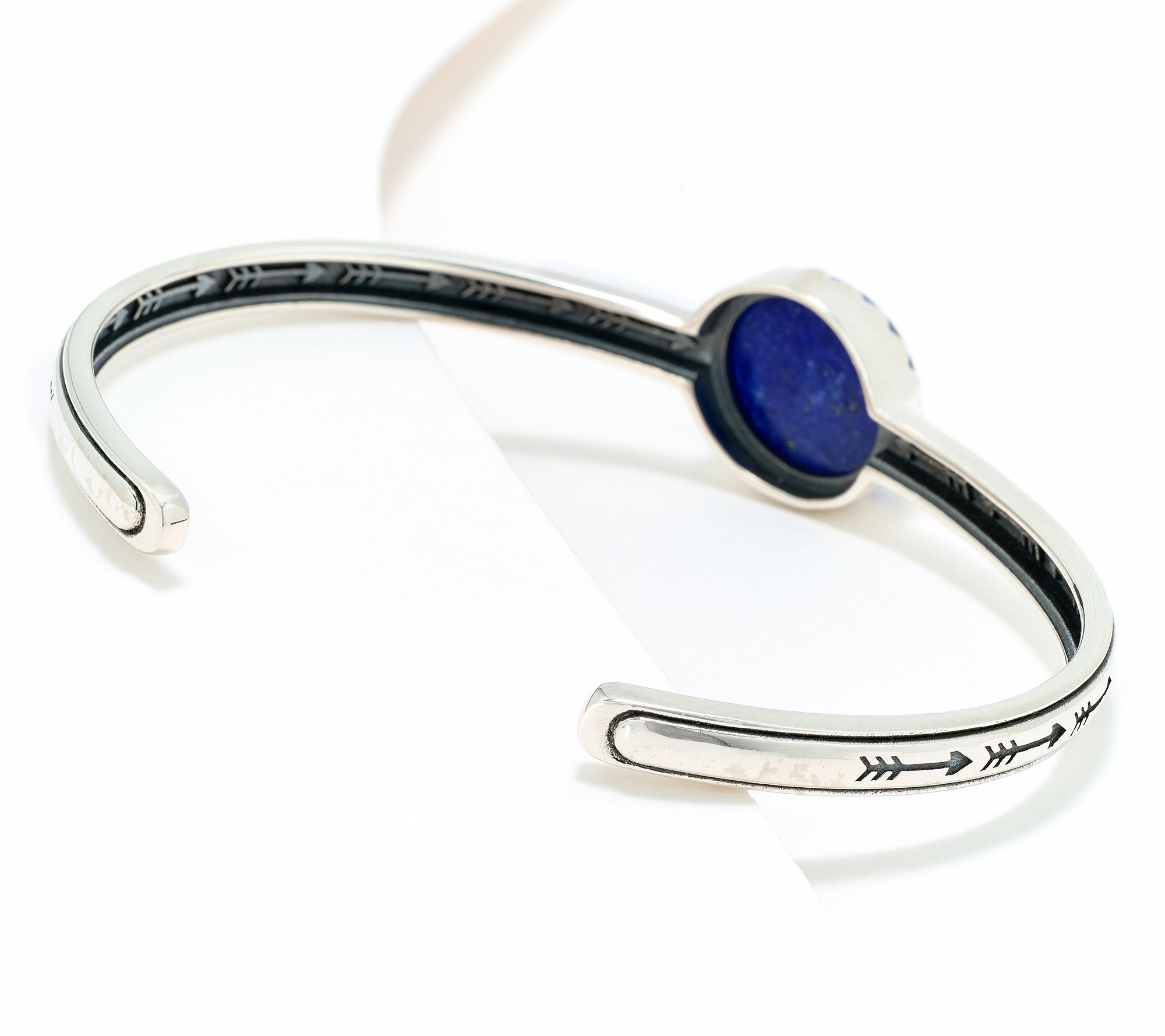 • Cuff design; center gemstone with patterned or engraved cuff; oxidized finish