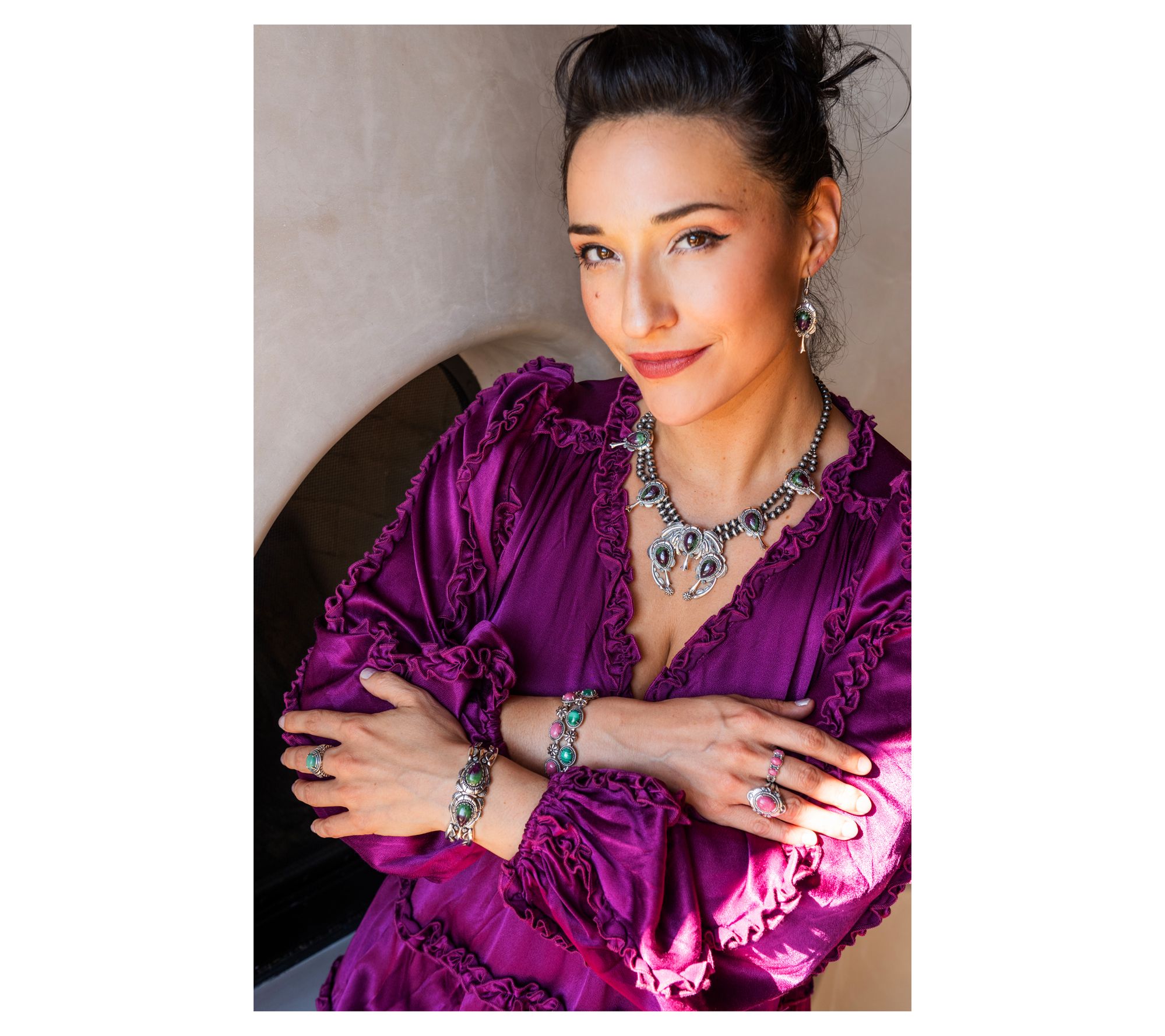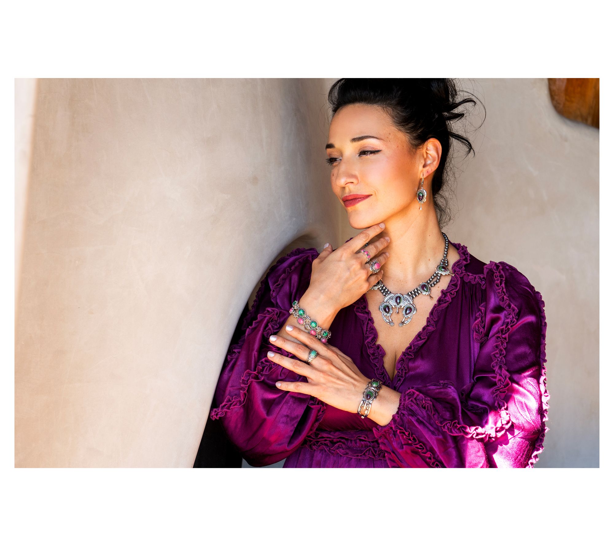 The beauty of these intricately detailed squash blossom earrings lies in how effortlessly the drop design pairs with everyday outfits -- from jeans and a tee to that knit dress you pulled on because company's coming. And, of course, it's also in their impossible-to-ignore gemstone cabochons. From American West Jewelry.