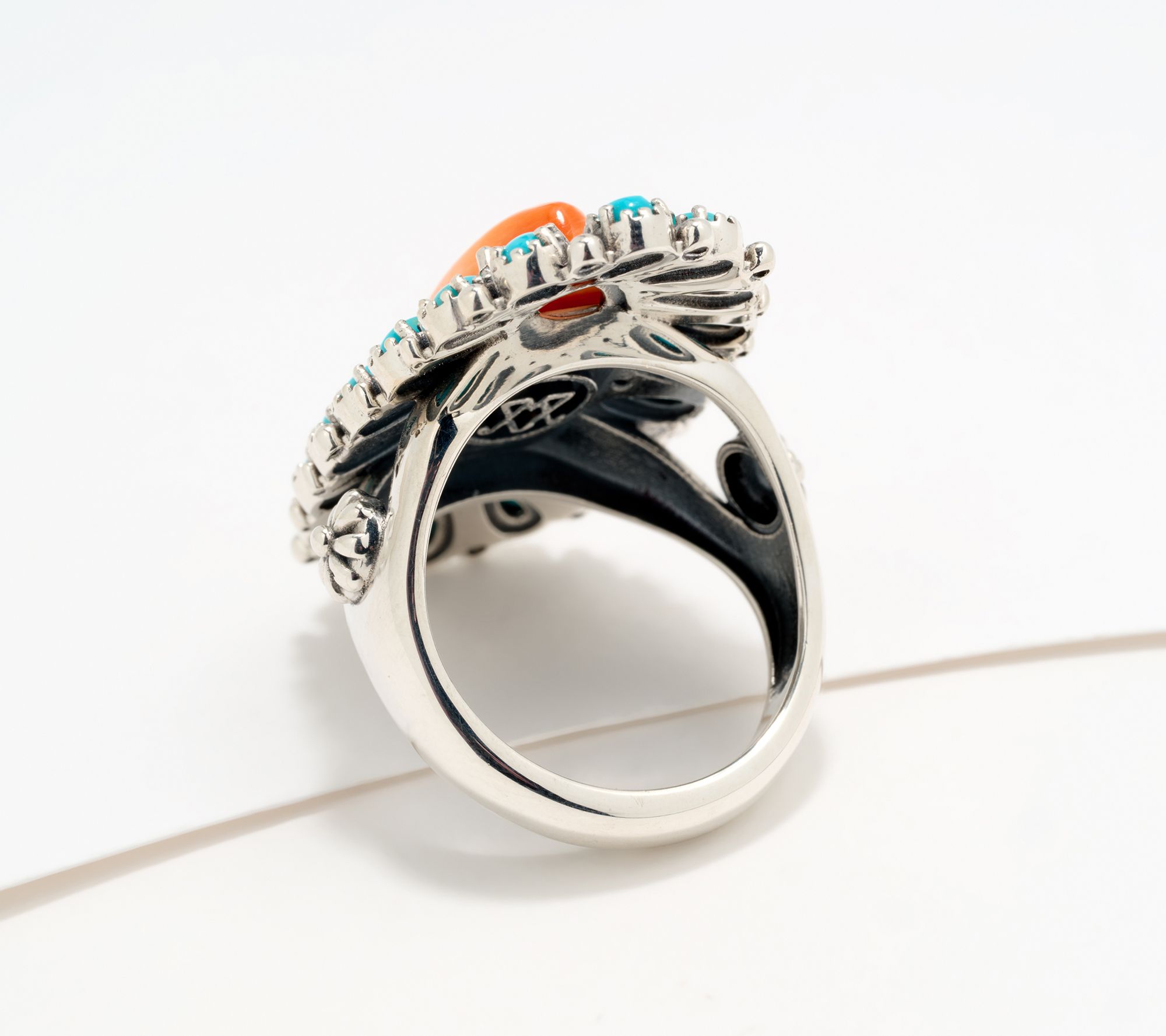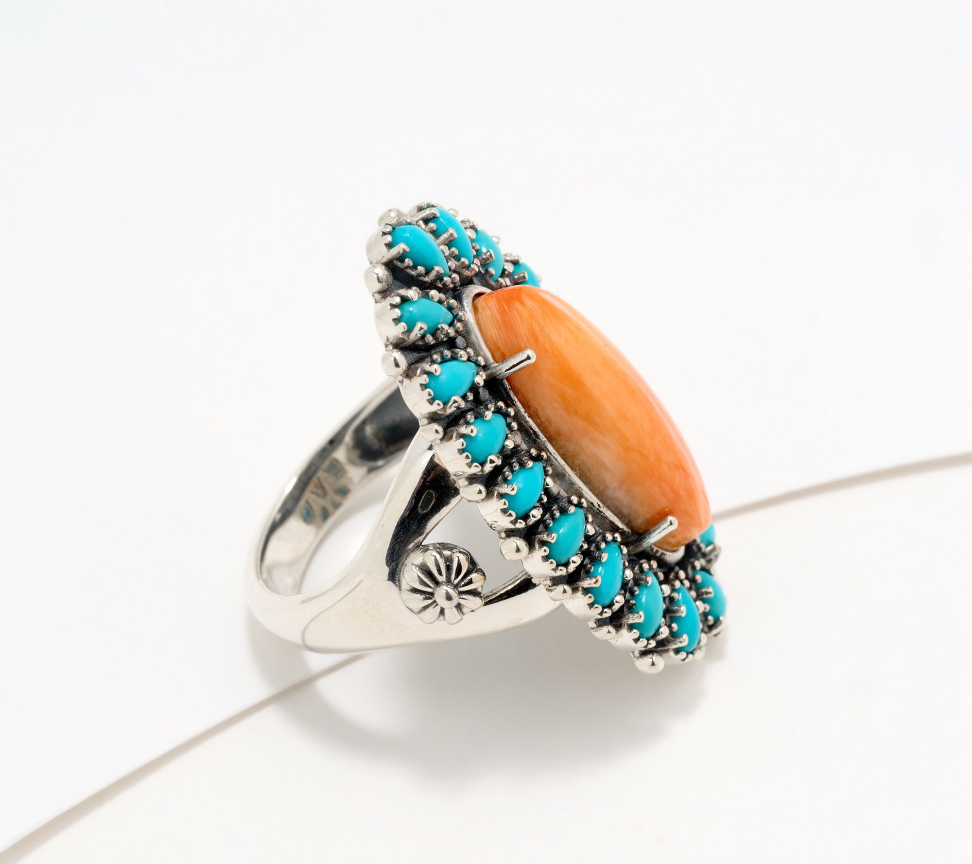 Slip on this sterling silver beauty and let vibrant turquoise accents instantly uplift your mood, whether you're heading to brunch or enjoying a quiet afternoon outdoors. A central gemstone cabochon draws in the light, framed by a collection of petit point turquoise cabochons and finished off with floral-inspired concha detail along the shank. Your jewelry box just found its new statement favorite. From American West Jewelry.