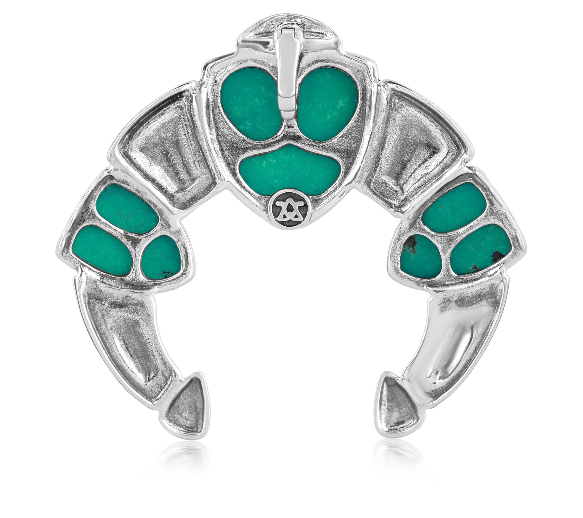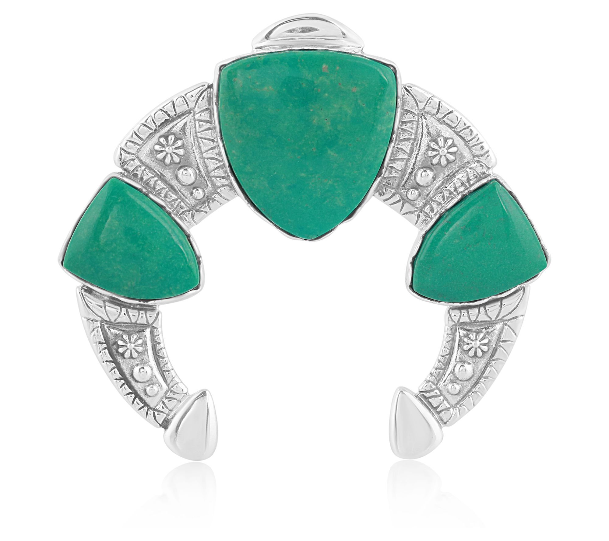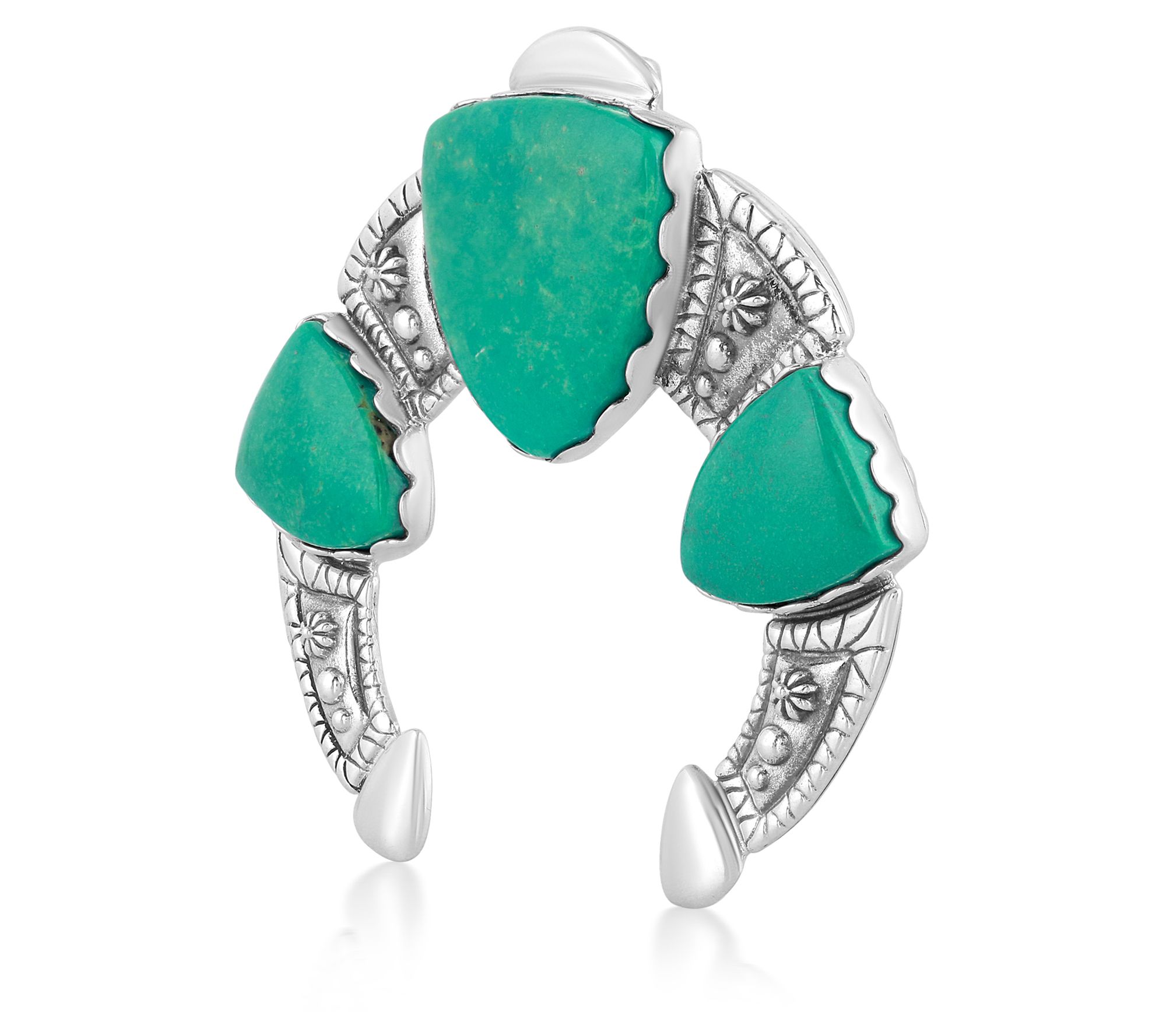 Showcasing a trio of shield-shaped green turquoise stones surrounded by sterling silver and intricate detailing, this naja enhancer brings a touch of artisanal beauty to any outfit. From American West.