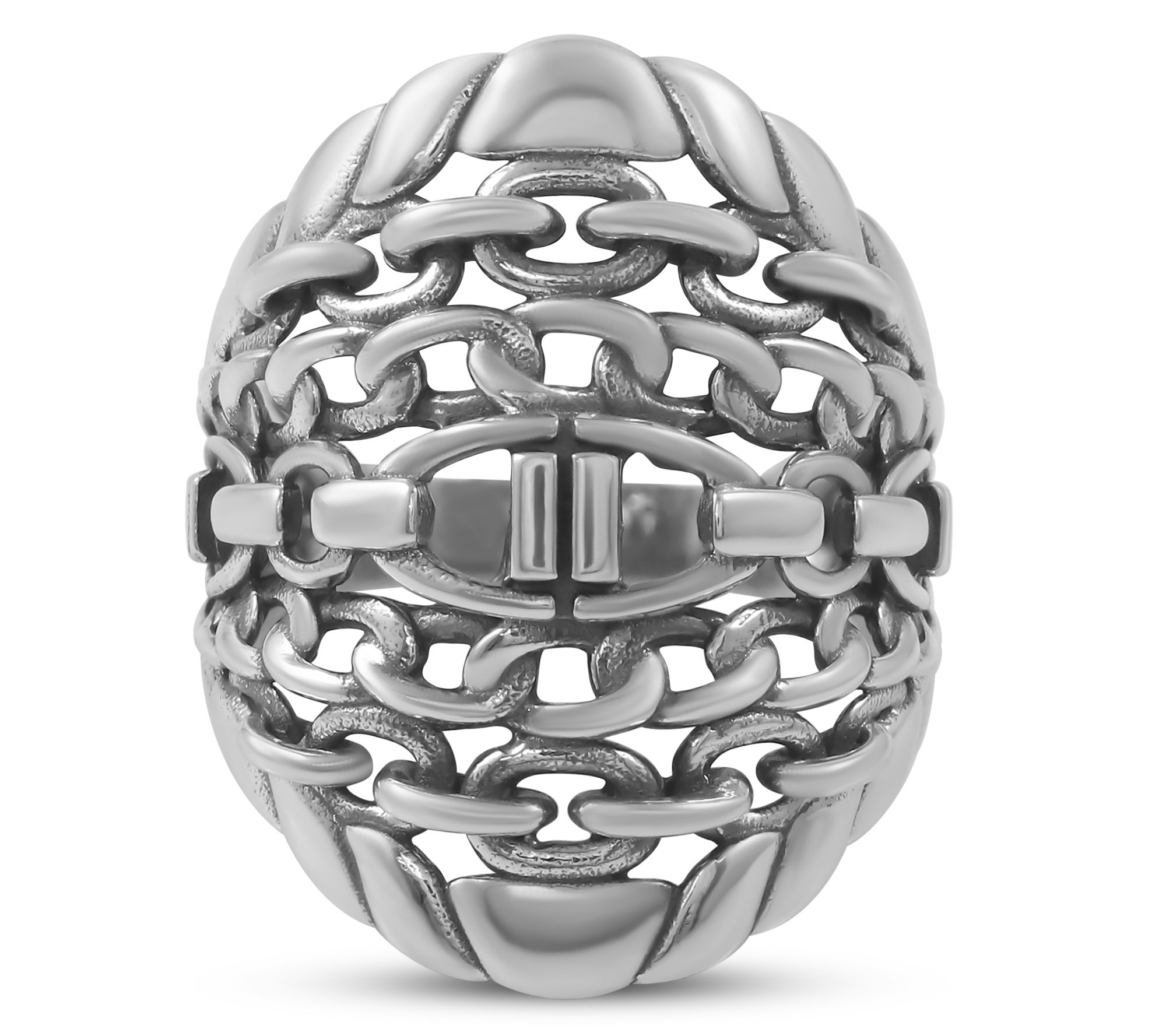 Western inspiration meets bold style with this sterling silver ring, crafted in a domed silhouette and accented by a distinctive stirrup chain link motif. The oxidized finish brings out every intricate detail, giving you a standout look whether you're heading to a country concert or brunch with friends. From American West Jewelry.