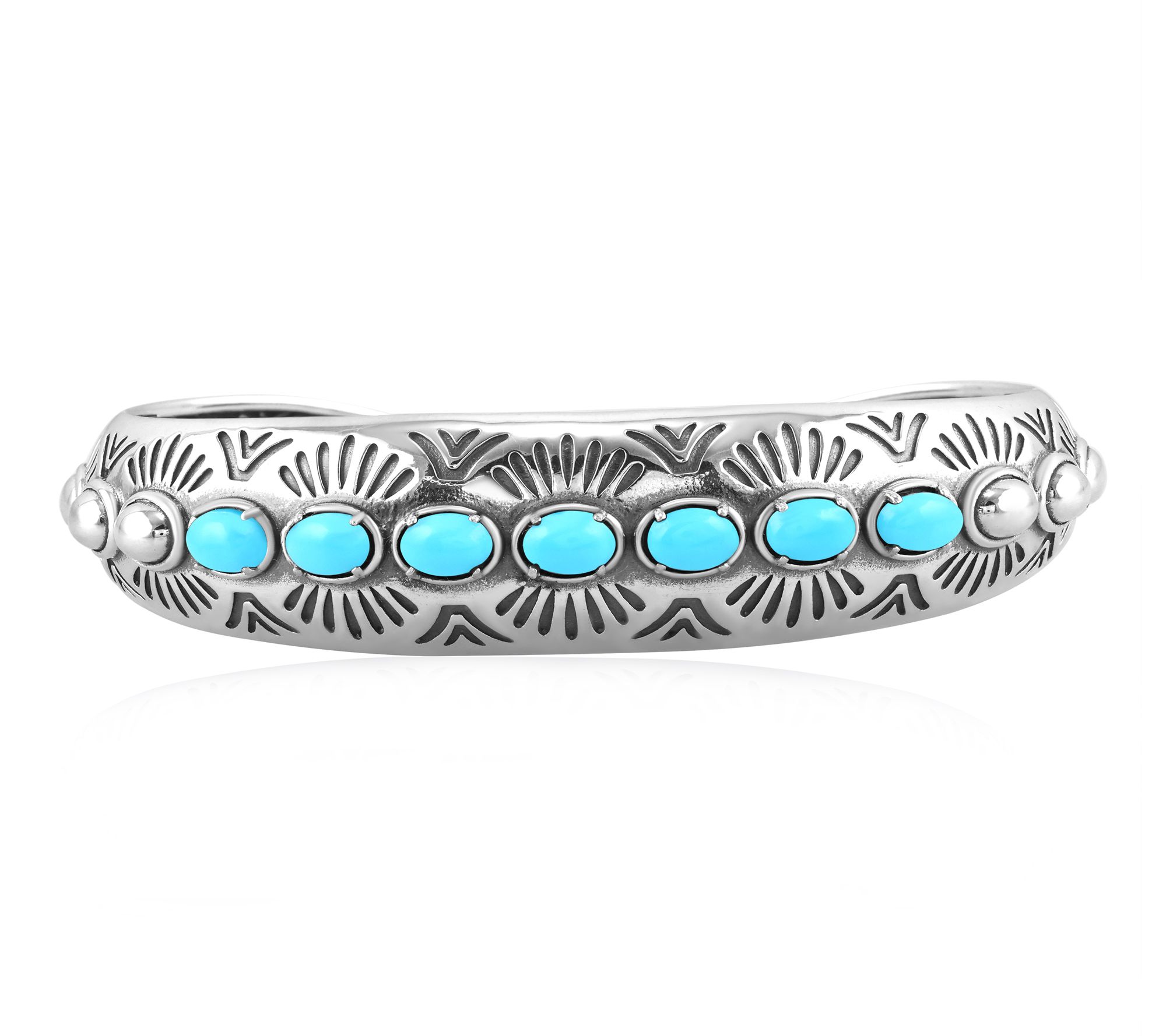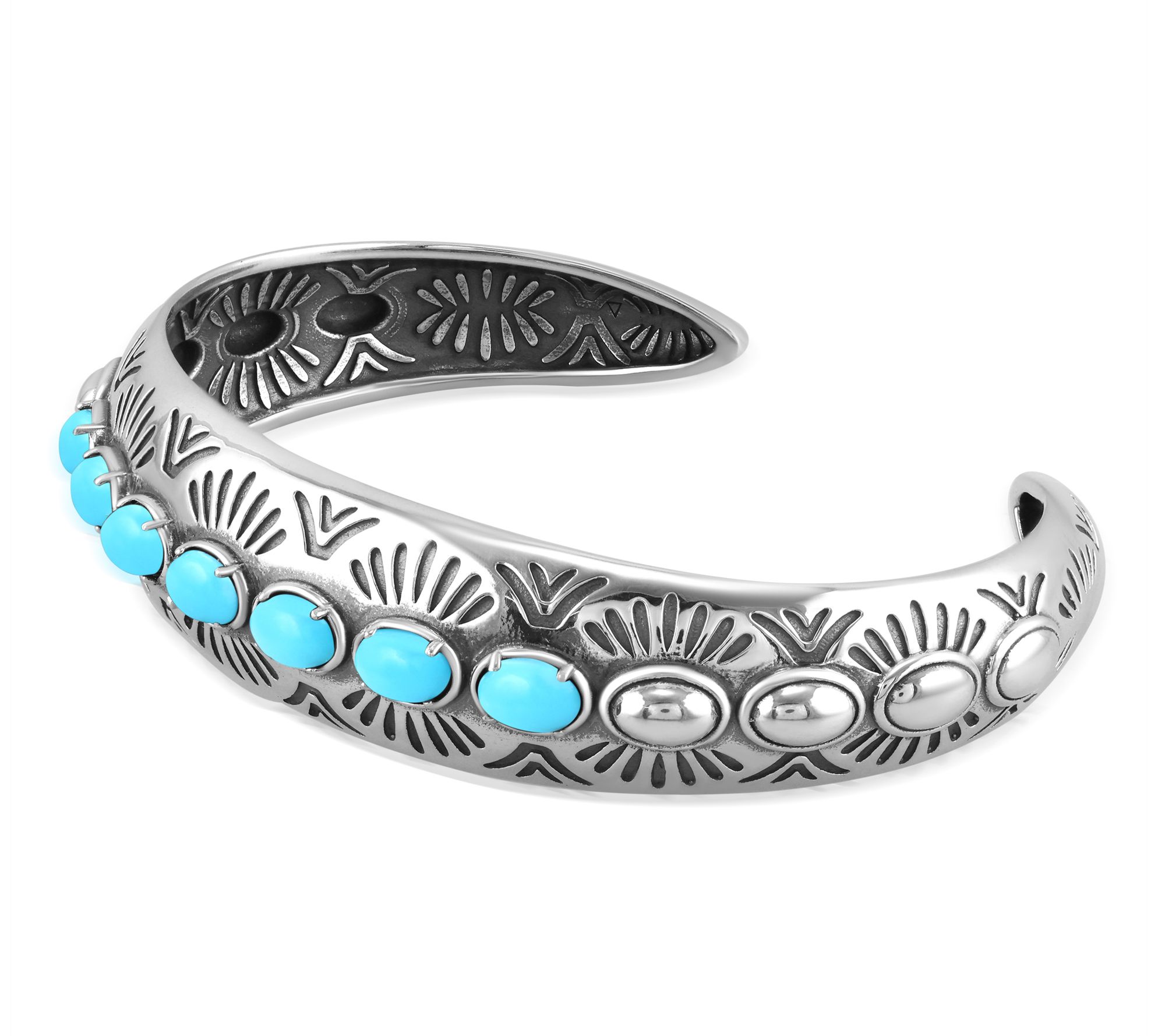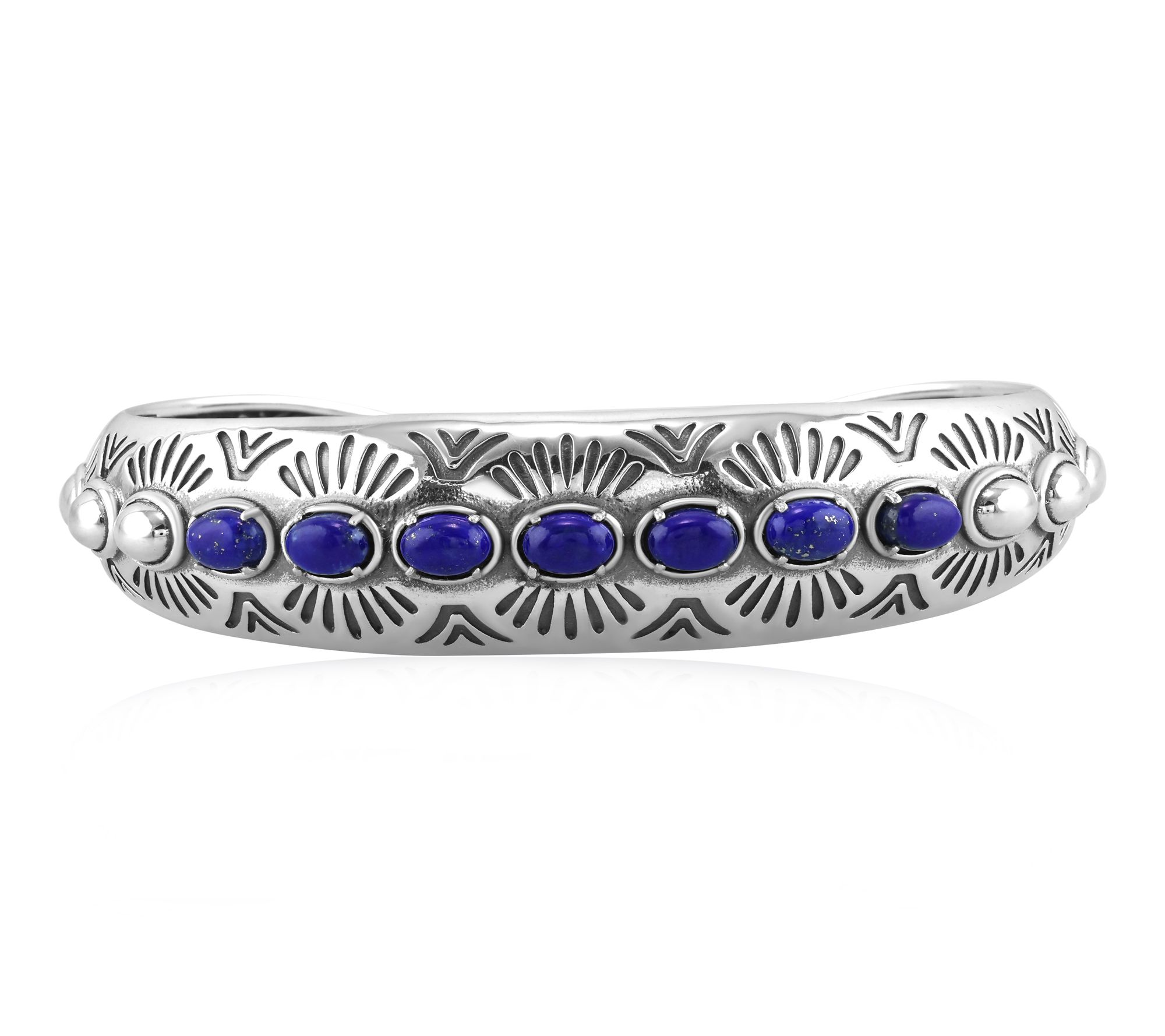 Worn solo or stacked, this sterling silver cuff adds a pop of color to any look with seven oval cabochon gemstones nestled in striking etched details. It offers a vibrant accent for everything from Sunday brunch to after-work gatherings. An oxidized finish highlights every texture and stone for eye-catching appeal. From American West Jewelry.