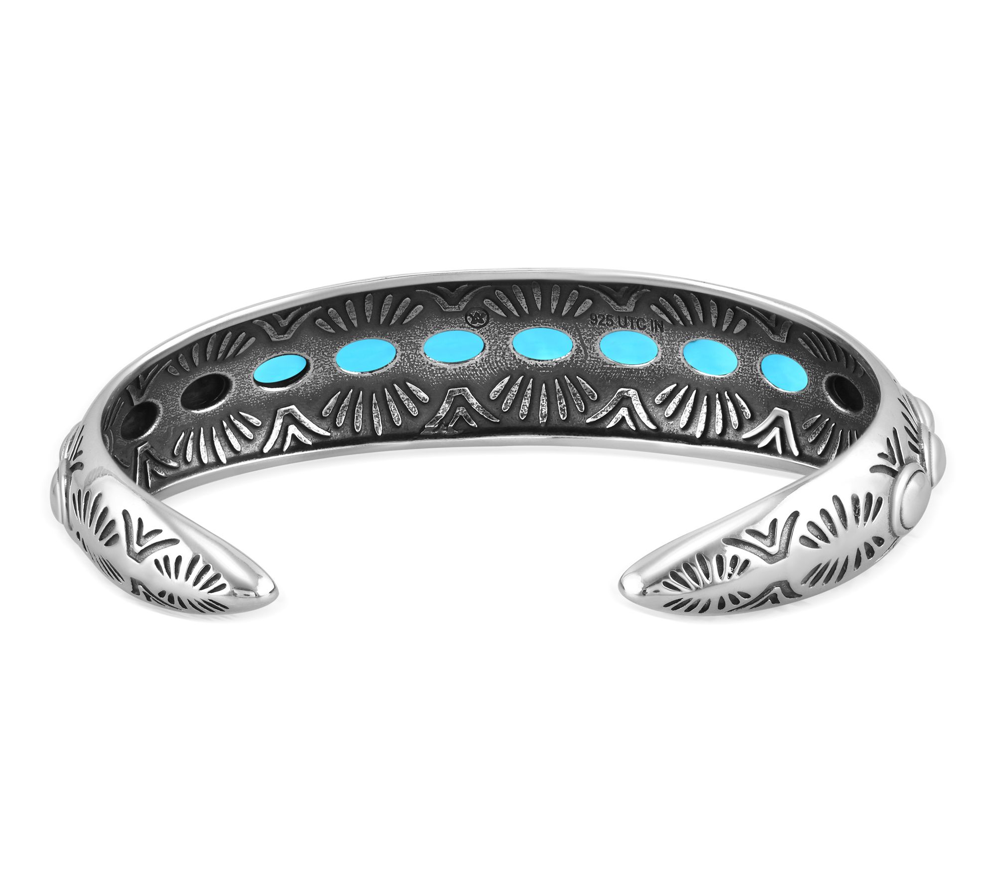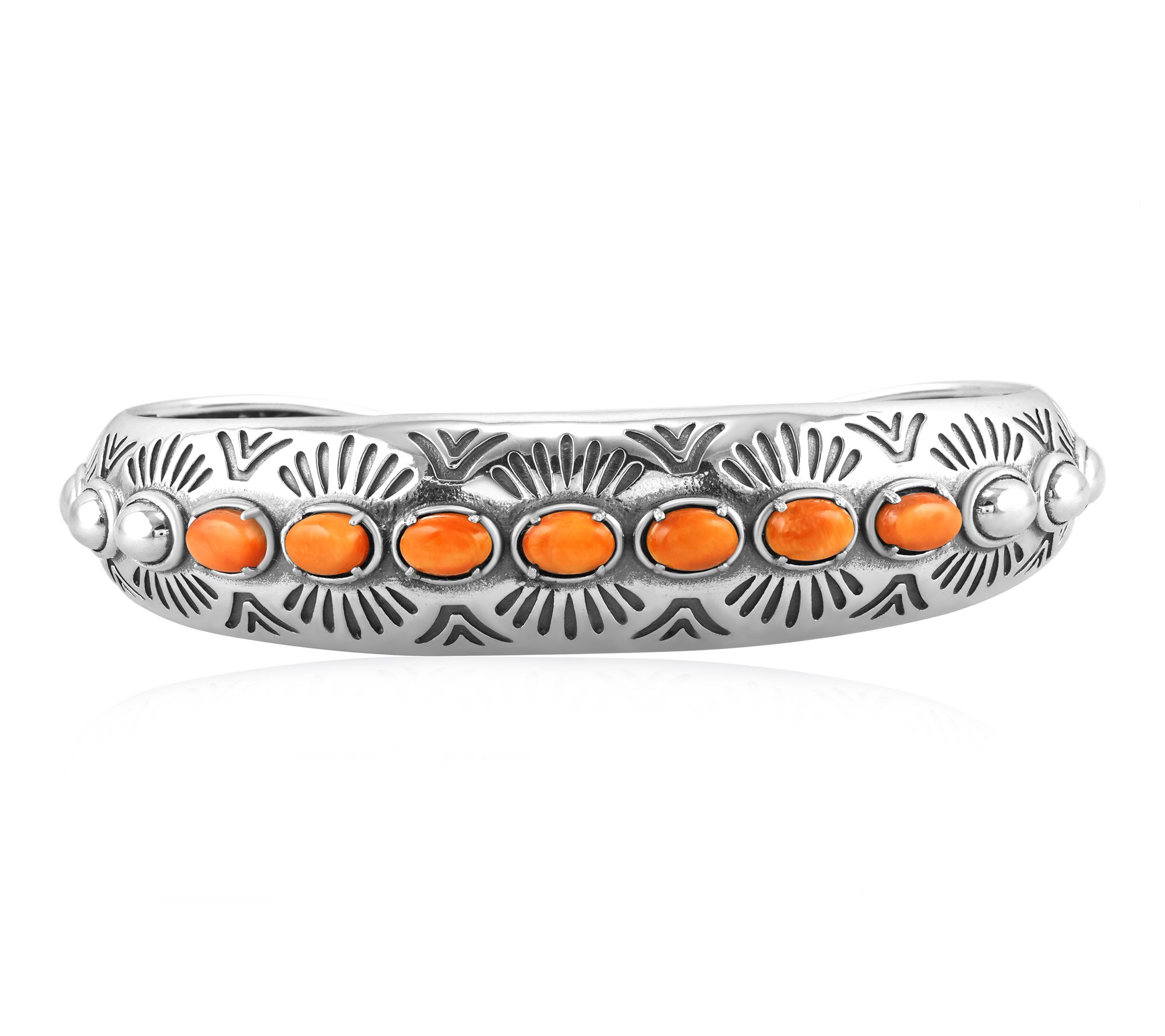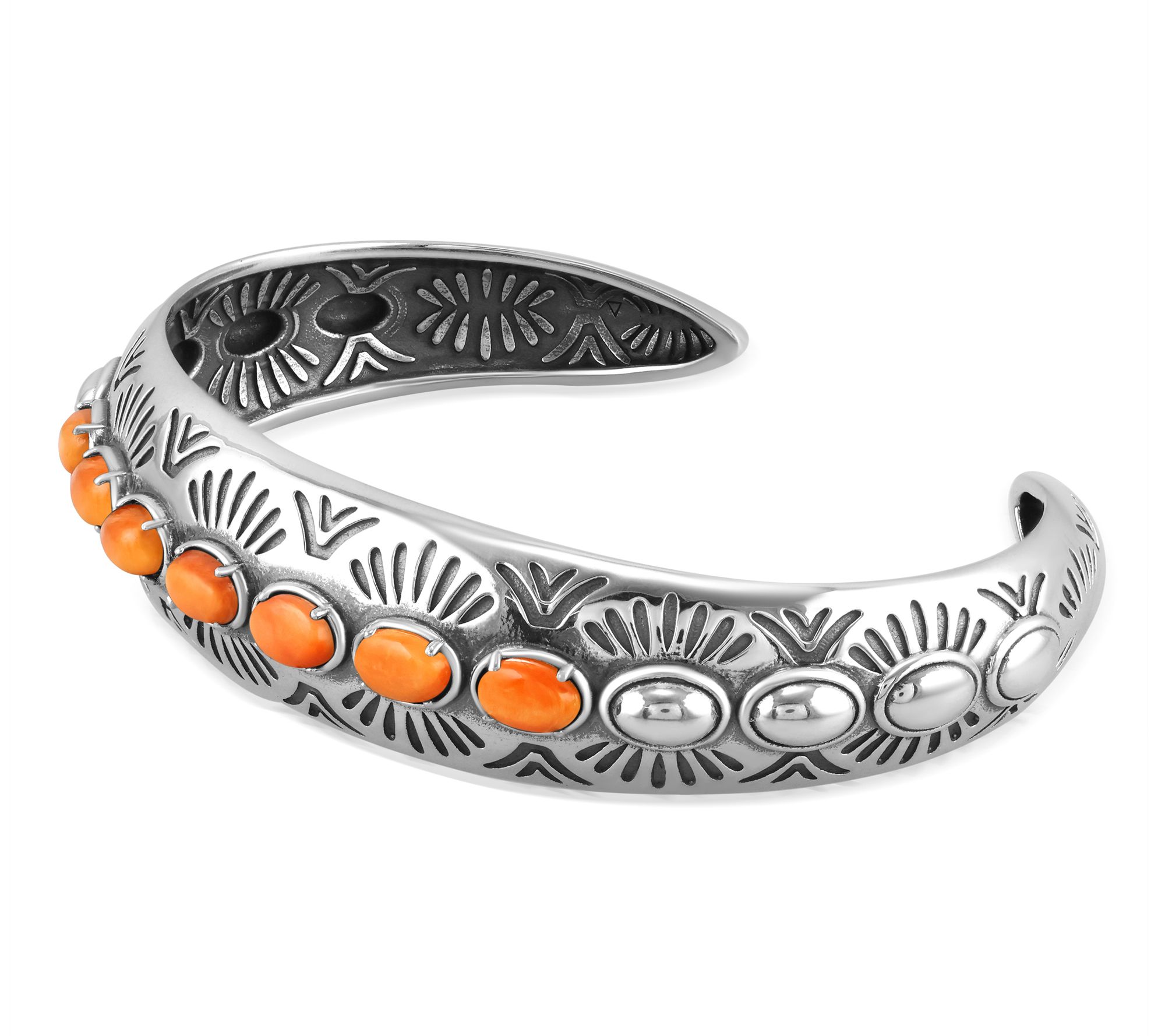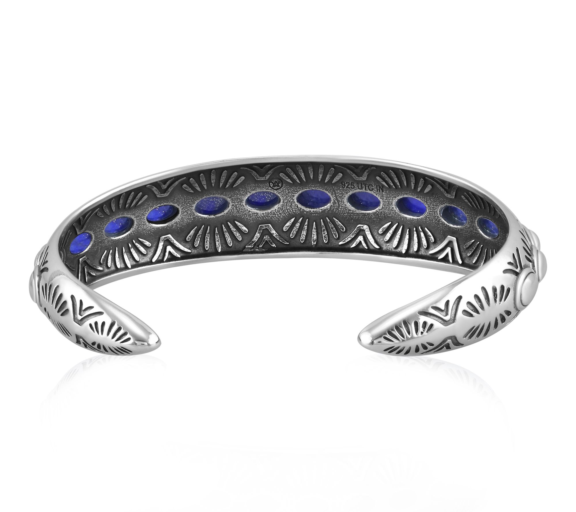 Worn solo or stacked, this sterling silver cuff adds a pop of color to any look with seven oval cabochon gemstones nestled in striking etched details. It offers a vibrant accent for everything from Sunday brunch to after-work gatherings. An oxidized finish highlights every texture and stone for eye-catching appeal. From American West Jewelry.