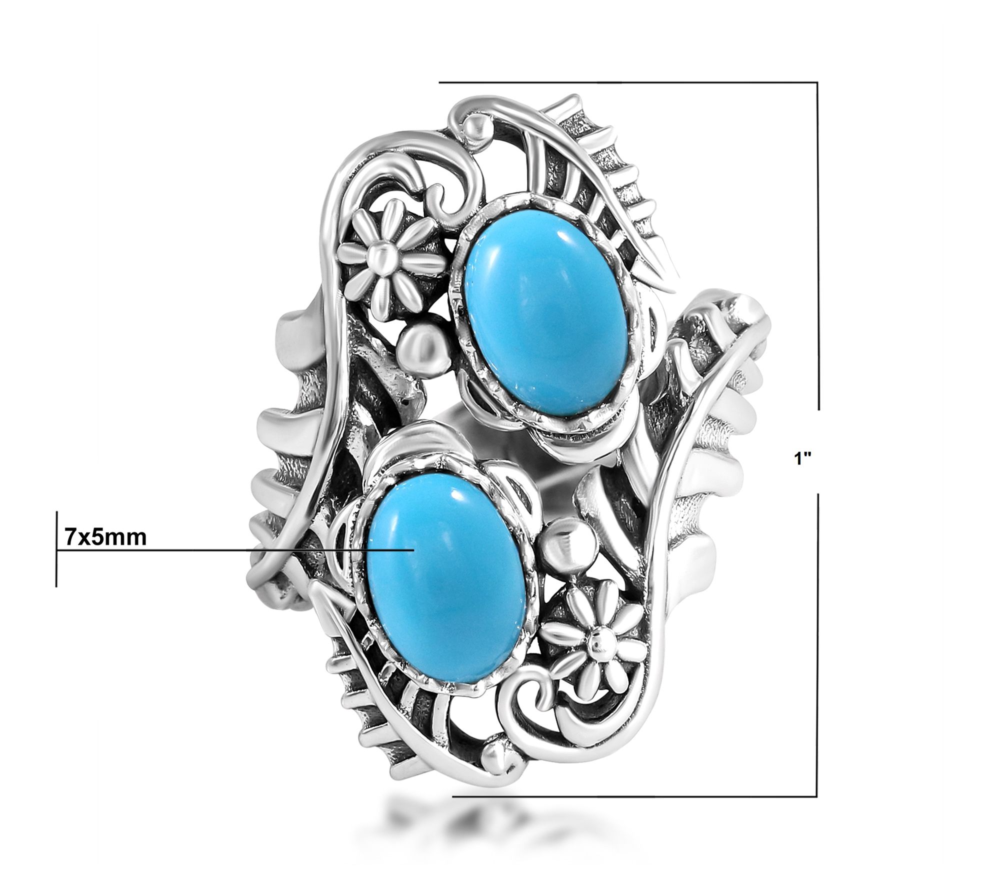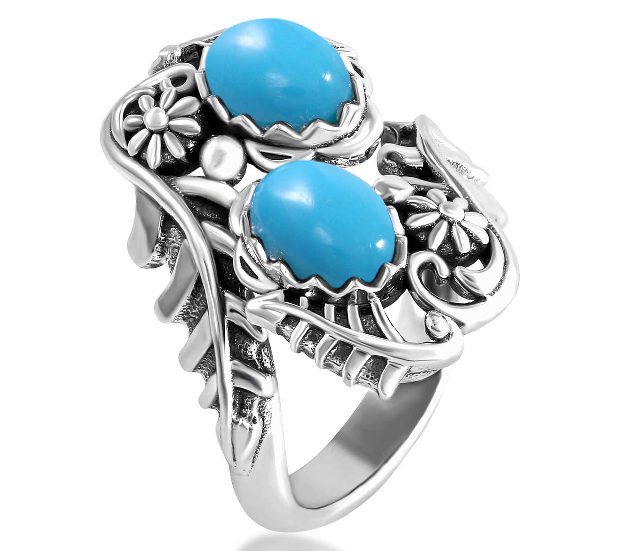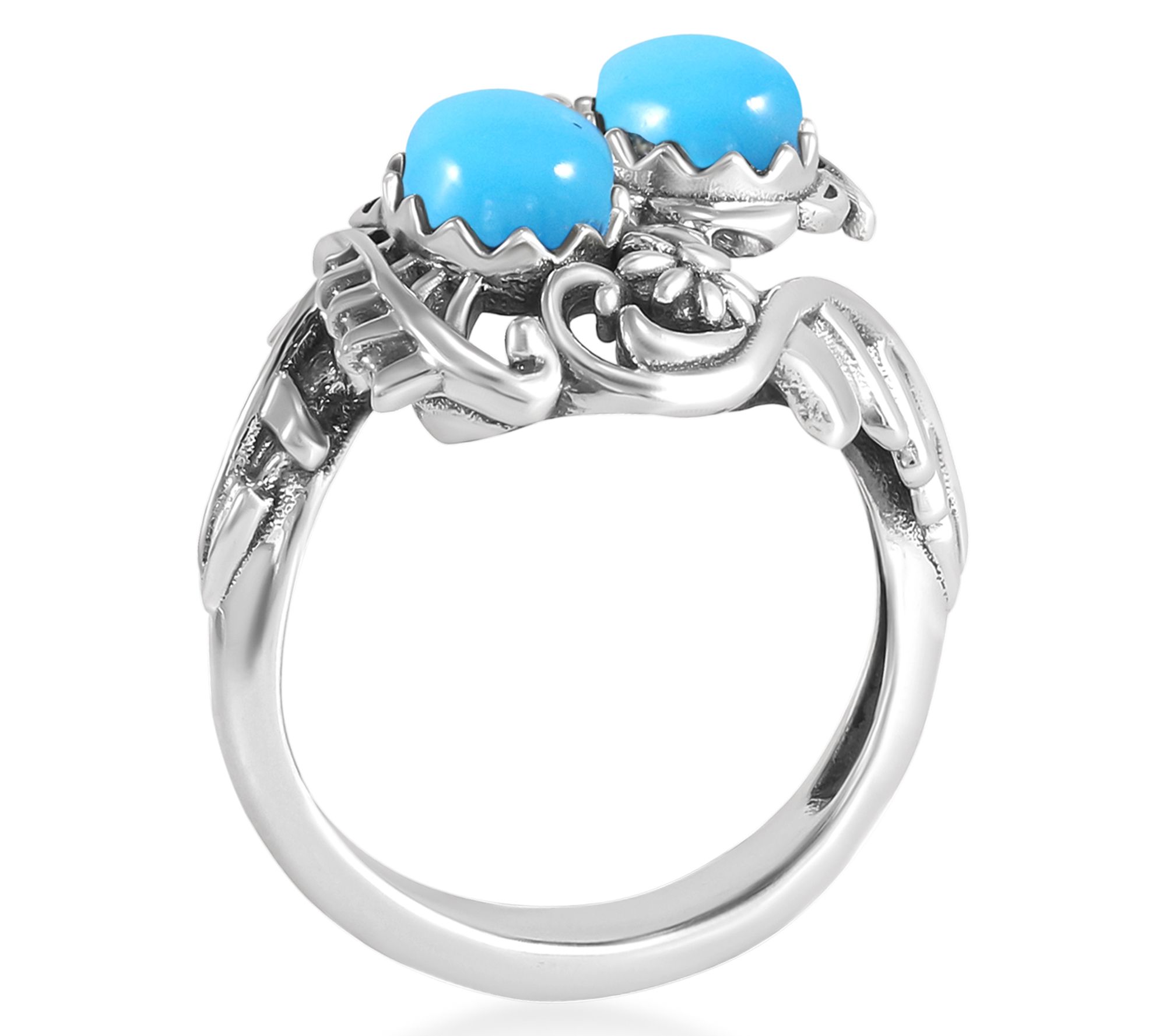 Draw inspiration from the vibrant spirit of the Southwest every time you slip on this eye-catching bypass ring. Sterling silver vines gracefully wrap around smooth, oval Sleeping Beauty turquoise cabochons, creating a look that stands out at brunch, special occasions, or everyday adventures. Styled with oxidized touches, it's a piece that's always ready for your favorite jeans or little black dress. From American West Jewelry.