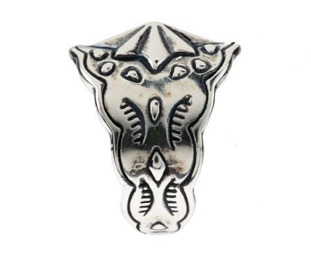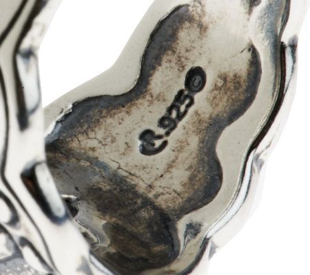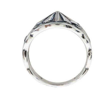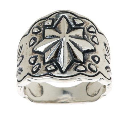 • Highly polished band ring; raised star design in center; etched designs along shank; oxidized finish