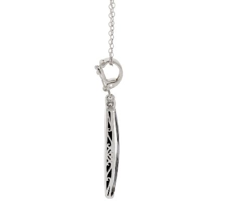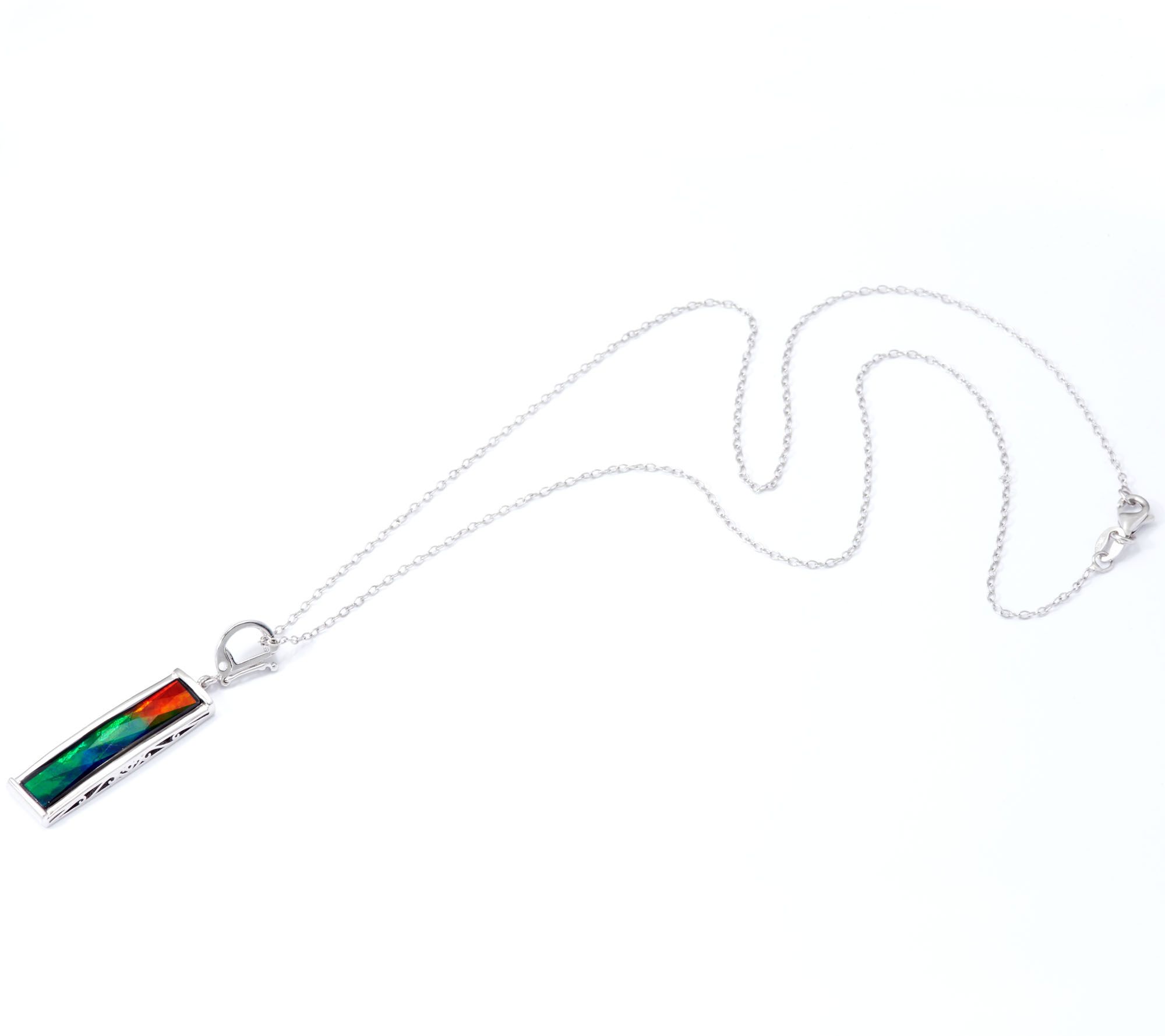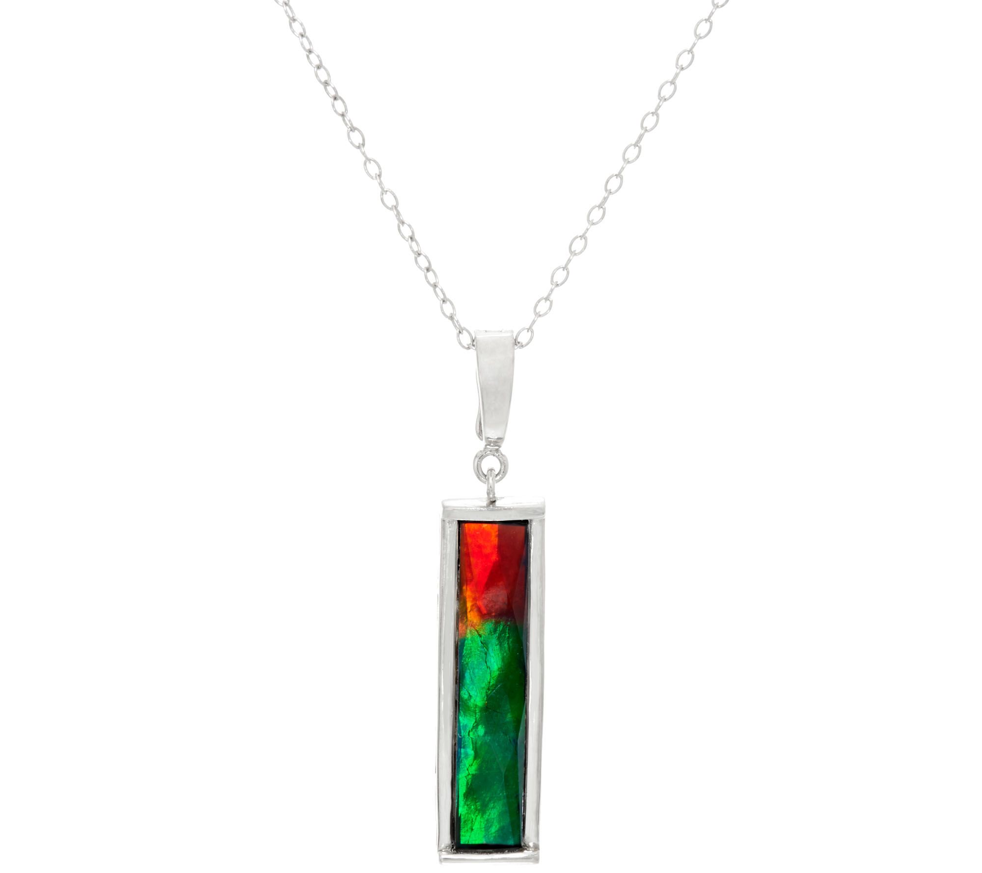 Colors so incandescent. The ammolite triplet featured in this elongated sterling silver pendant glows with a rainbow of rich color. Suspended by a rolo link chain, it's a vibrant piece you can wear with any ensemble.