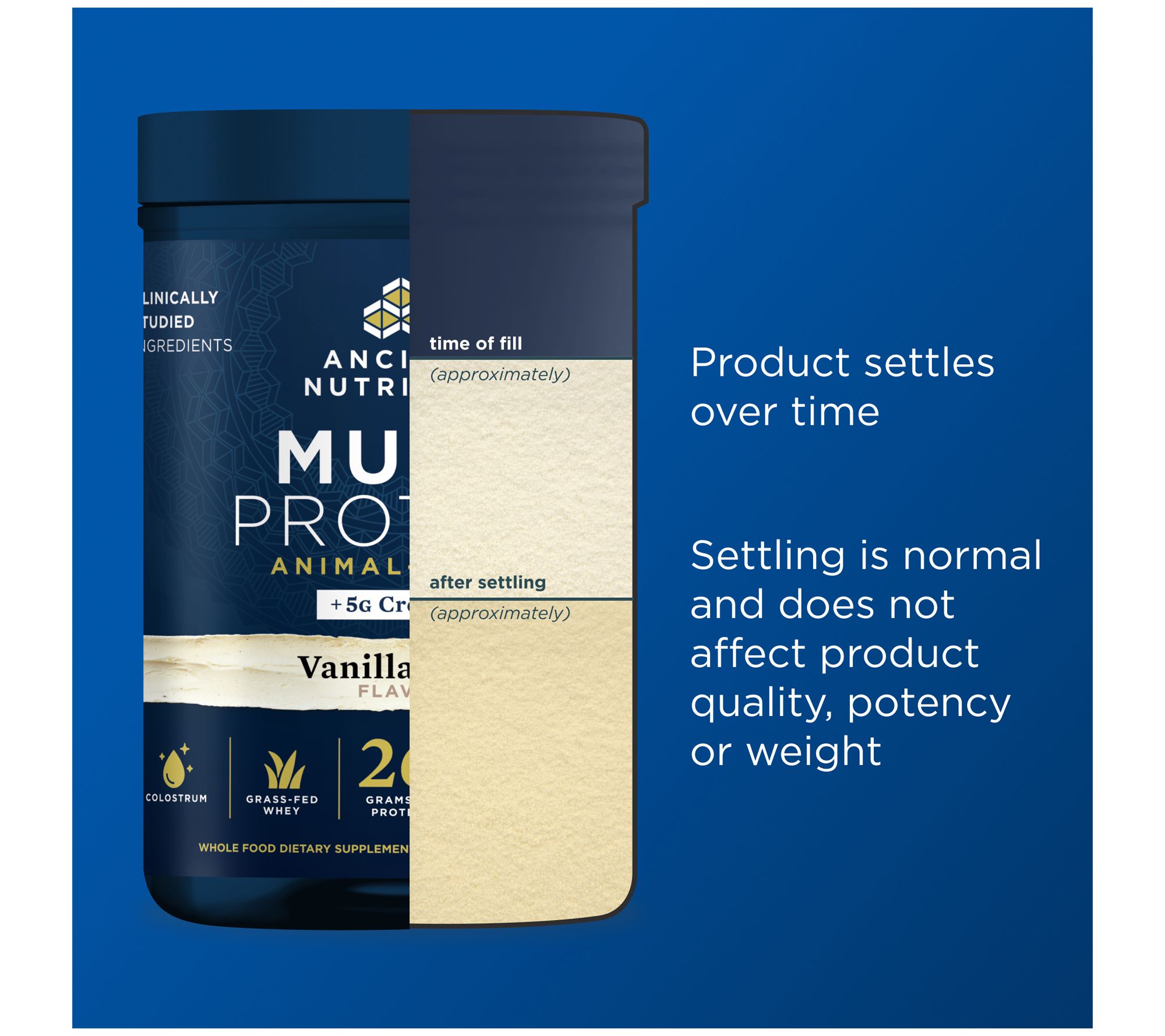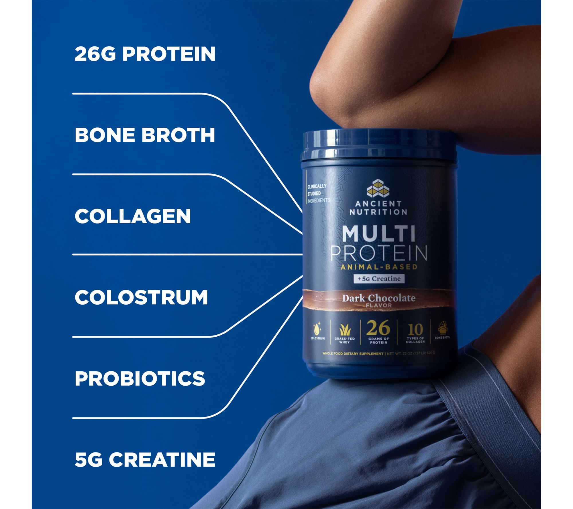 Whey protein, bone broth, collagen peptides, colostrum, and 5g of creatine monohydrate in every scoop