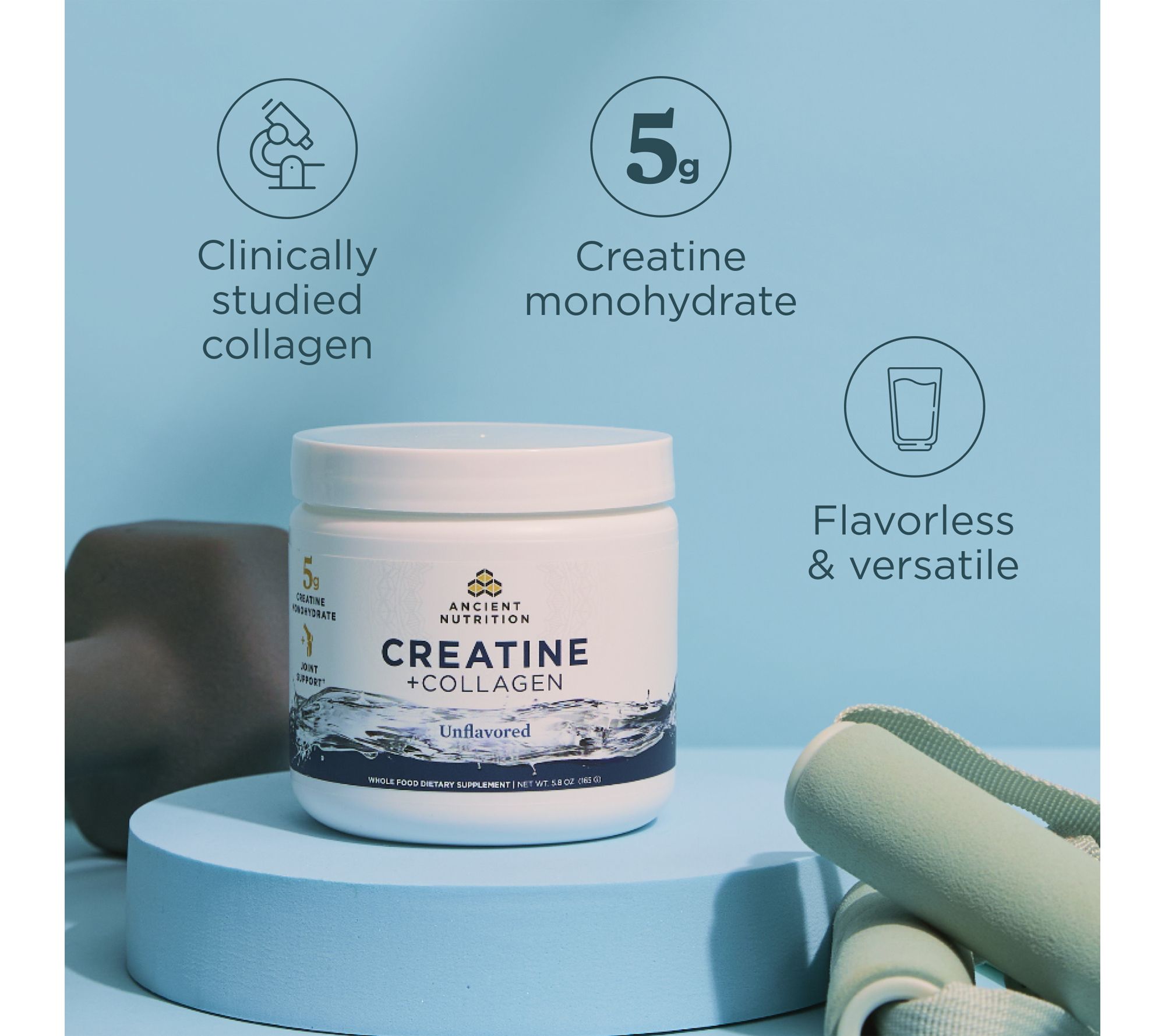 Power through your workouts and daily routines with Creatine + Collagen, a formula that combines five grams of creatine monohydrate with fermented eggshell membrane collagen. Creatine is a substance found naturally in muscle cells that helps your muscles produce energy. Daily ingestion of eggshell membrane collagen has been shown to help support healthy joints. From Ancient Nutrition.