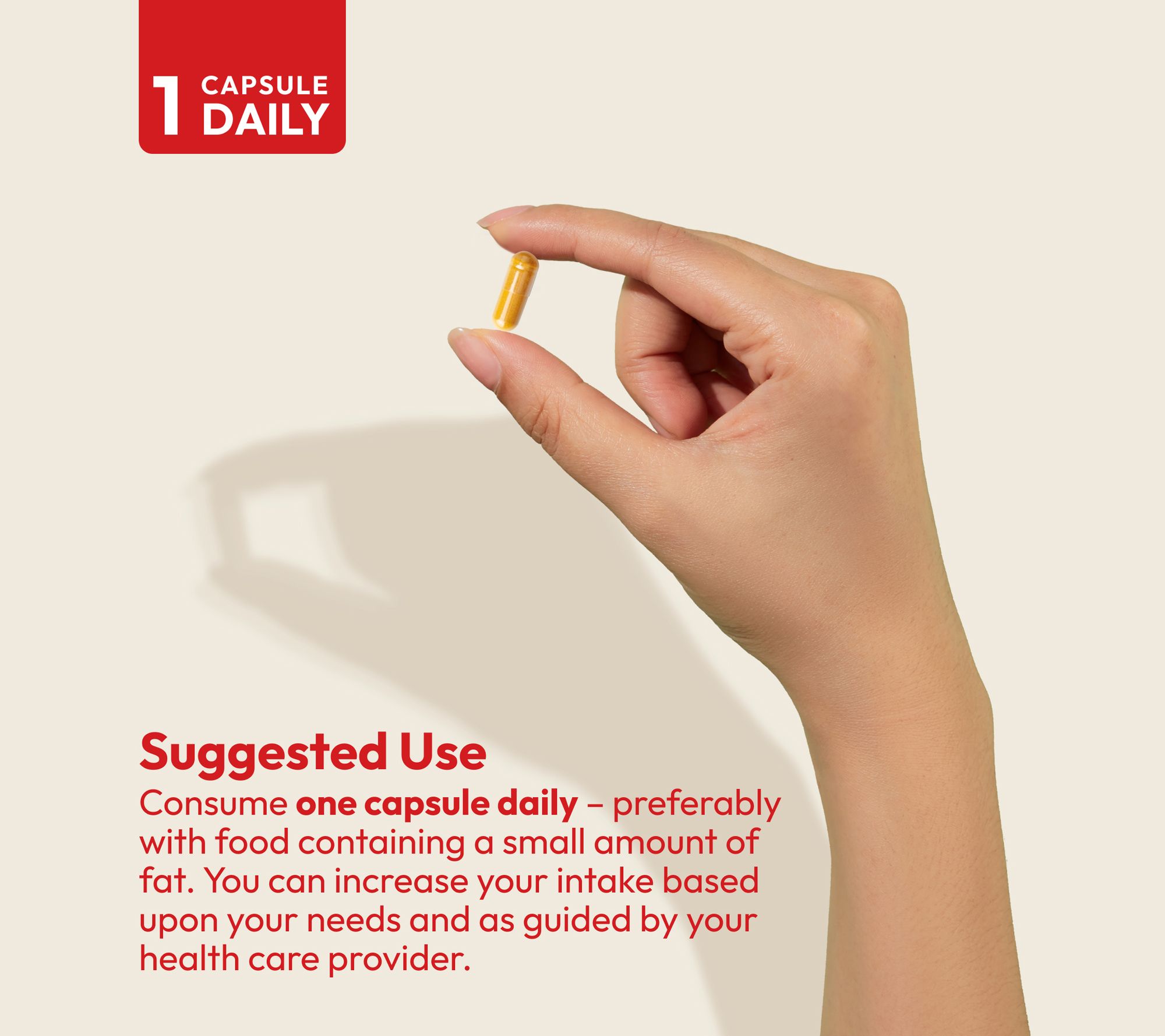 How do I use it: Consume one capsule daily -- preferably with food containing a small amount of fat. You can increase your intake as required or as guided by your physician.