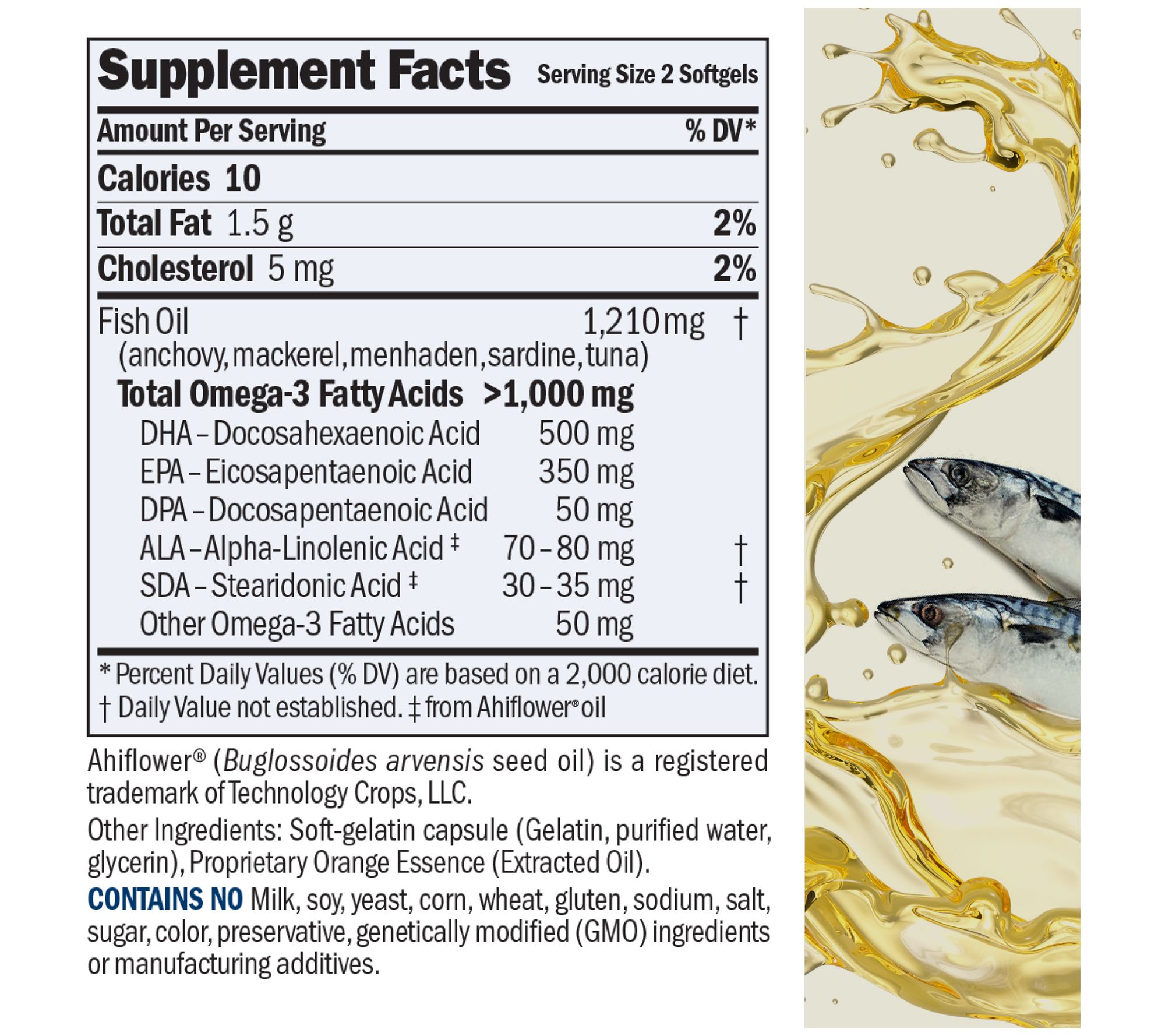 Maximum Essential Omega-3 delivers an ultra-concentrated, but mild blend of DHA (Docosahexaenoic Acid), EPA (Eicosapentaenoic Acid) and DPA (Docosapentaenoic Acid), as well as SDA (Stearidonic Acid) from Ahiflower Oil -- its richest natural source. Typical Omega-3 formulas focus on EPA, which is less costly to provide, whereas these Omega-3s target vital DHA, which is essential for brain, eye, and heart structure and function.