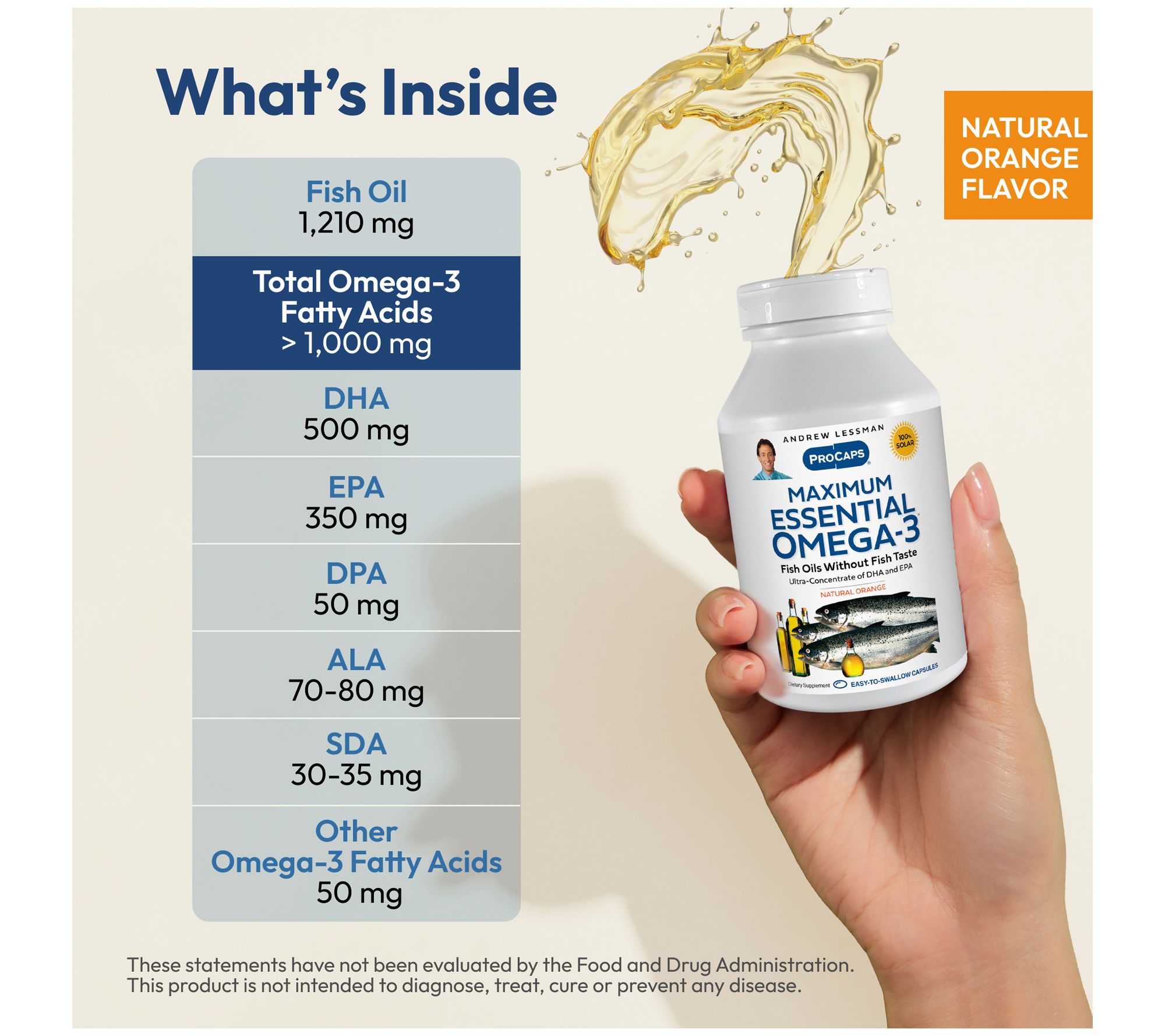 Andrew Lessman's Maximum Essential Omega-3 is a high-potency blend of ultra-pure Omega-3s uniquely delivered with absolutely no fishy aftertaste. These Omega-3s exist in their most active, natural triglyceride form and not as inferior, synthetic ethyl esters.