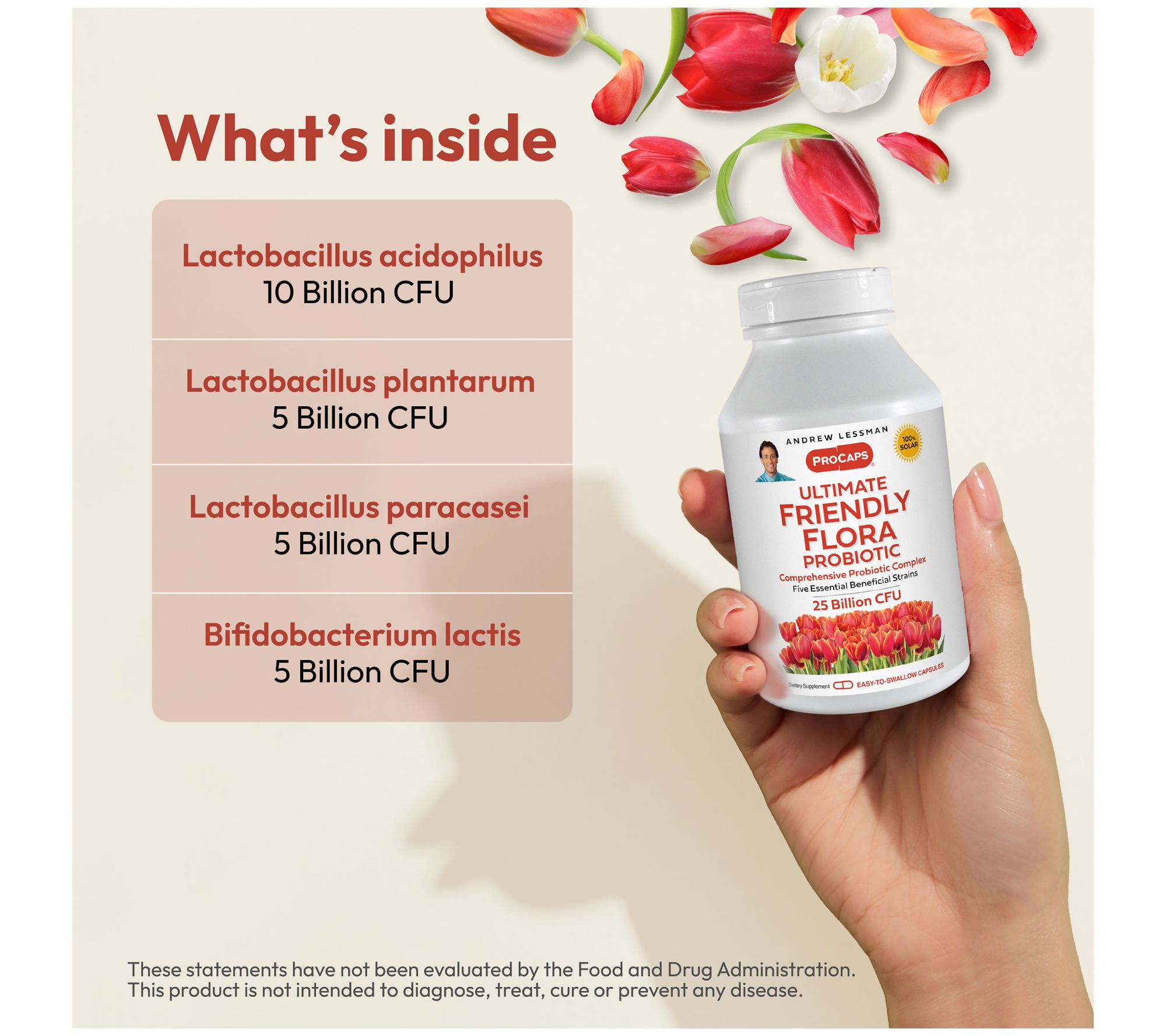 Andrew Lessman's Ultimate Friendly Flora is a comprehensive blend of five established, beneficial probiotic strains, delivering an exceptional 25 Billion Colony Forming Units (CFU) per capsule.