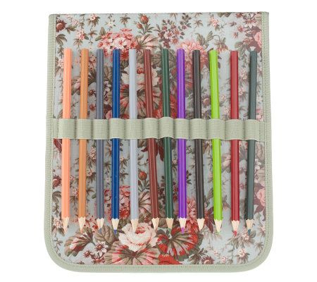 Wet or dry, these professional-quality watercolor pencils blend effortlessly to create a variety of colors and a beautiful design effect. They're ideal for rubber stamped or stenciled images, and work on all kinds of paper crafts. The easel-style pencil holder is done in a rose blue floral pattern with rose green stripes on the inside. From Anna Griffin.
