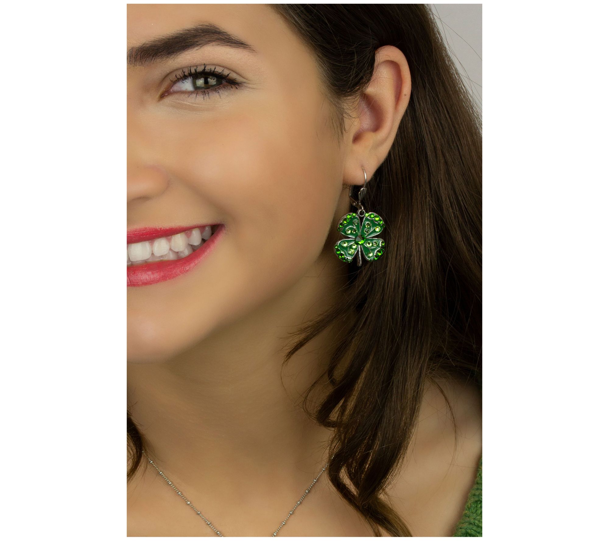 • Large four-leaf earrings with green epoxy enamel; accented with fern green and peridot green crystals