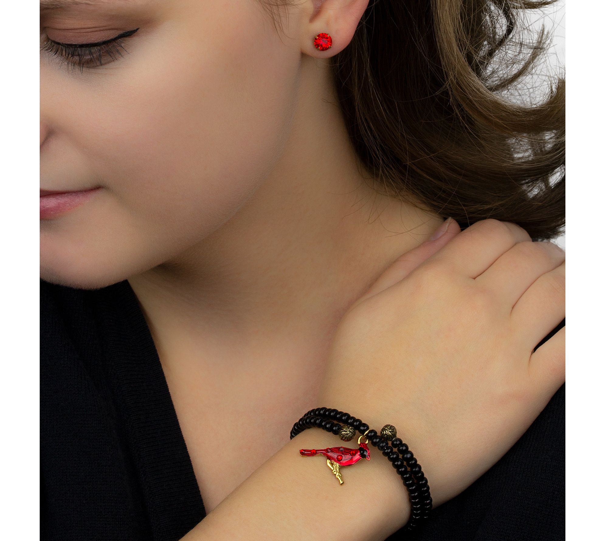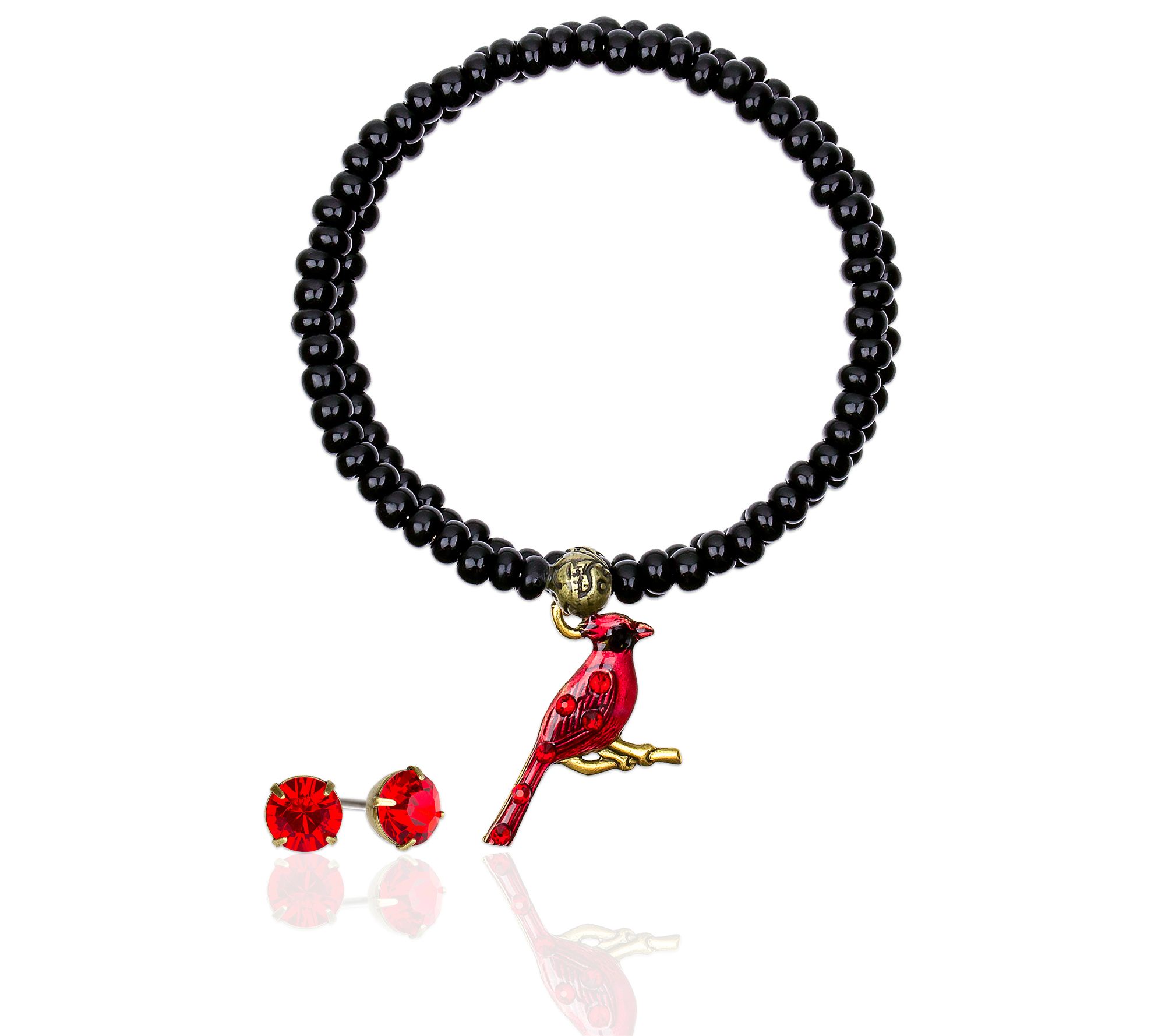 Welcome winter in style with this crystal cardinal bracelet and studs set. From Anne Koplik Designs.