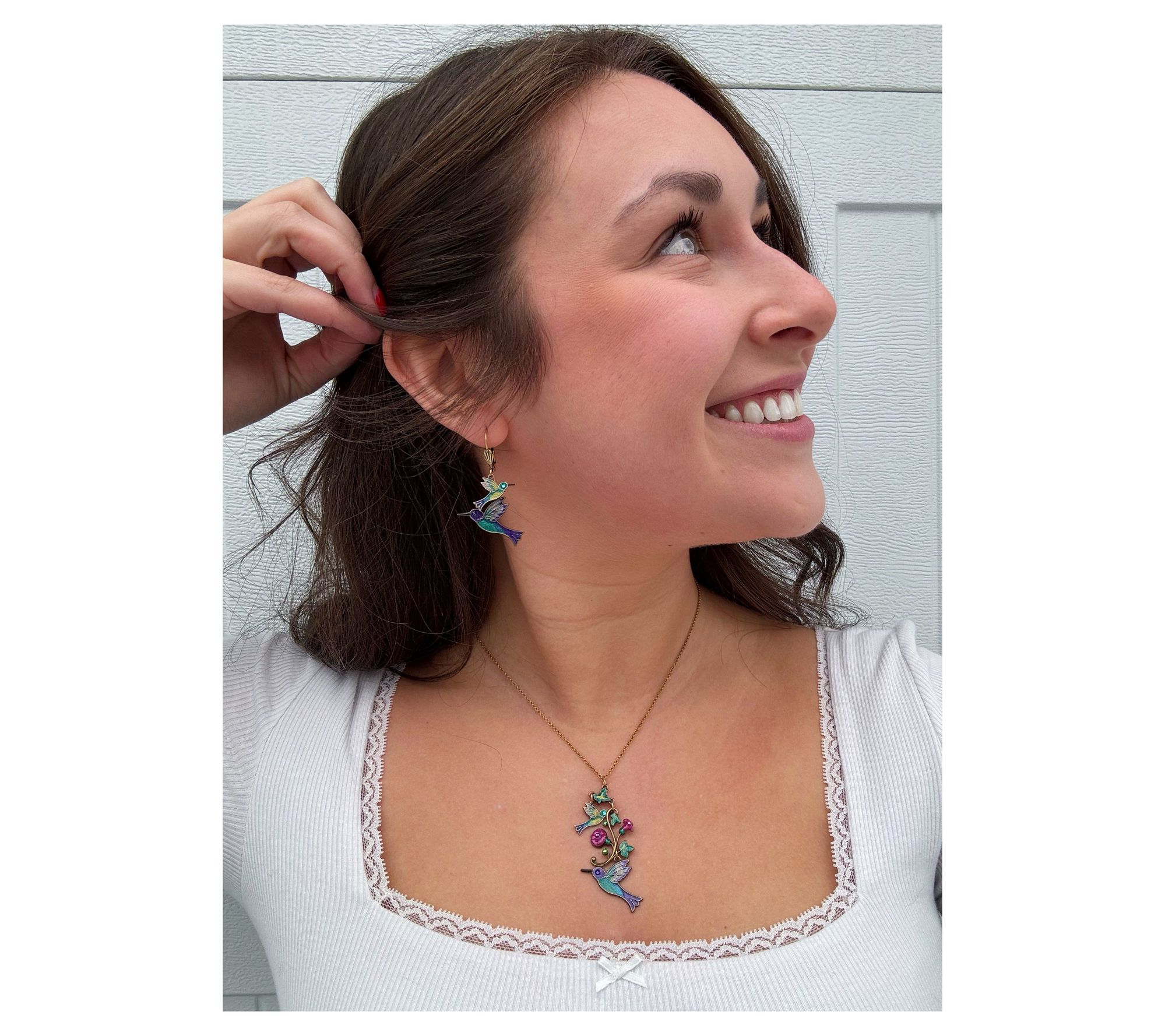 • Hummingbirds with green, blue, purple, and gold enamel; accented with purple and teal crystals