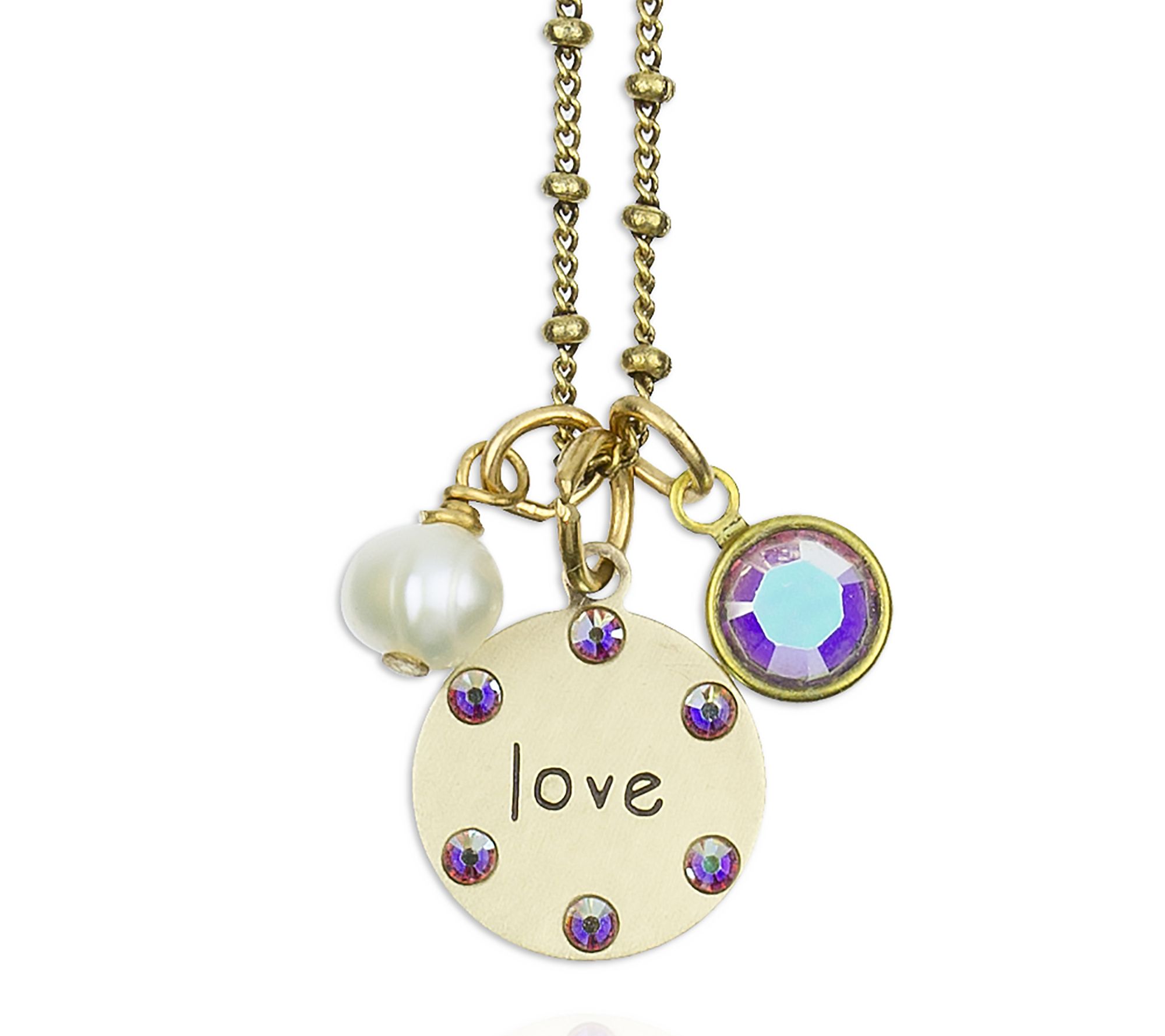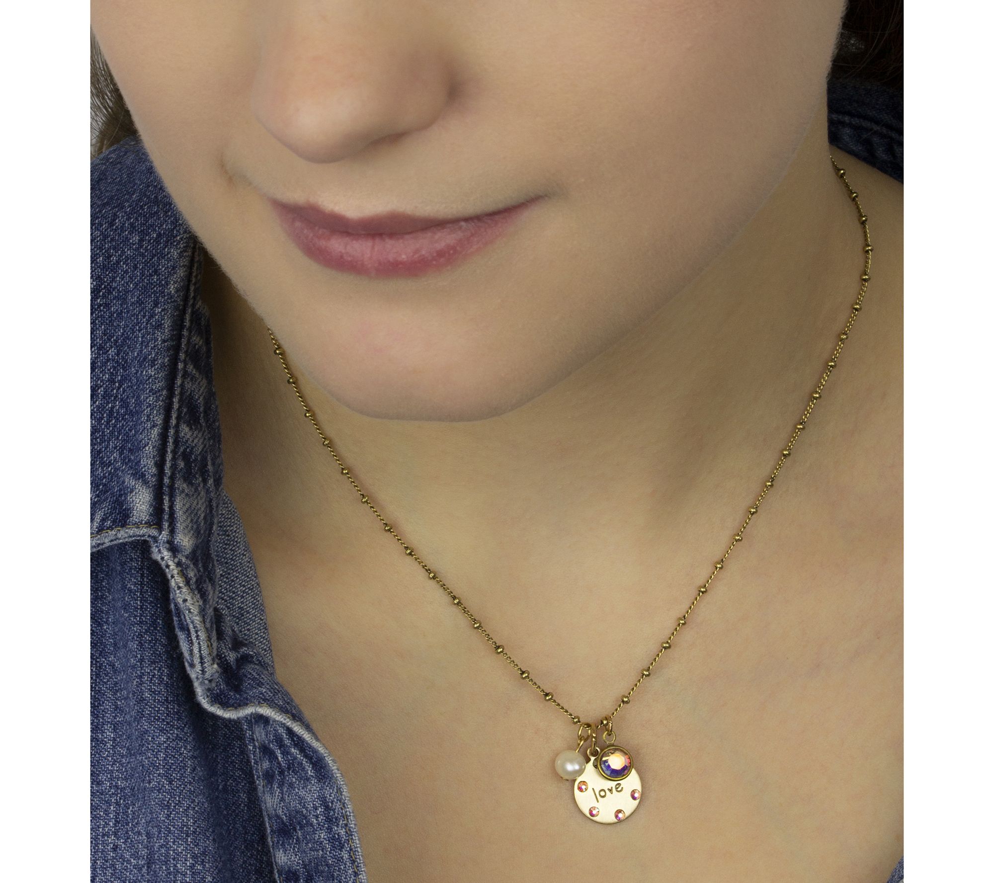 • Three charms; one disc charm with love and crystal accents; charm with iridescent crystal; charm with simulated pearl bead; cable link chain with beaded stations