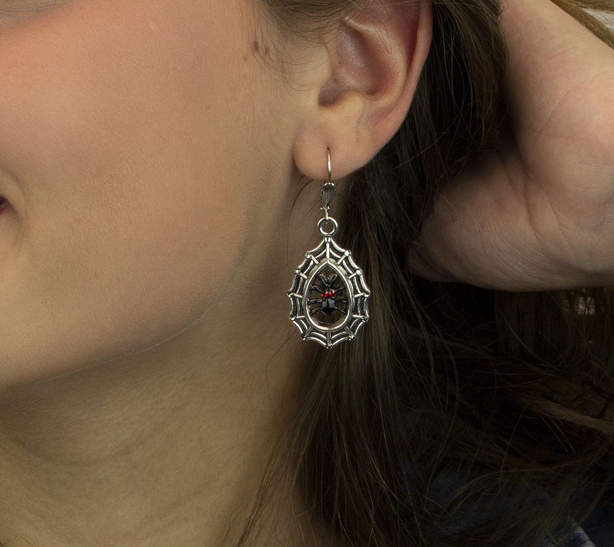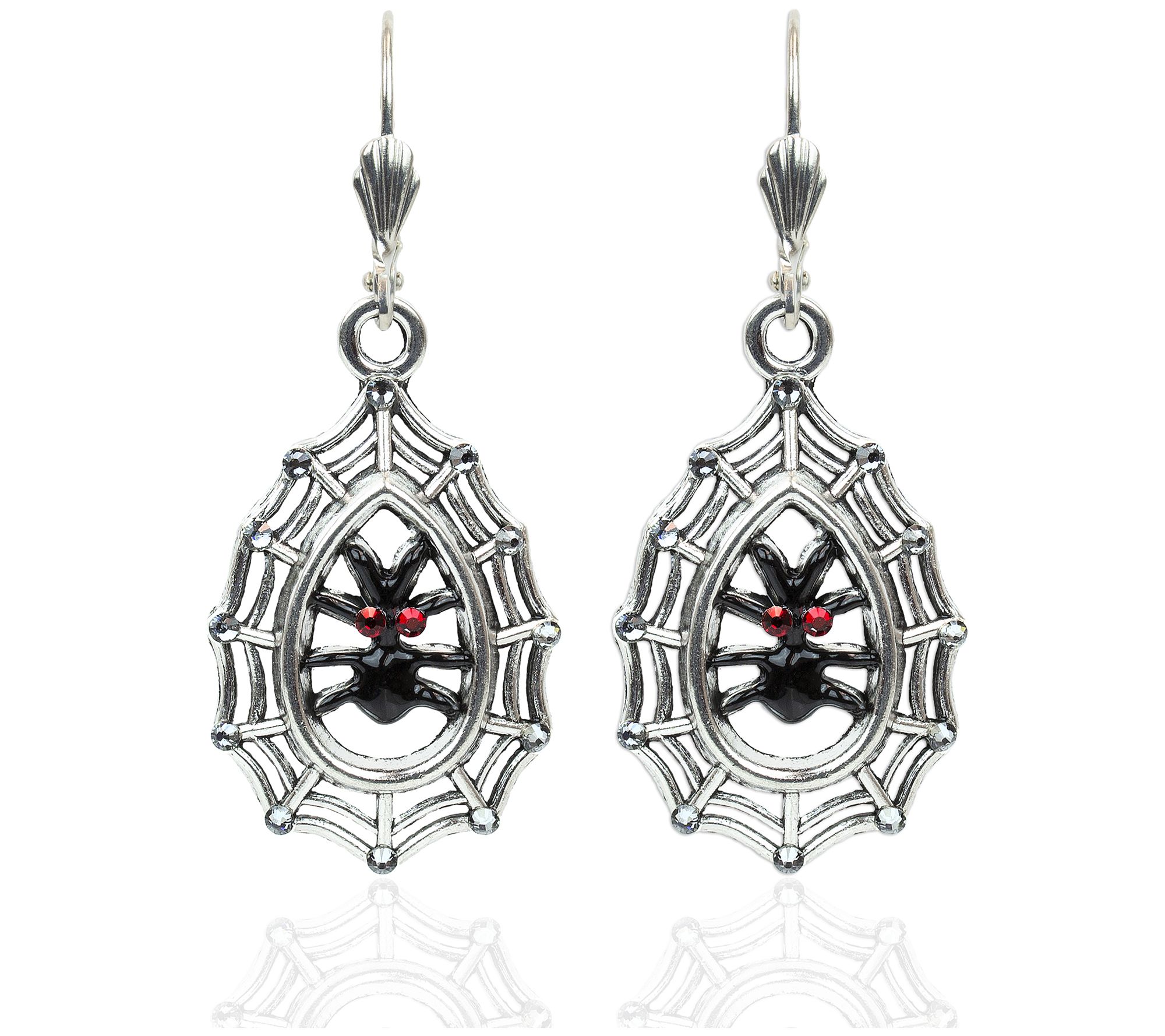 • Web earrings with black painted enamel spiders topped with red crystal eyes and gray crystal accents on the web