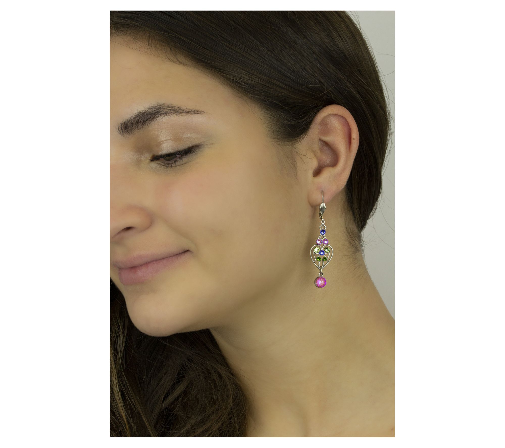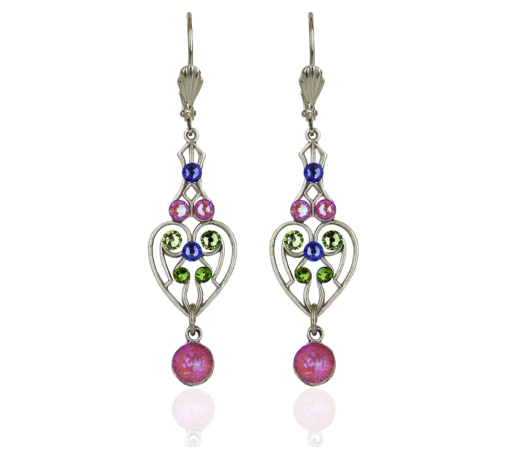Want to brighten up your look? These antique-inspired earrings are accented with brilliant pink, blue, and green crystals for a dazzling touch of color. From Anne Koplik Designs, Inc.