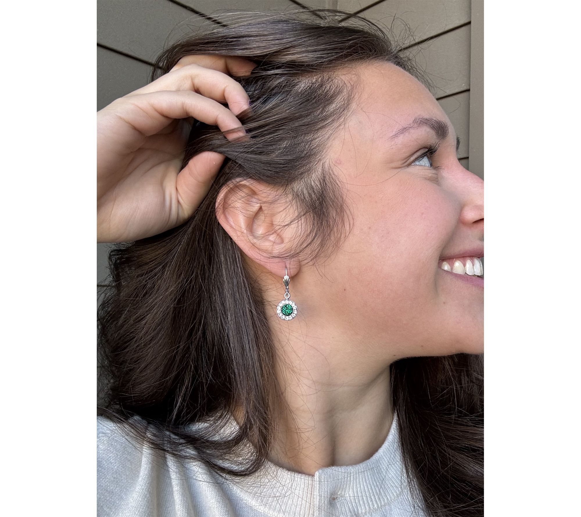 Turn heads with these dazzling dangle earrings featuring a bold emerald green simulated crystal, beautifully framed by sparkling clear simulated crystals. The silvertone halo design adds a touch of glamour to any evening out, while the lever back closure ensures comfortable wear from dinner parties to special celebrations. From Anne Koplik.