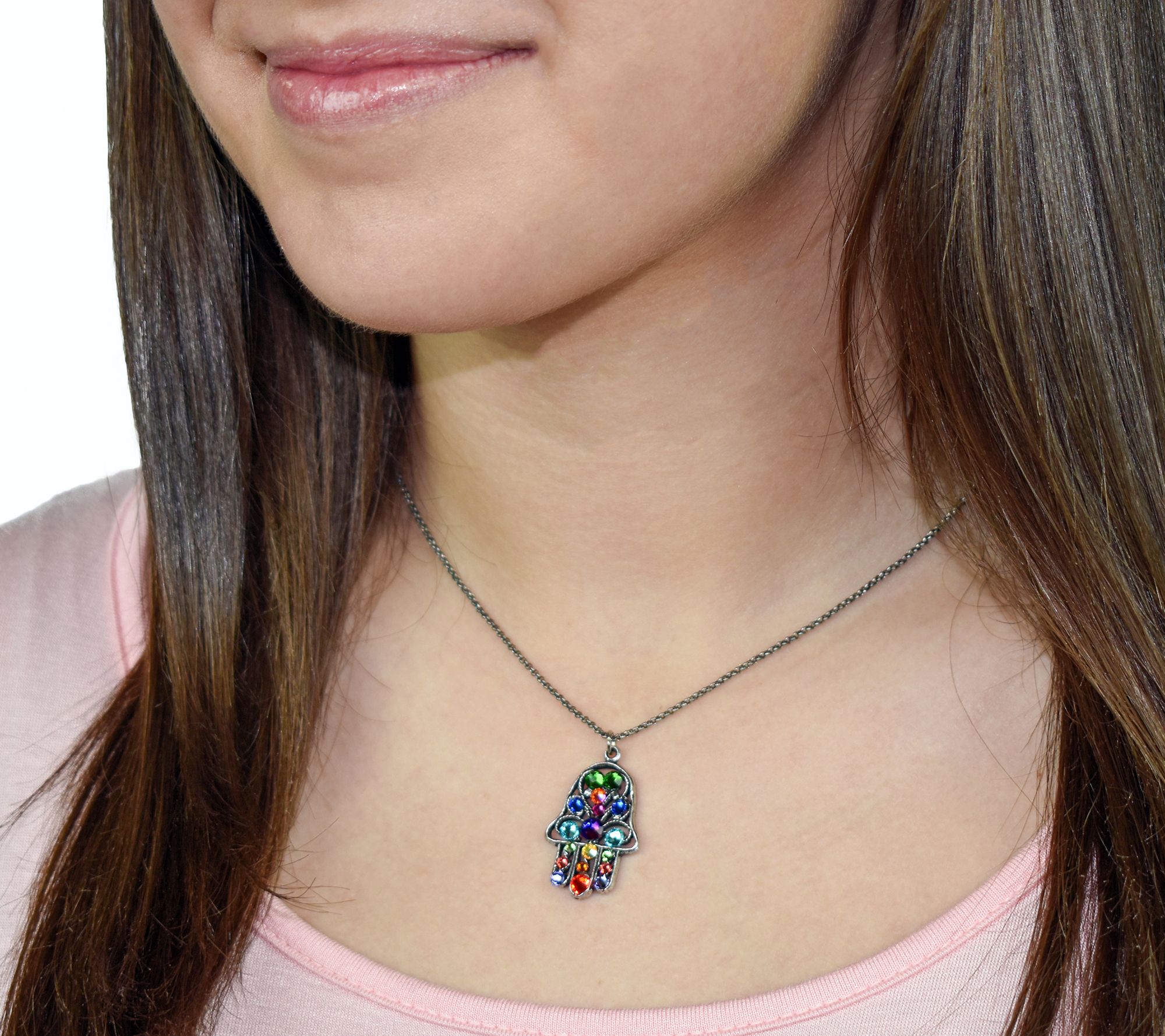• Filigree hamsa pendant embellished with green, orange, yellow, red, purple, and blue Swarovski crystals; logo charm
