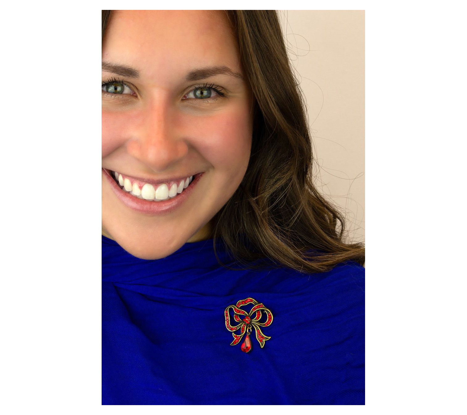 • Antiqued goldtone bow design; red brilliant crystal embellishments; brilliant teardrop-shaped red crystal