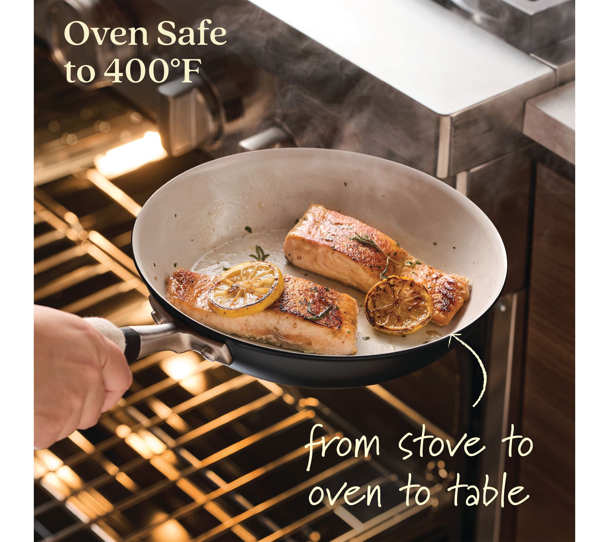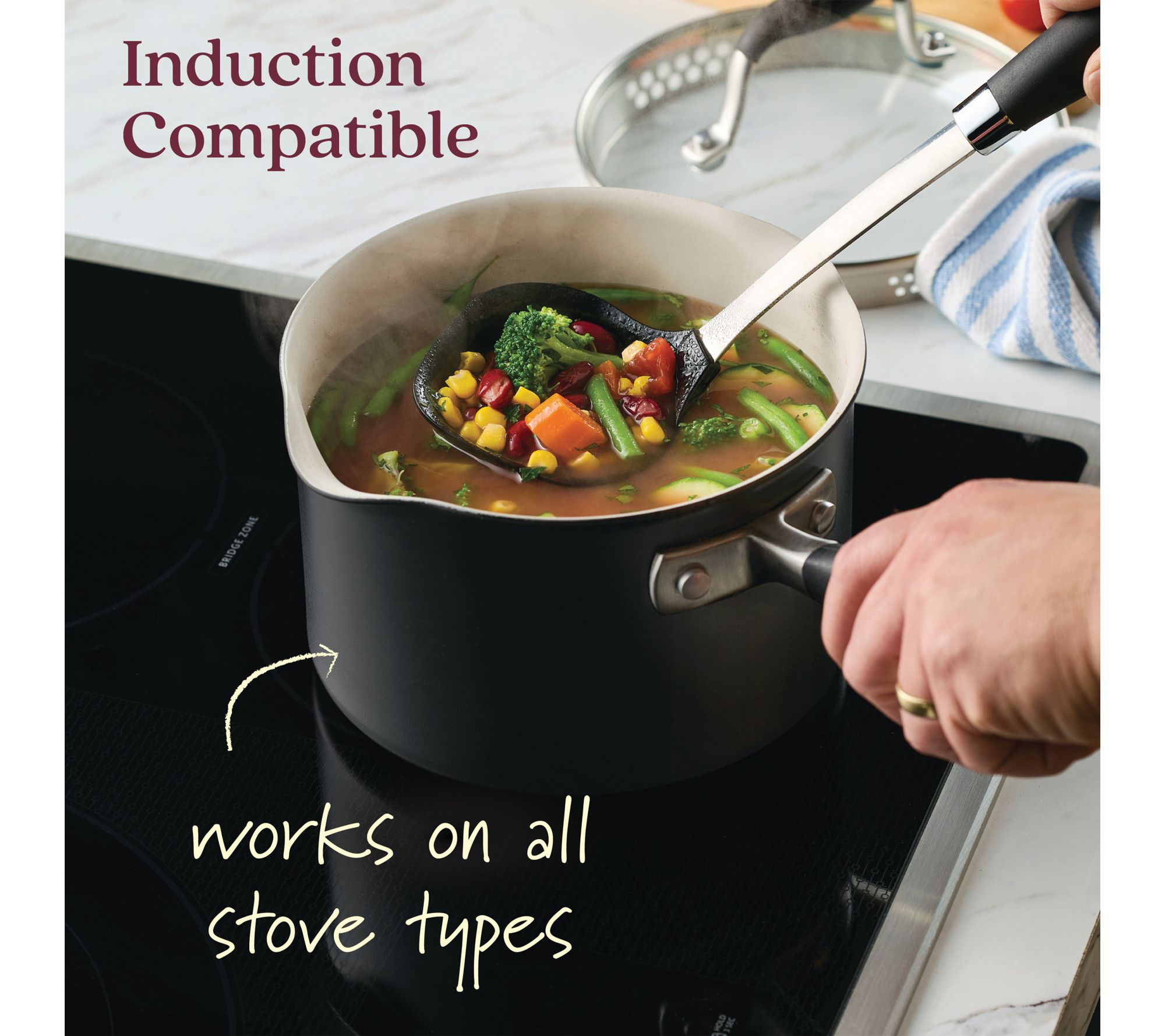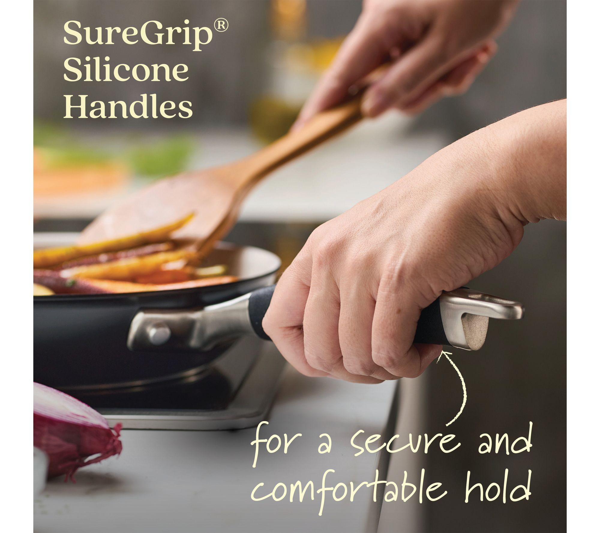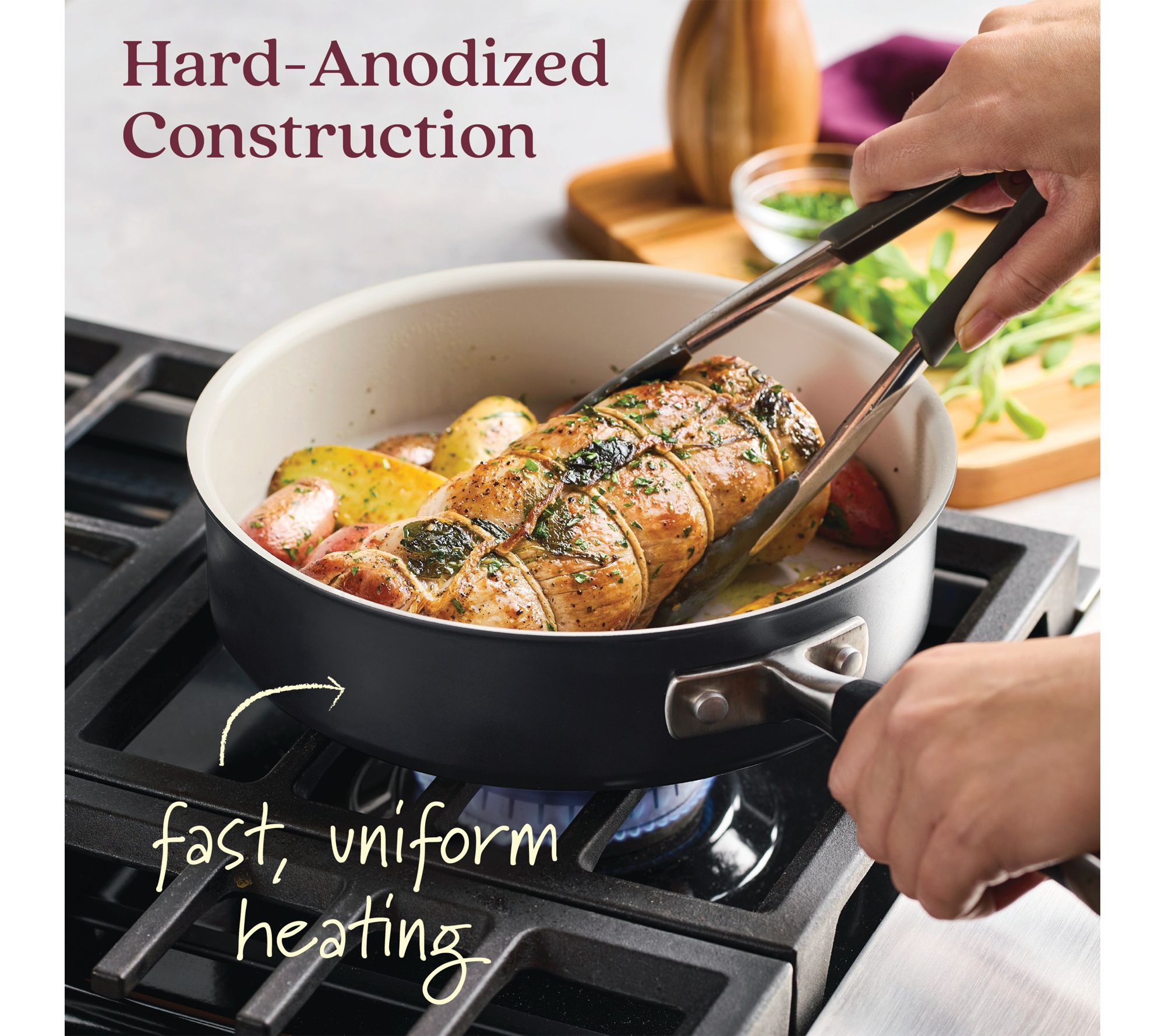 Prepare family meals that impress or whip up a quick lunch with this nine-piece nonstick cookware set. Generous in variety and crafted for easy food release, each pan features a ceramic interior and a hard-anodized aluminum base for confident, consistent results. Cleanup is refreshingly simple so you can spend more time enjoying delicious creations. From Anolon.