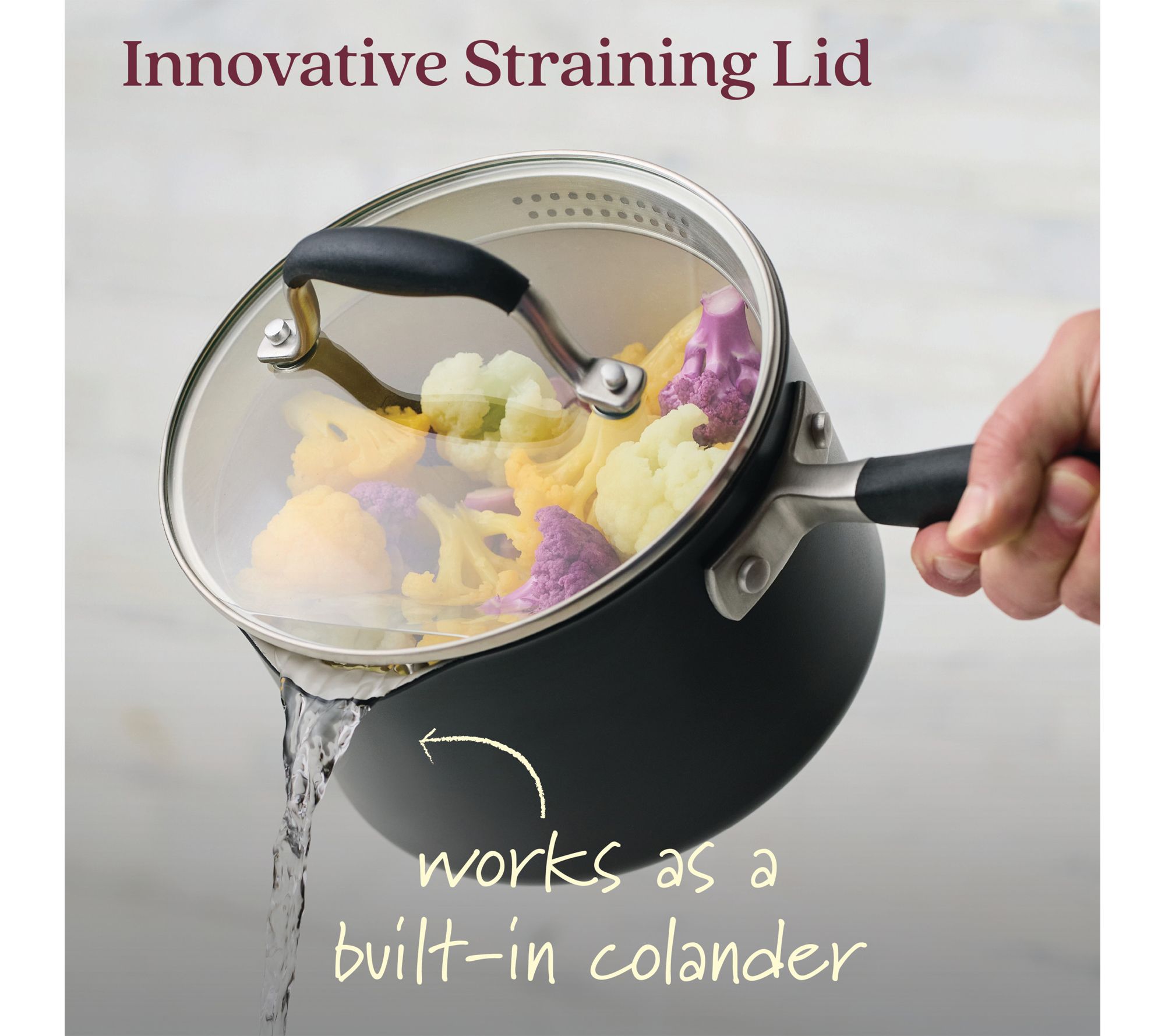 • Three-quart saucepan with pour spouts and straining lid: 14" x 8.25" x 7.5"