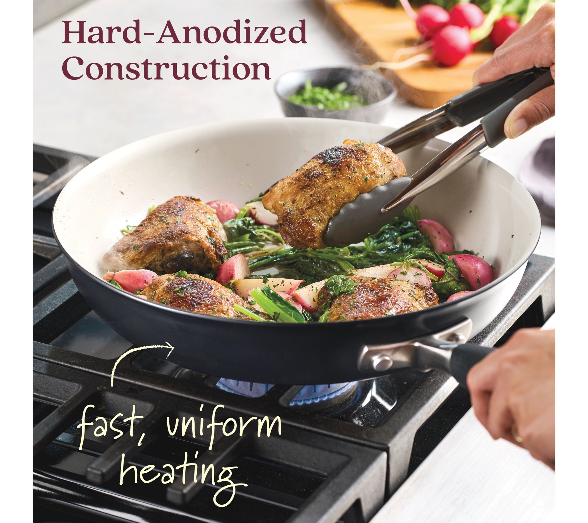 Whether you're whipping up a quick breakfast scramble or crafting a flavorful stir-fry for dinner, this nonstick frying pan helps you achieve delicious results with less effort. The ceramic surface releases food easily, making cleanup simple, while the spacious design gives you plenty of room to saute, sear, or fry. From Anolon.