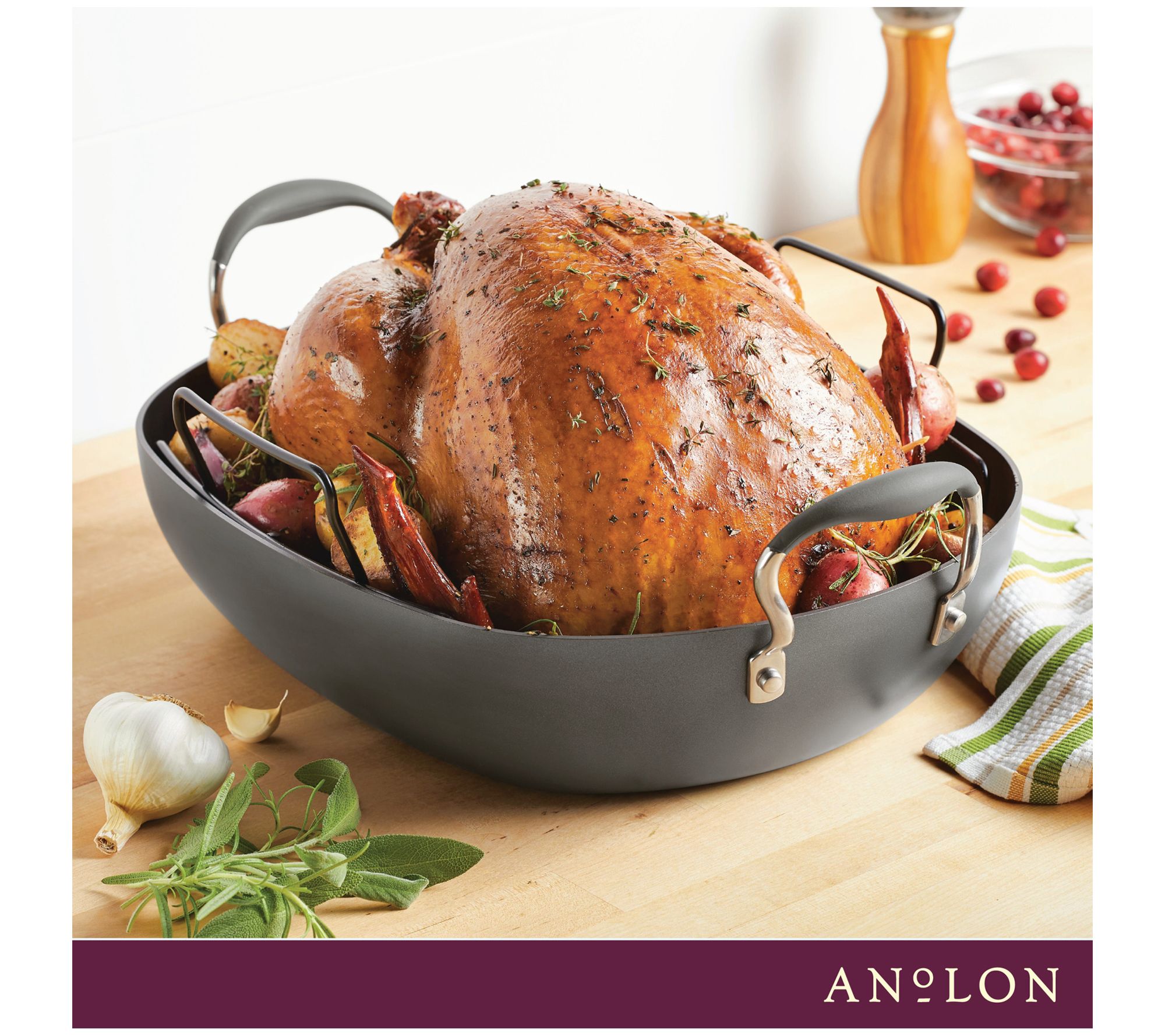 Your first step to sublime roasting starts here. Engineered for fast, uniform heating, this hard-anodized roaster with removable wire rack makes an excellent addition to any kitchen. From Anolon.
