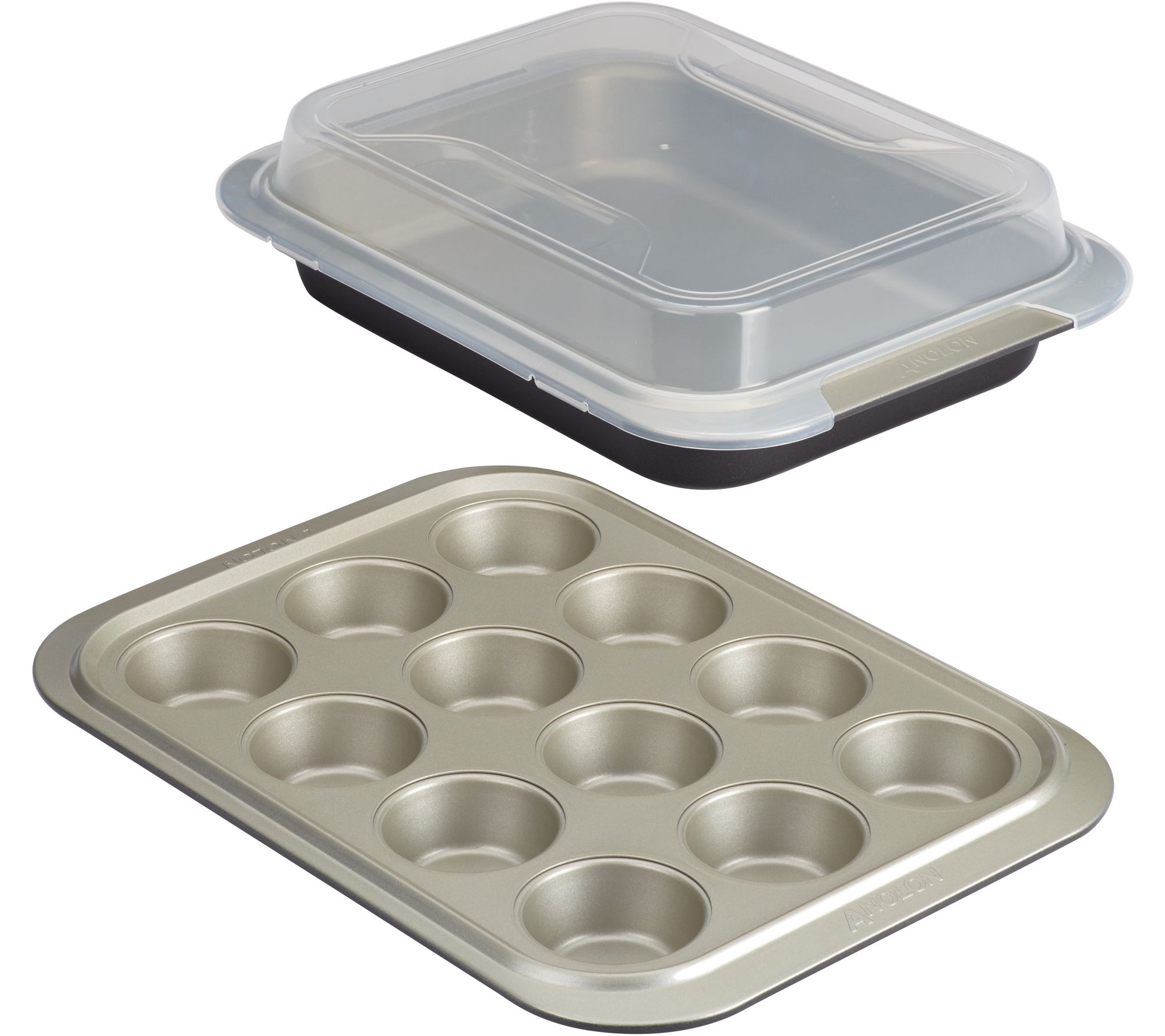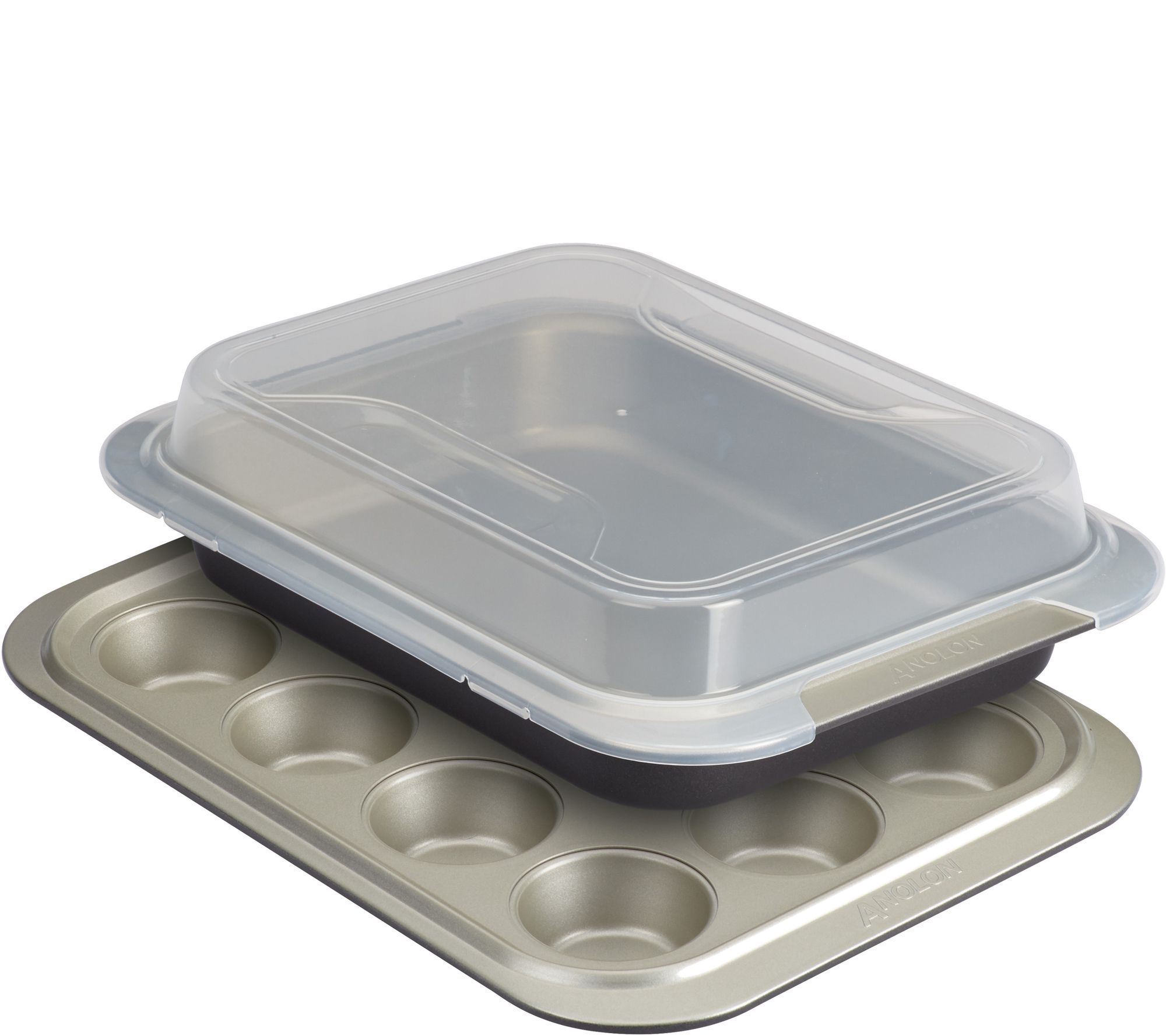 Your cakes, muffins, and cupcakes are covered with this nonstick muffin pan and rectangular cake pan set. The plastic lid snaps onto either pan. From Anolon.